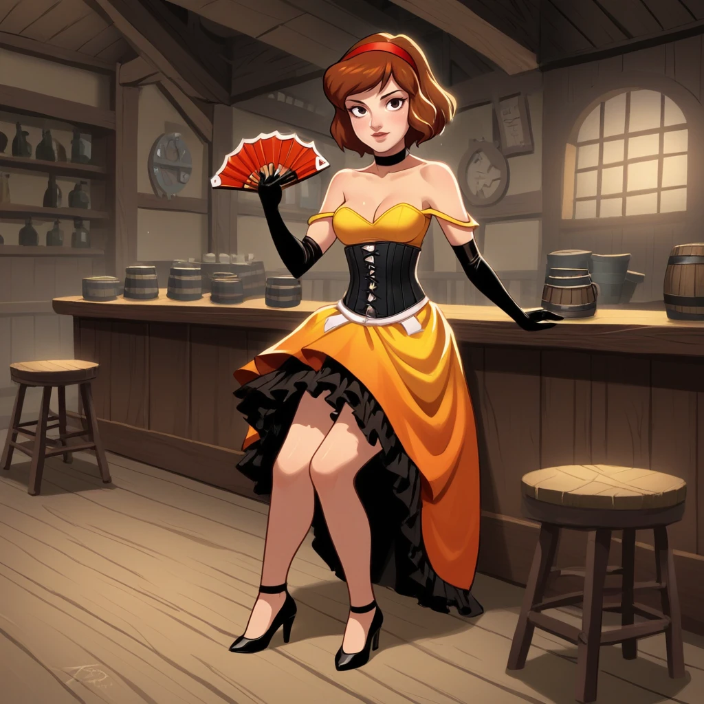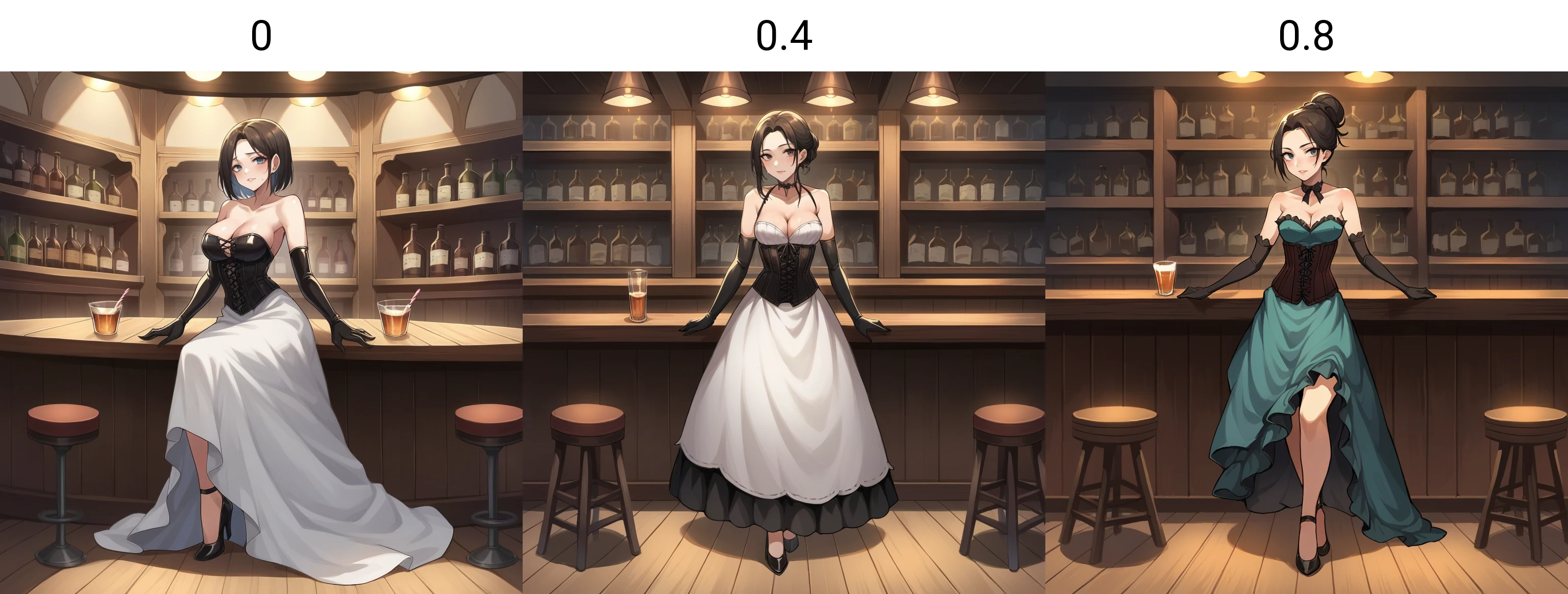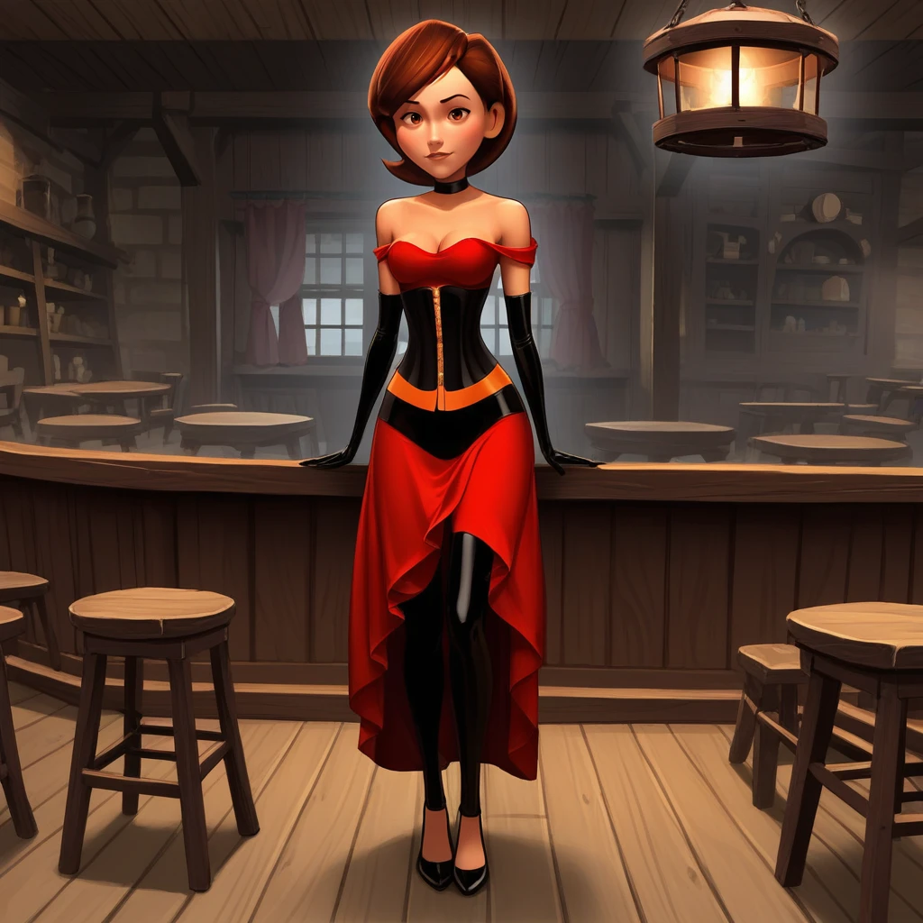 lace-trimmed dress, cleavage, bare shoulders, corset, elbow gloves, high heels