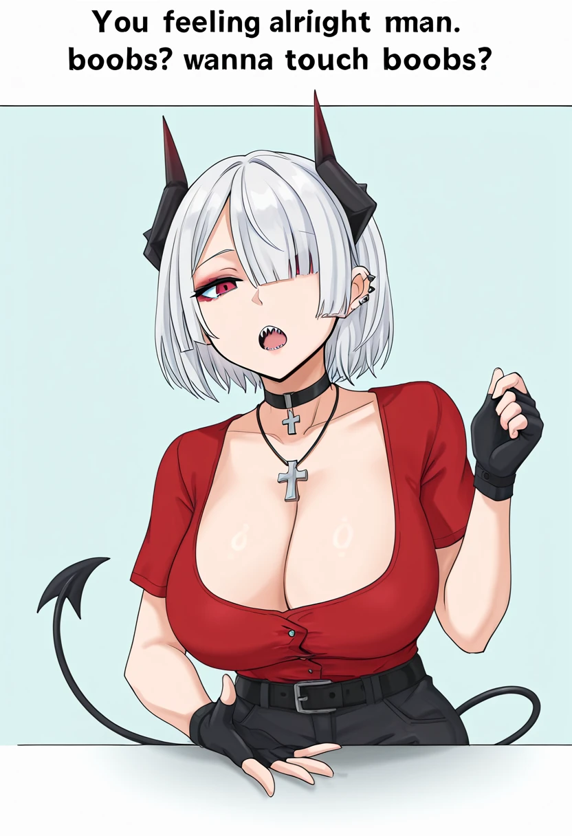 Trigger word: boobs?_wanna_touch_boobs?_(meme), text:"you feeling alright man? boobs? wanna touch boobs?", looking at viewer, cleavage,