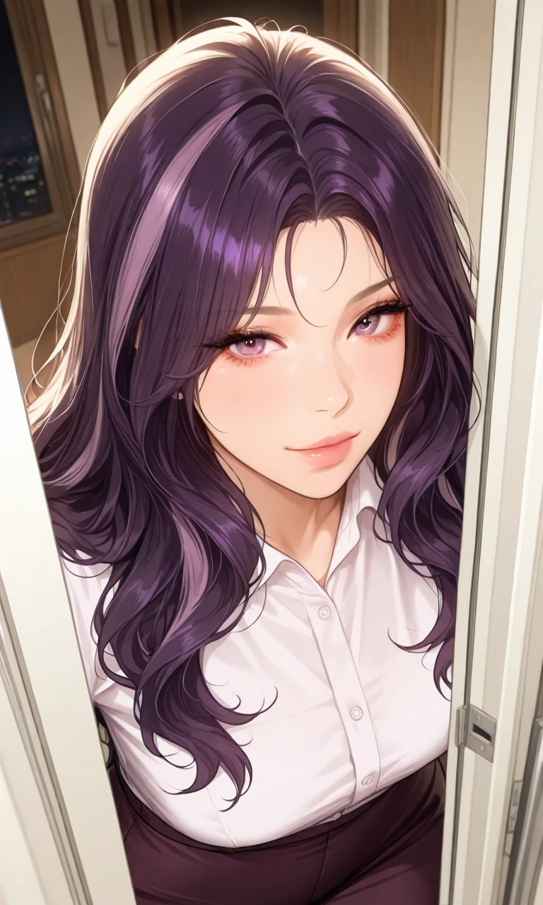 yoo, long hair, wavy hair, multicolored hair, dark purple hair