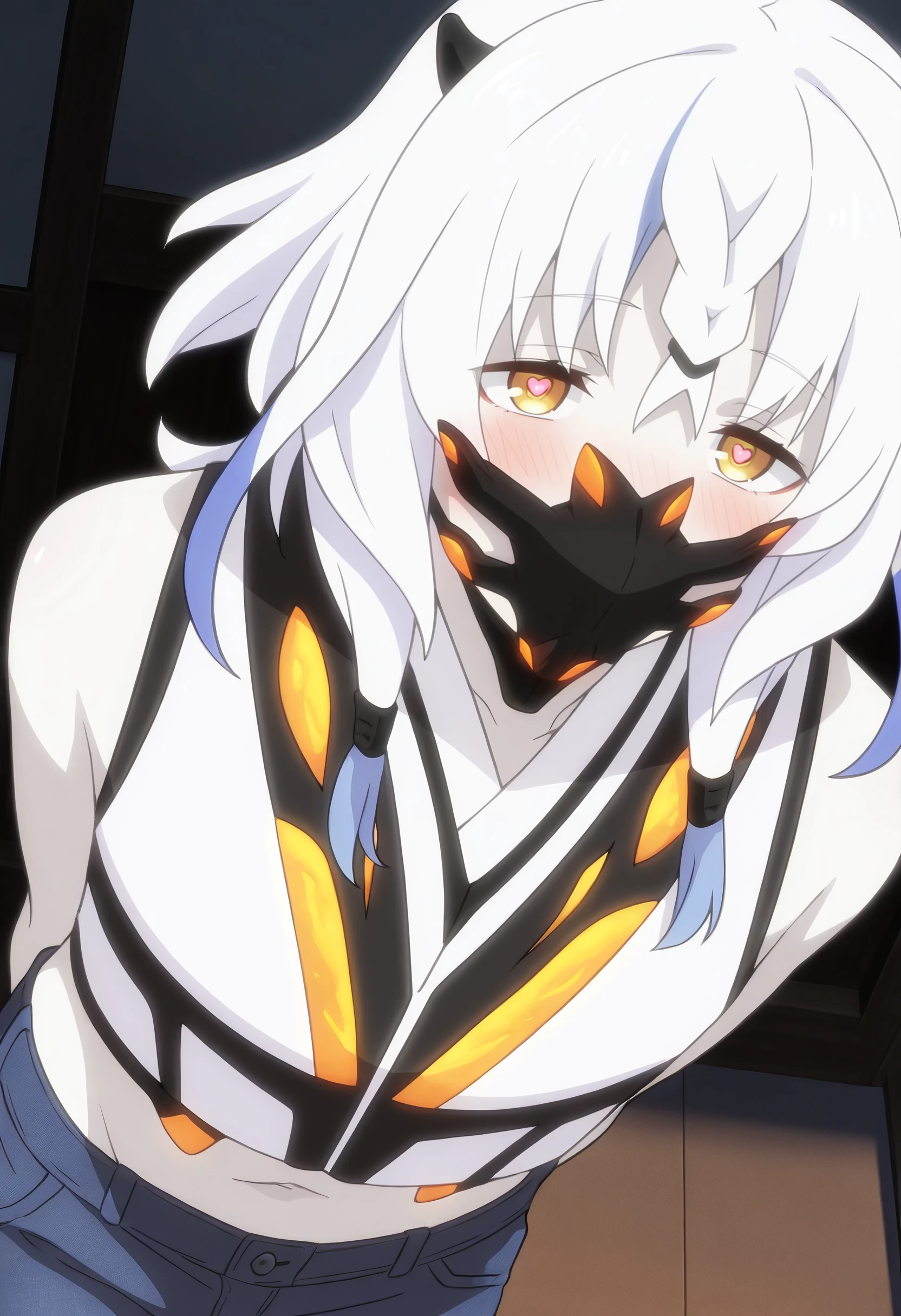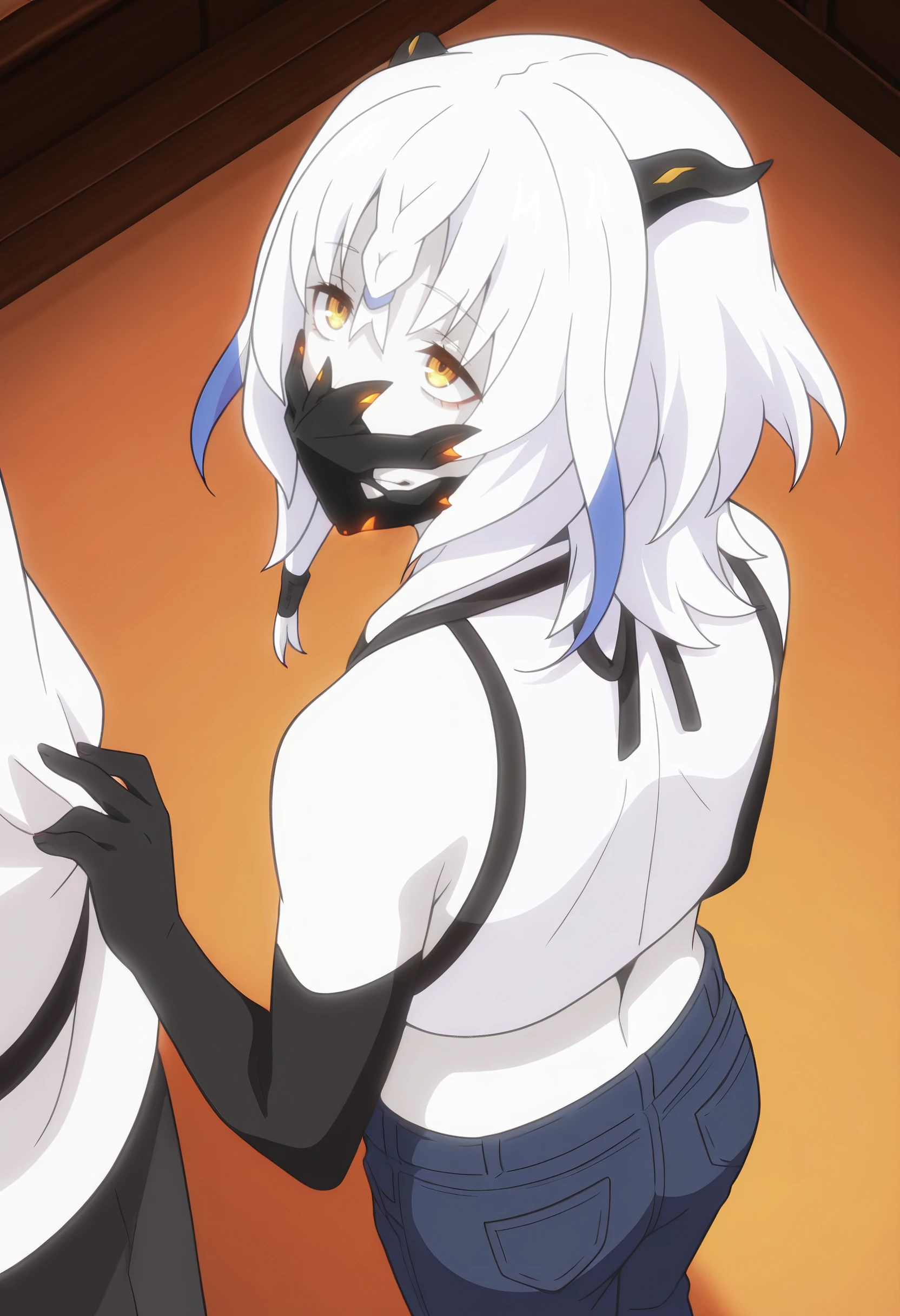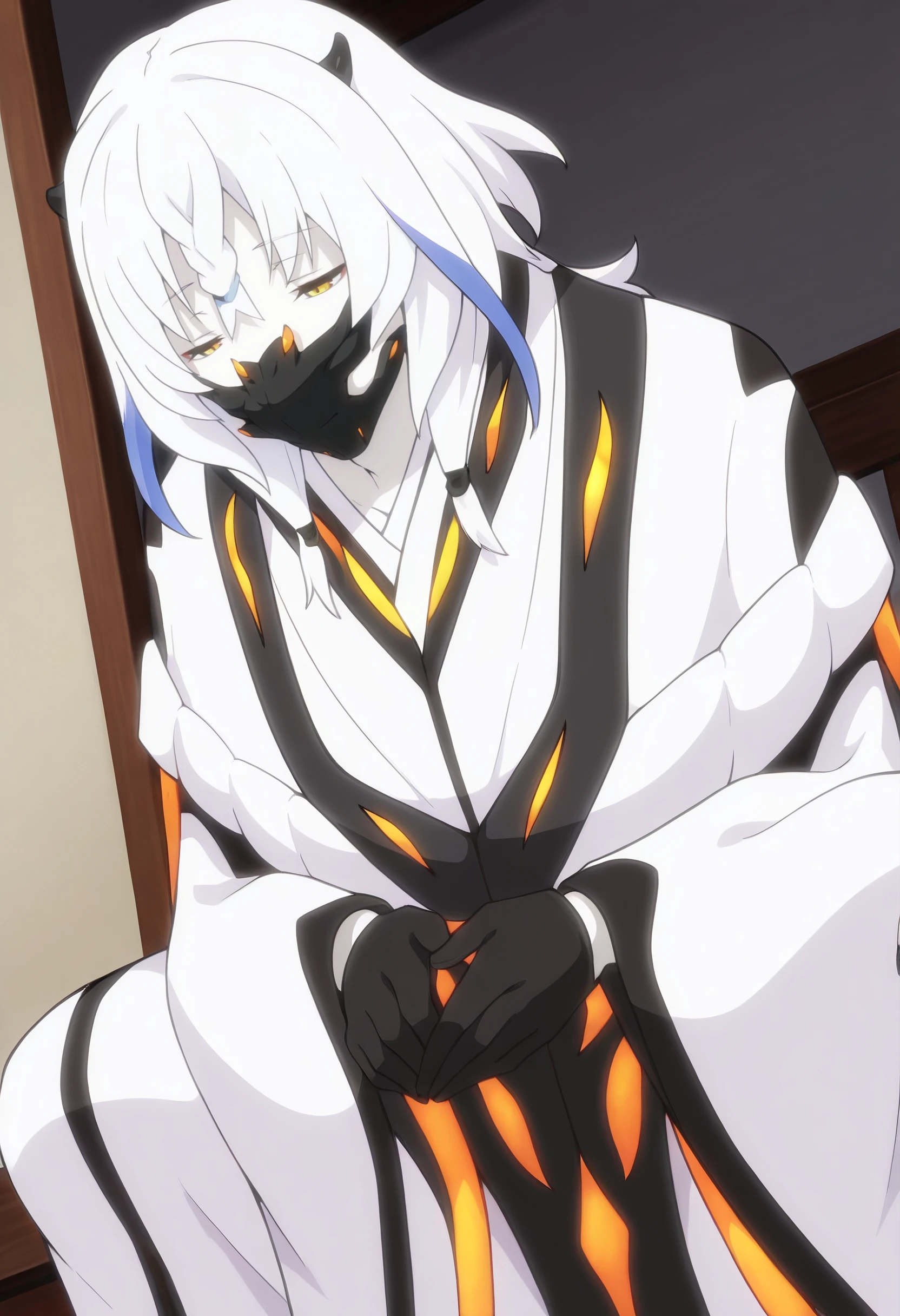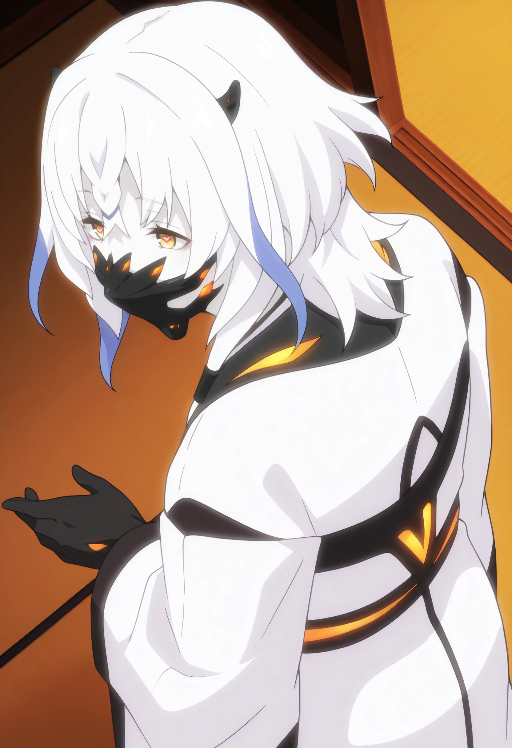 TNMIchikishimahime, white hair, yellow eyes, multicolored hair, braid, medium hair, streaked hair, blue hair, white skin, pale skin, mouth mask, horns, colored skin, mask, black mask,