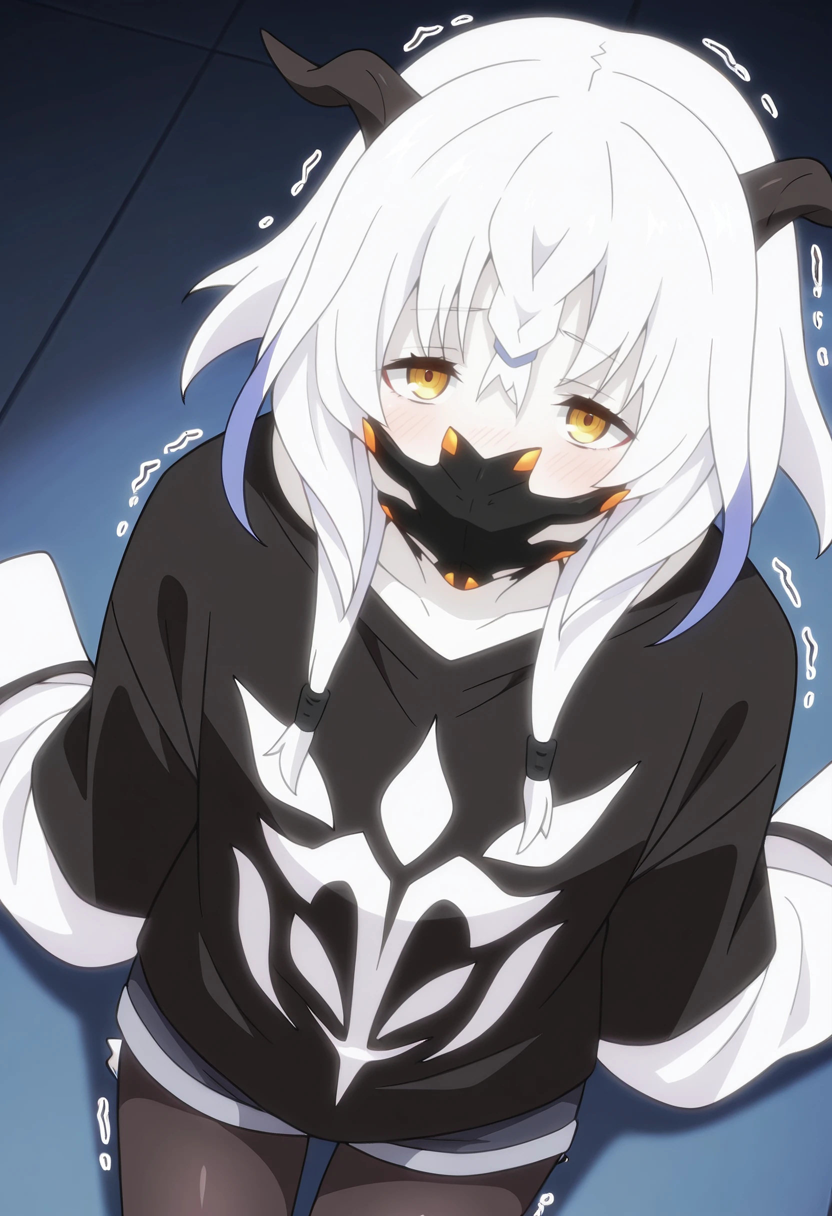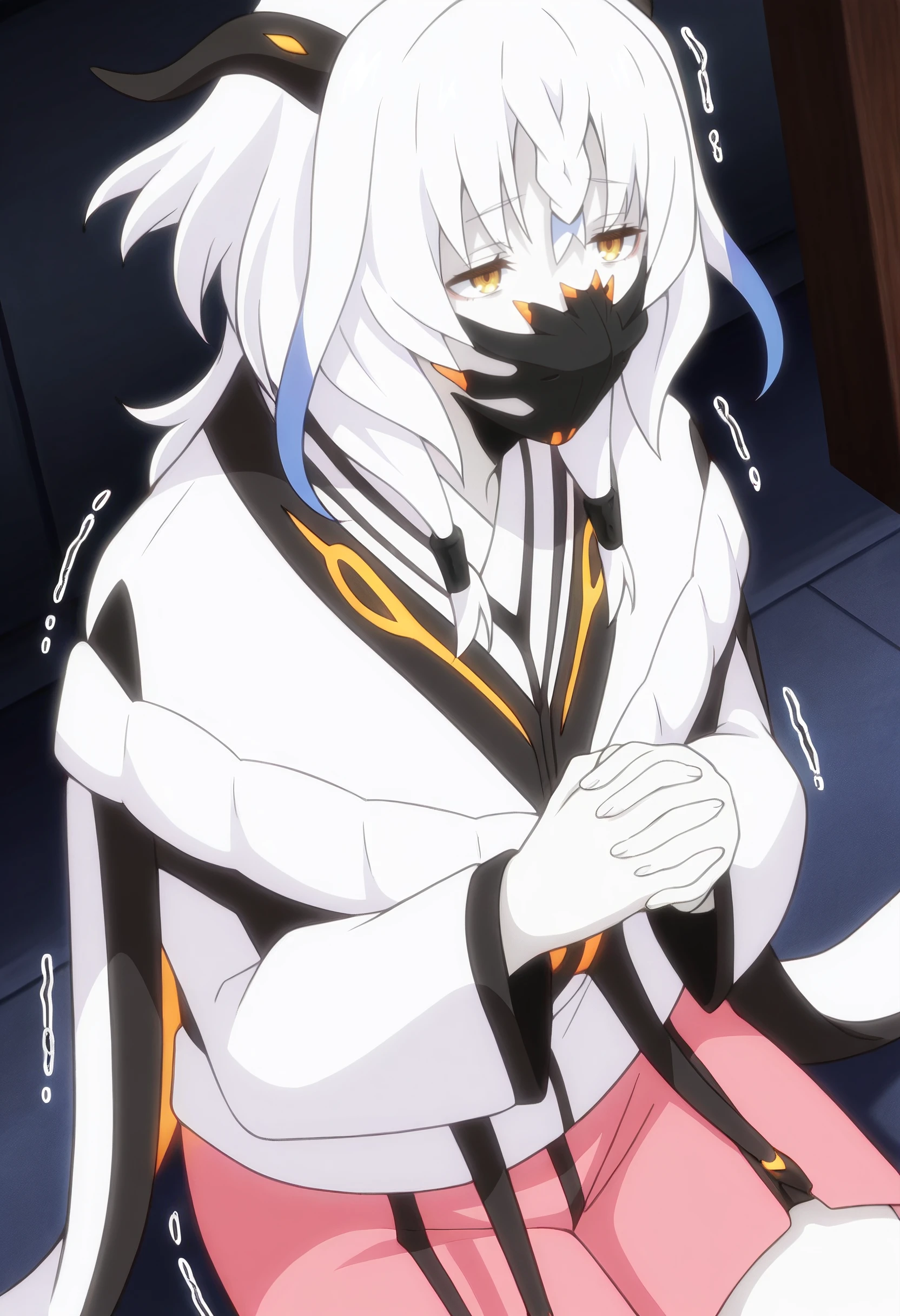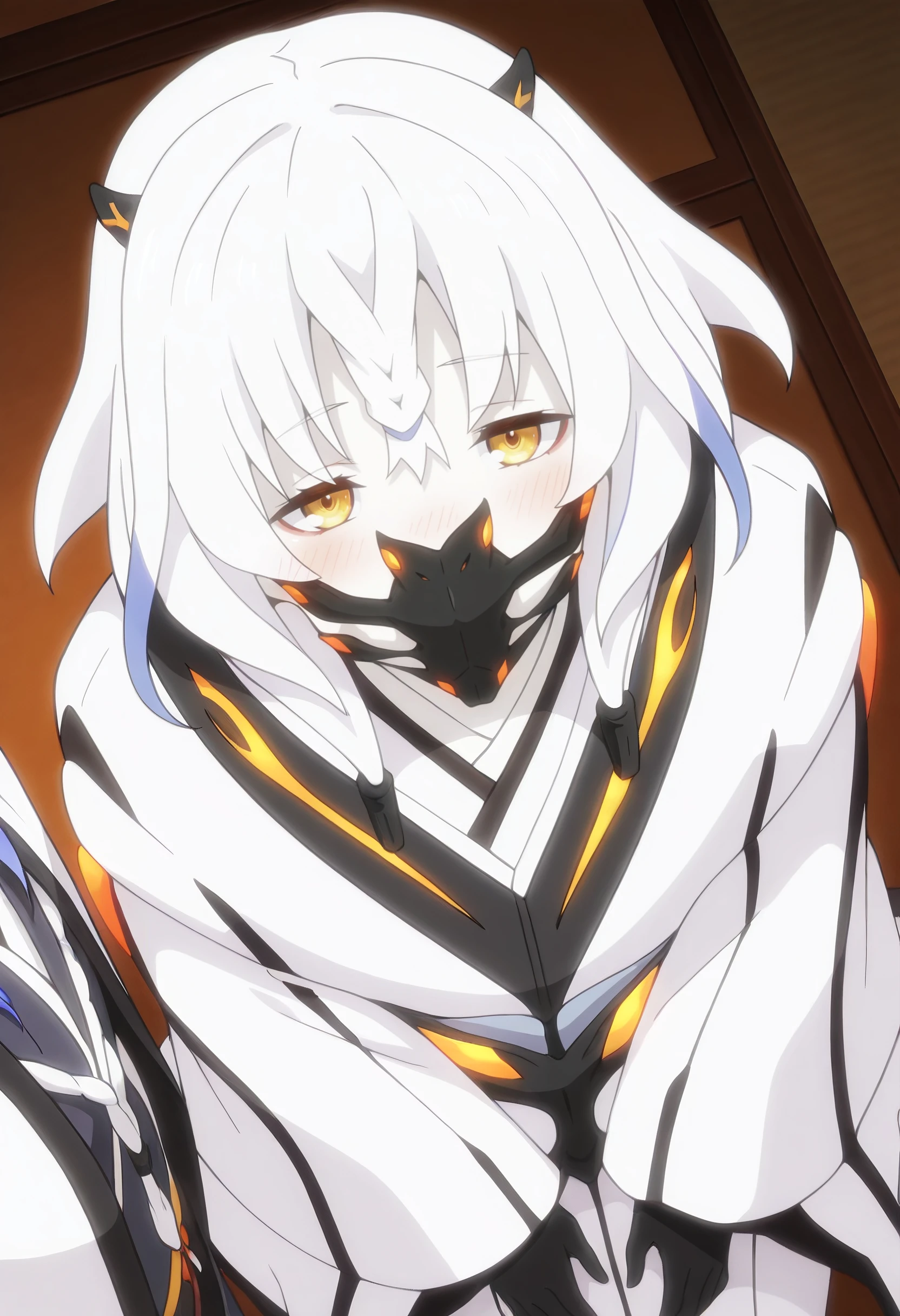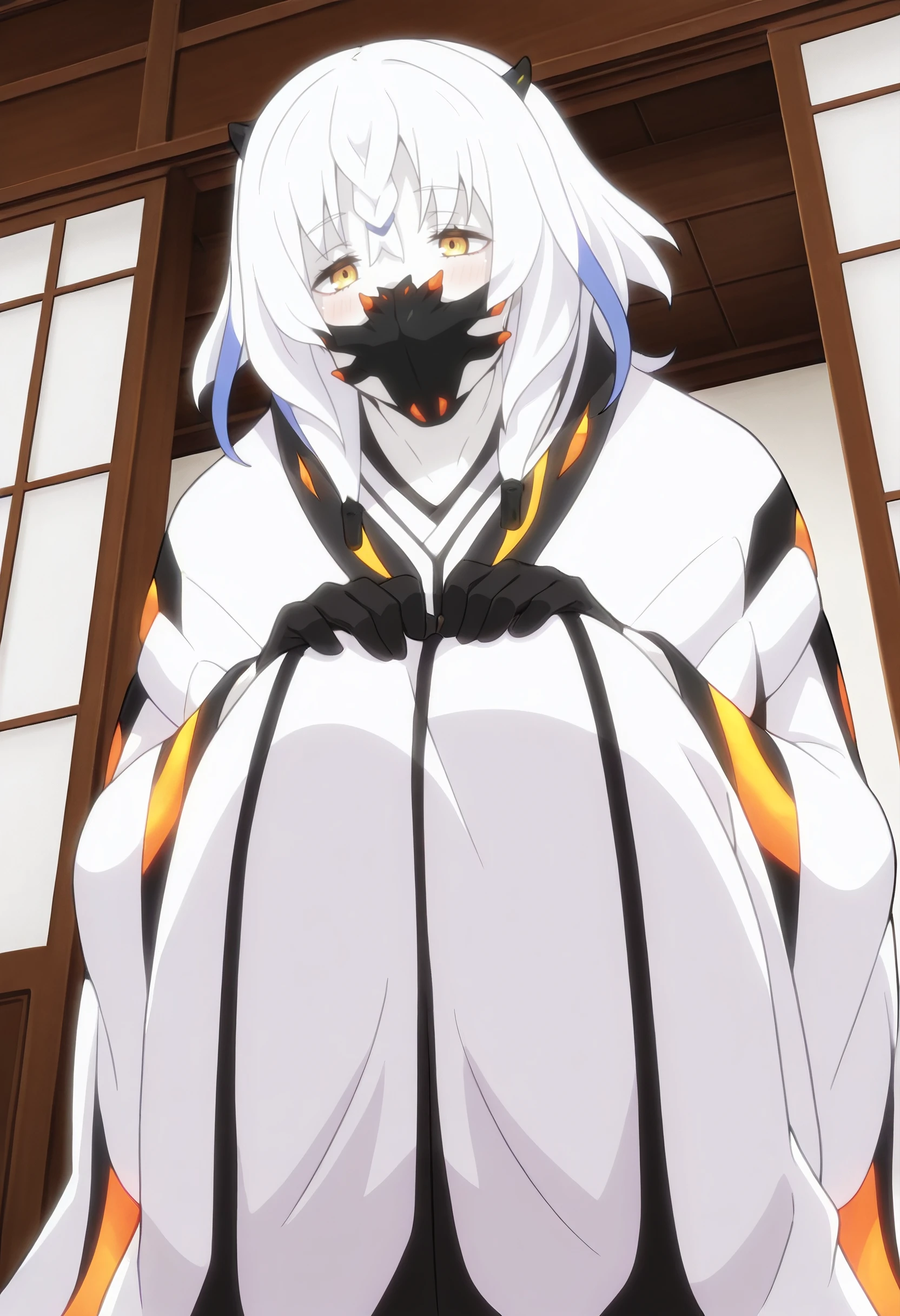 TNMIchikishimahime, white hair, yellow eyes, multicolored hair, braid, medium hair, streaked hair, blue hair, white skin, pale skin, mouth mask, horns, colored skin, mask, black mask,