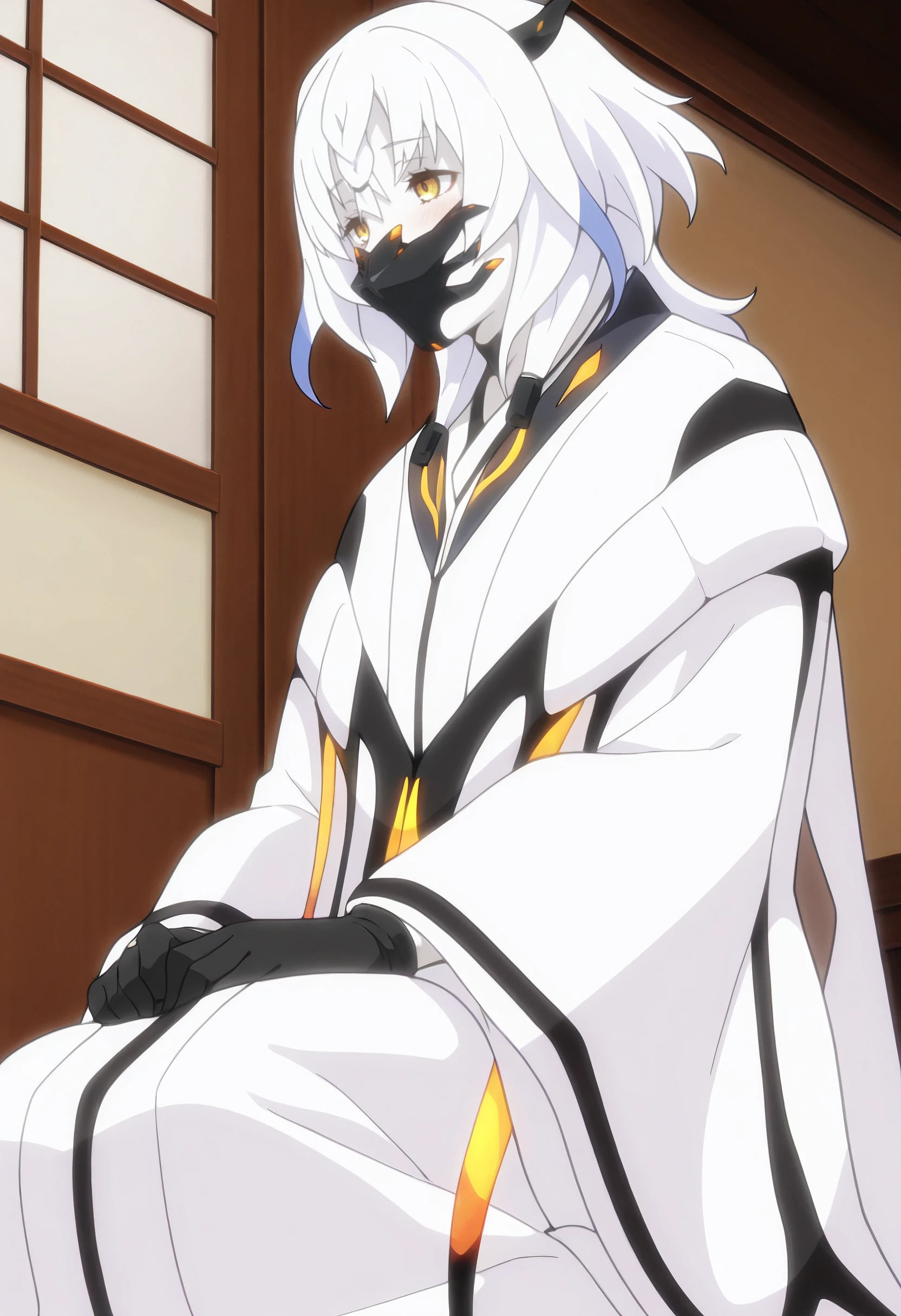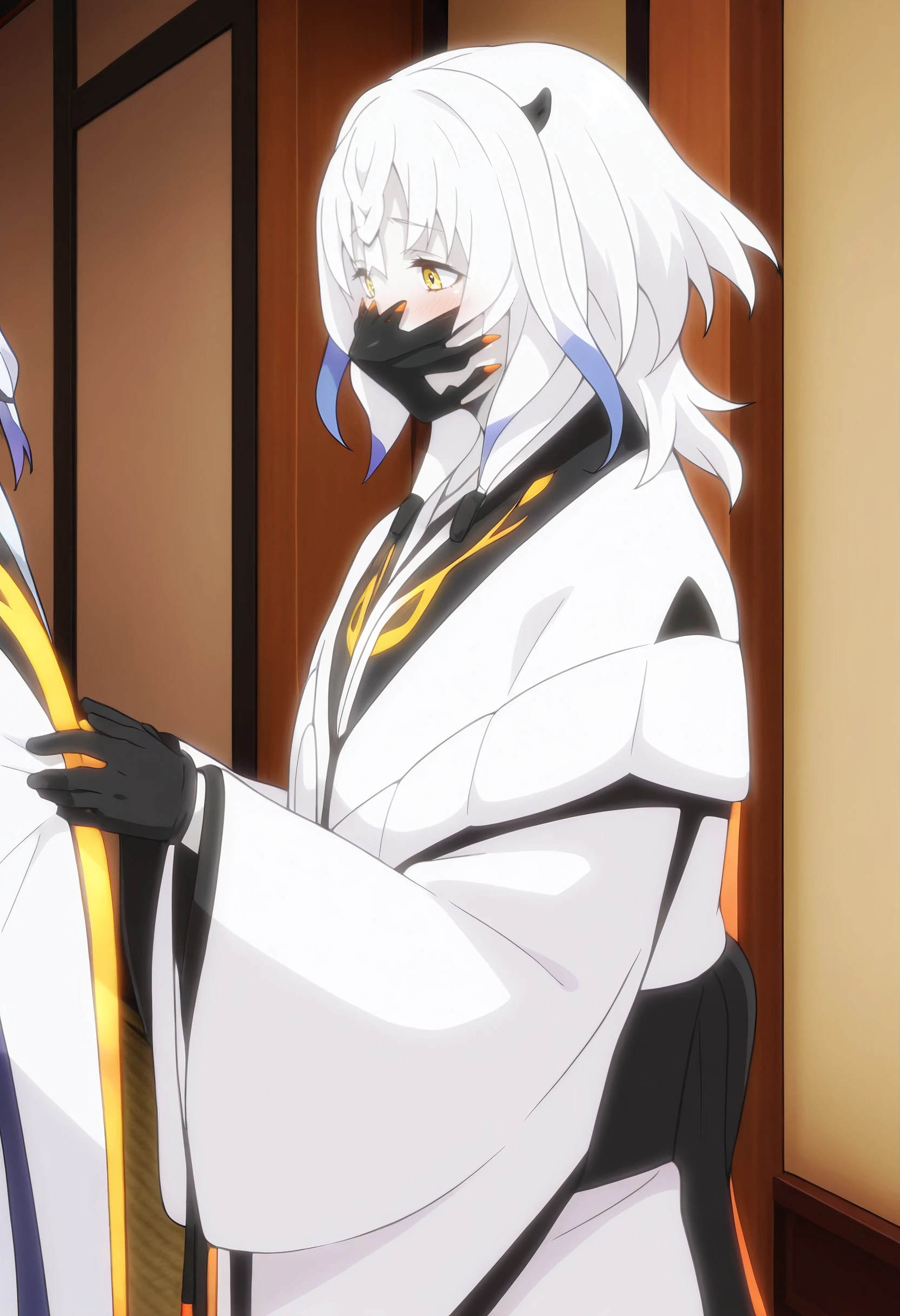 IchikishimahimeOutfit, japanese clothes, kimono, white kimono, long sleeves, gloves, black gloves, wide sleeves,