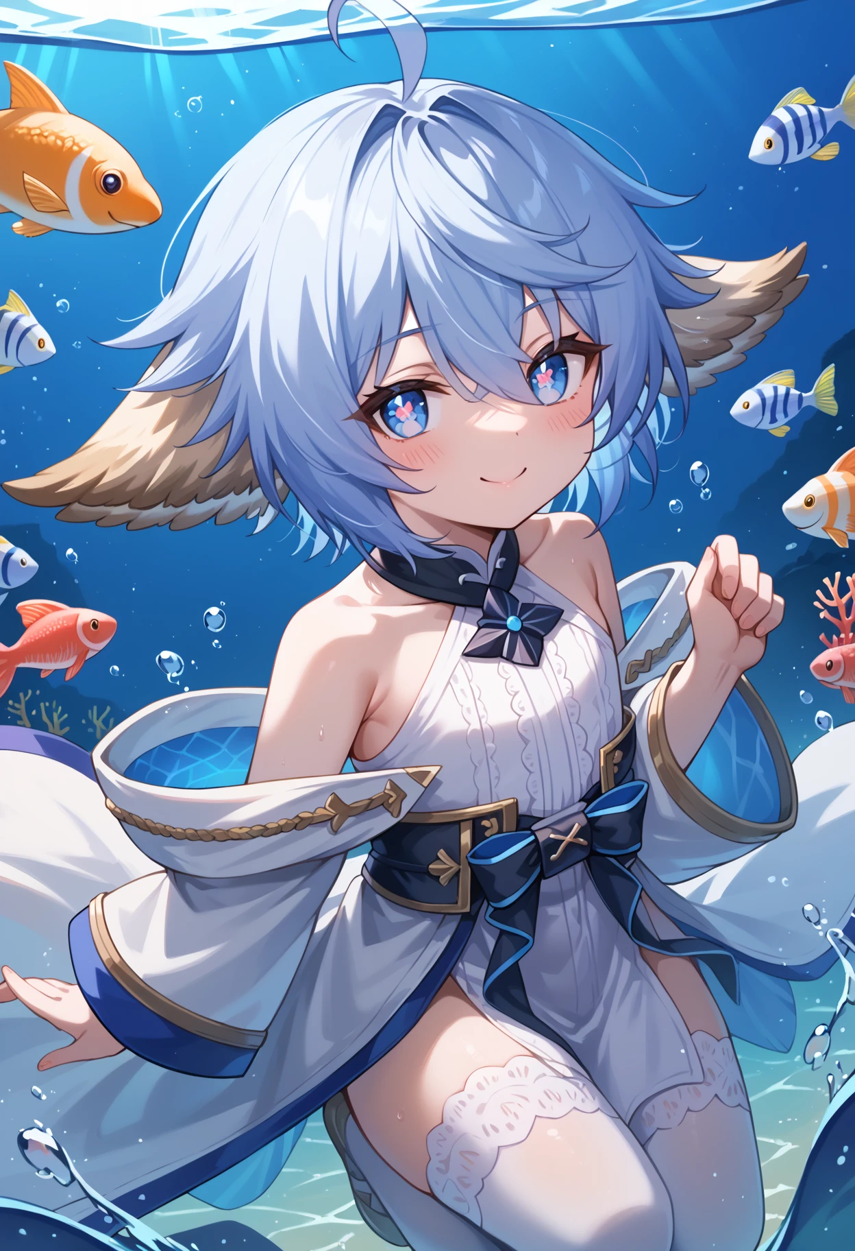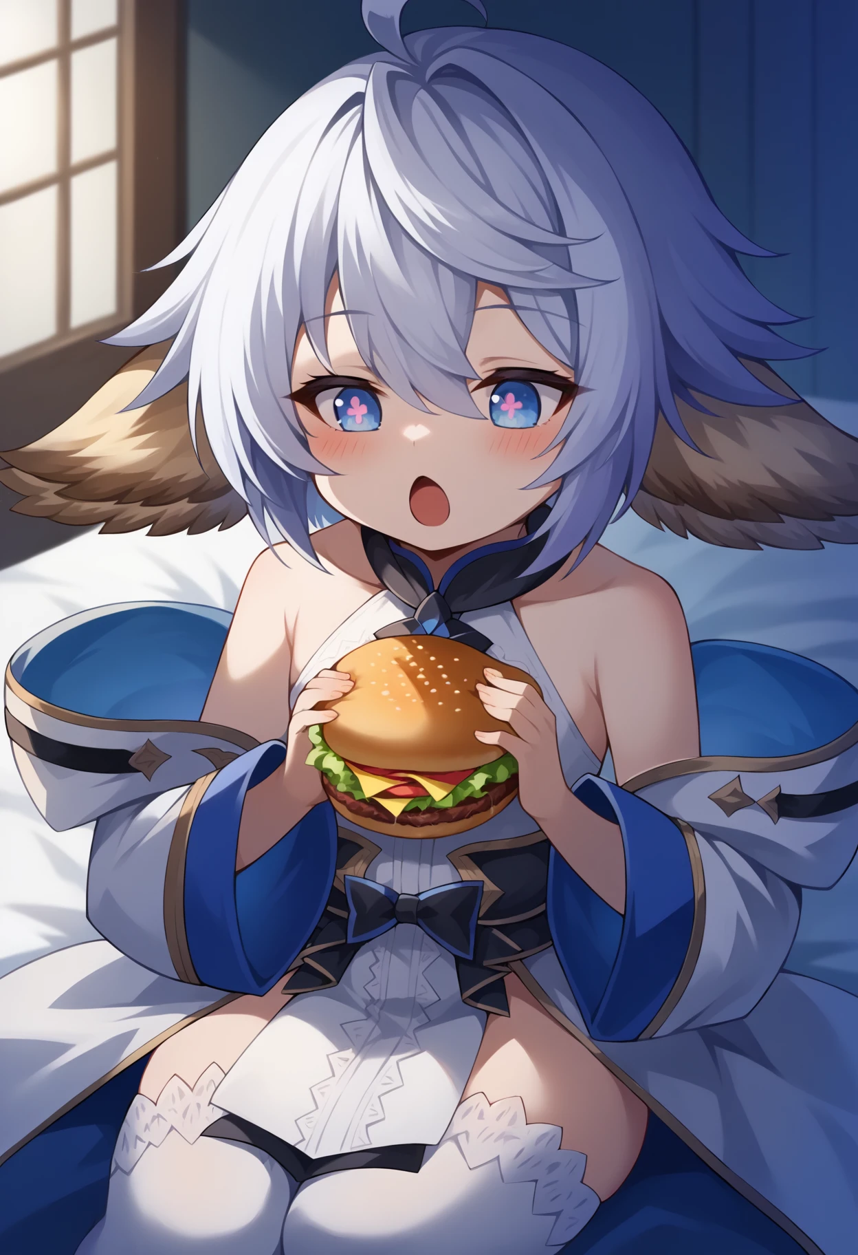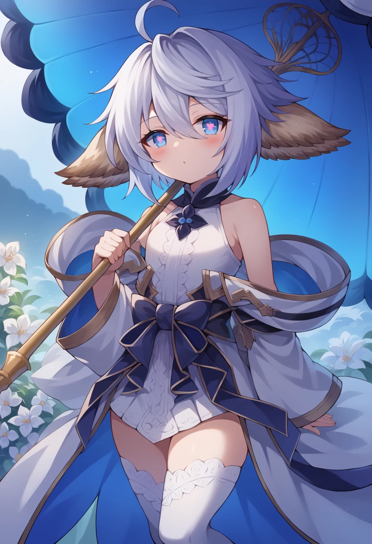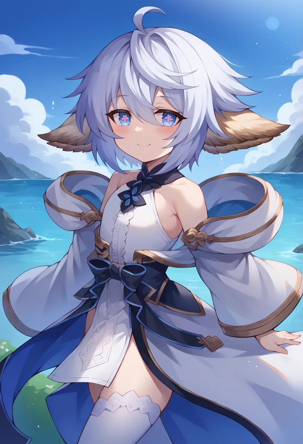 gbfwam, short hair, animal ears, ahoge, blue eyes, + +, flower-shaped pupils, wamdef, white dress, bare shoulders, sleeveless, waist bow, open coat, gold trim, detached sleeves, wide sleeves, pelvic curtain, white thighhighs,