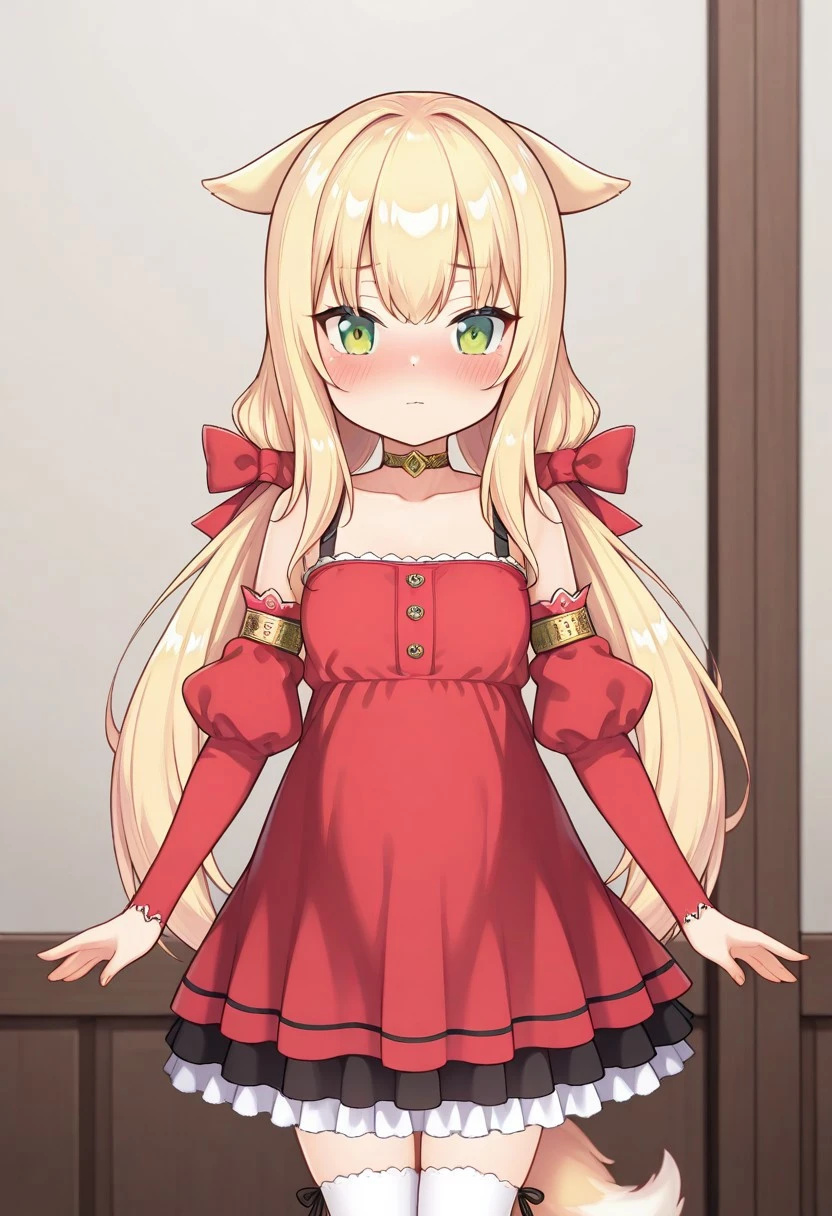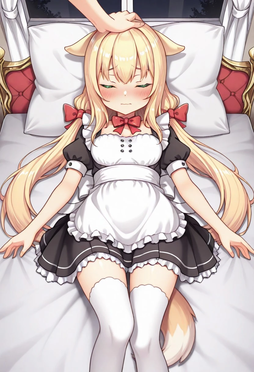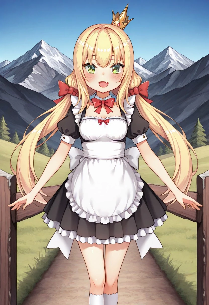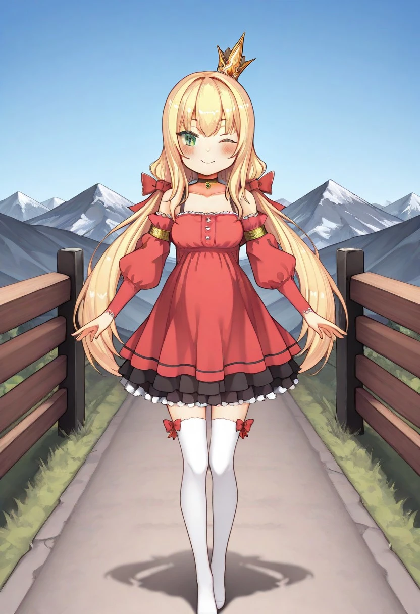 h1me, 1girl, solo, blonde hair, twintail hair, long twintall, green eyes, blush, hair between eyes, red bow on twintail, mini crown, tilted headwear, small breastsOutfit sleeves