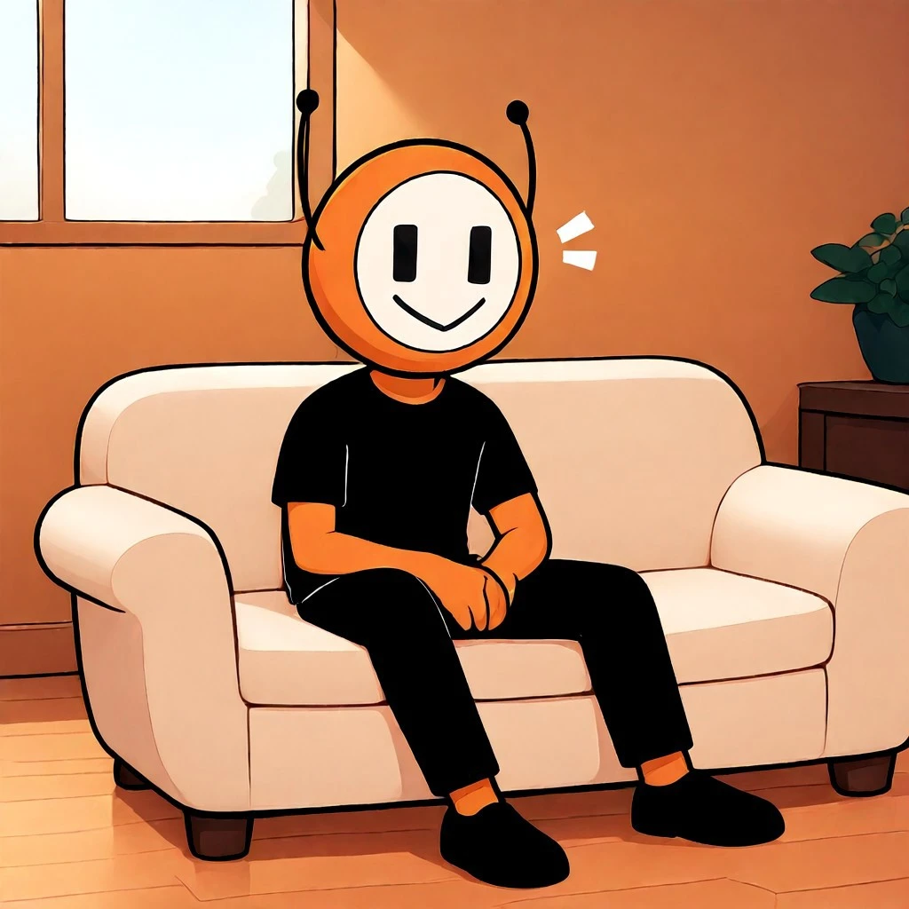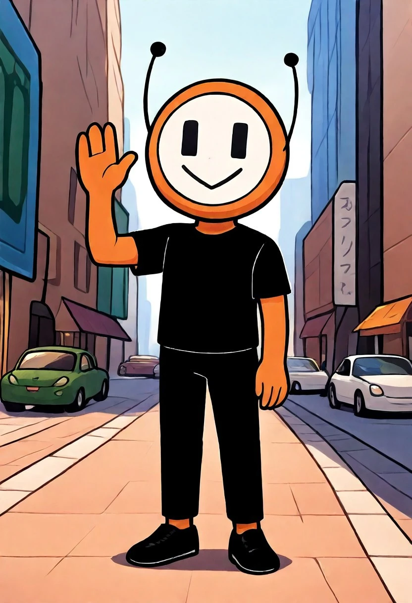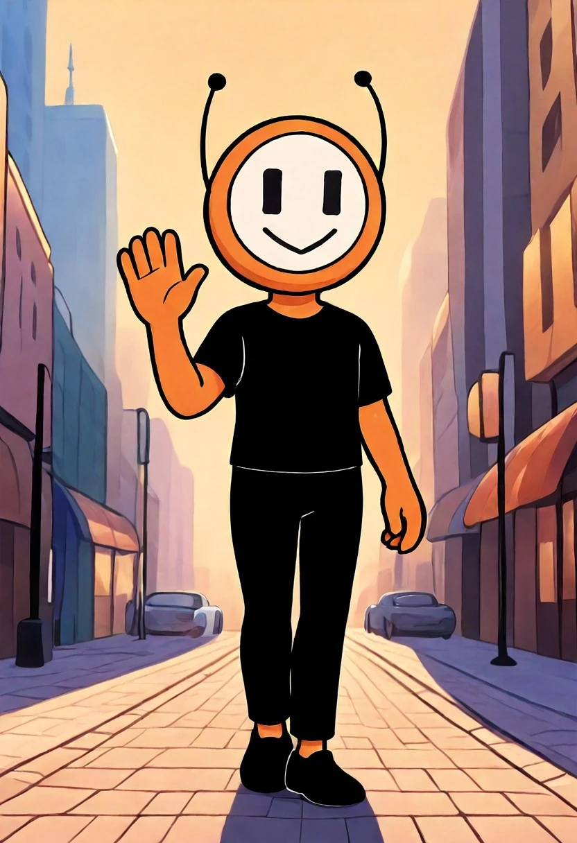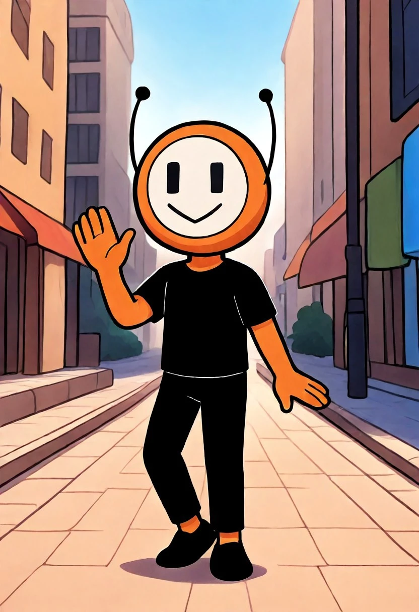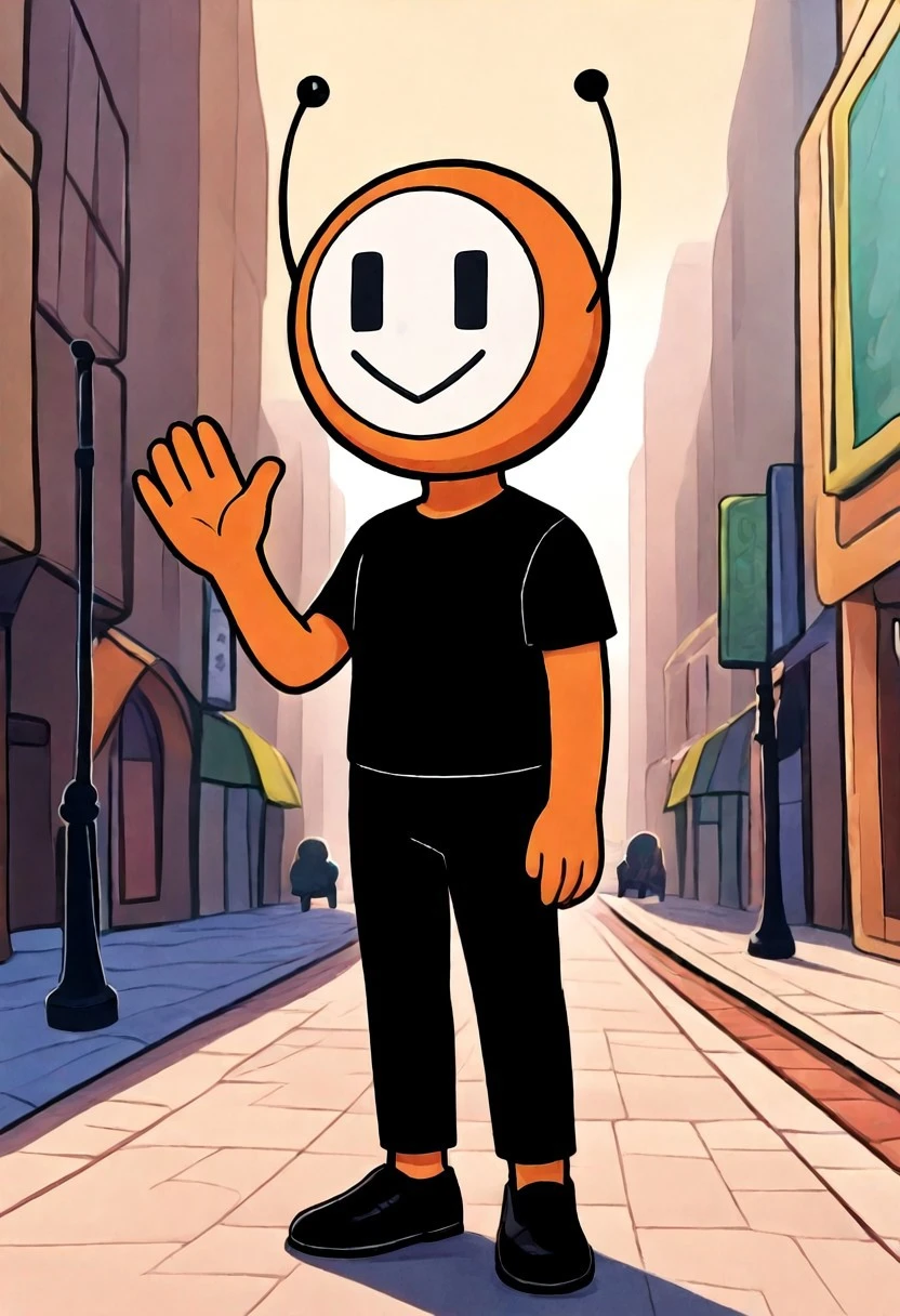 dbot, black pants, shoes, black shirt, orange skin, antennae, shirt, short sleeves, pants, black eyes, white face, smile, hi res, masterpiece, solo, male, looking at viewer, waving, standing, realistic background, living room