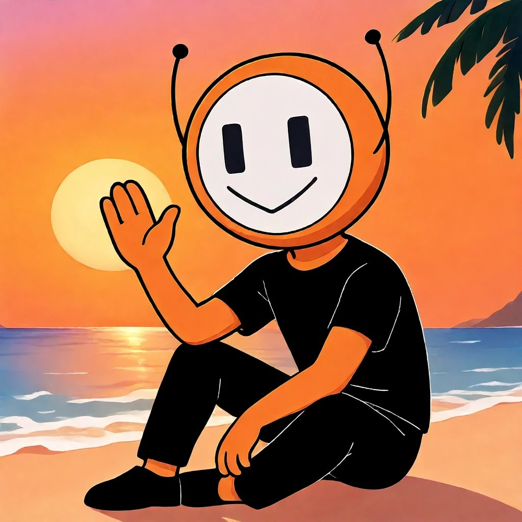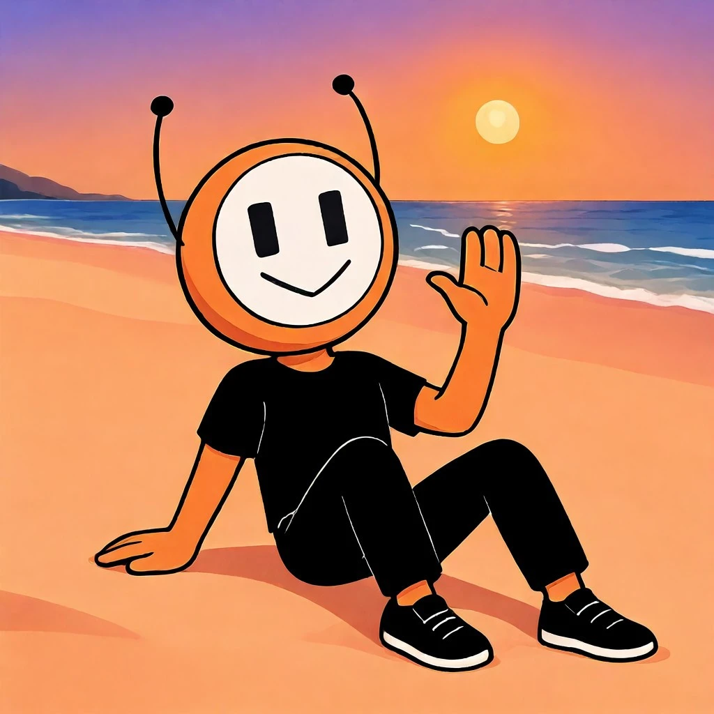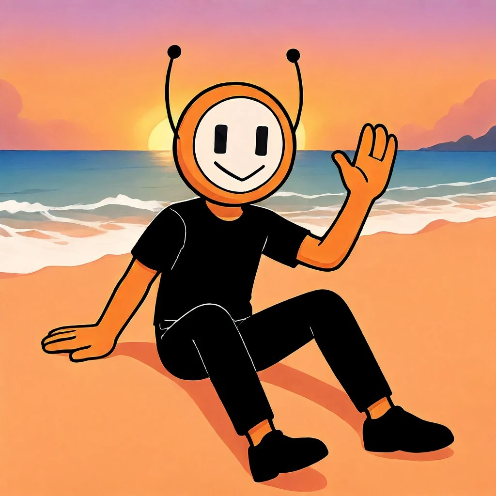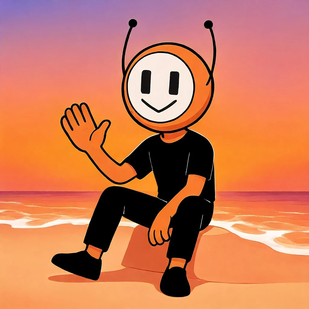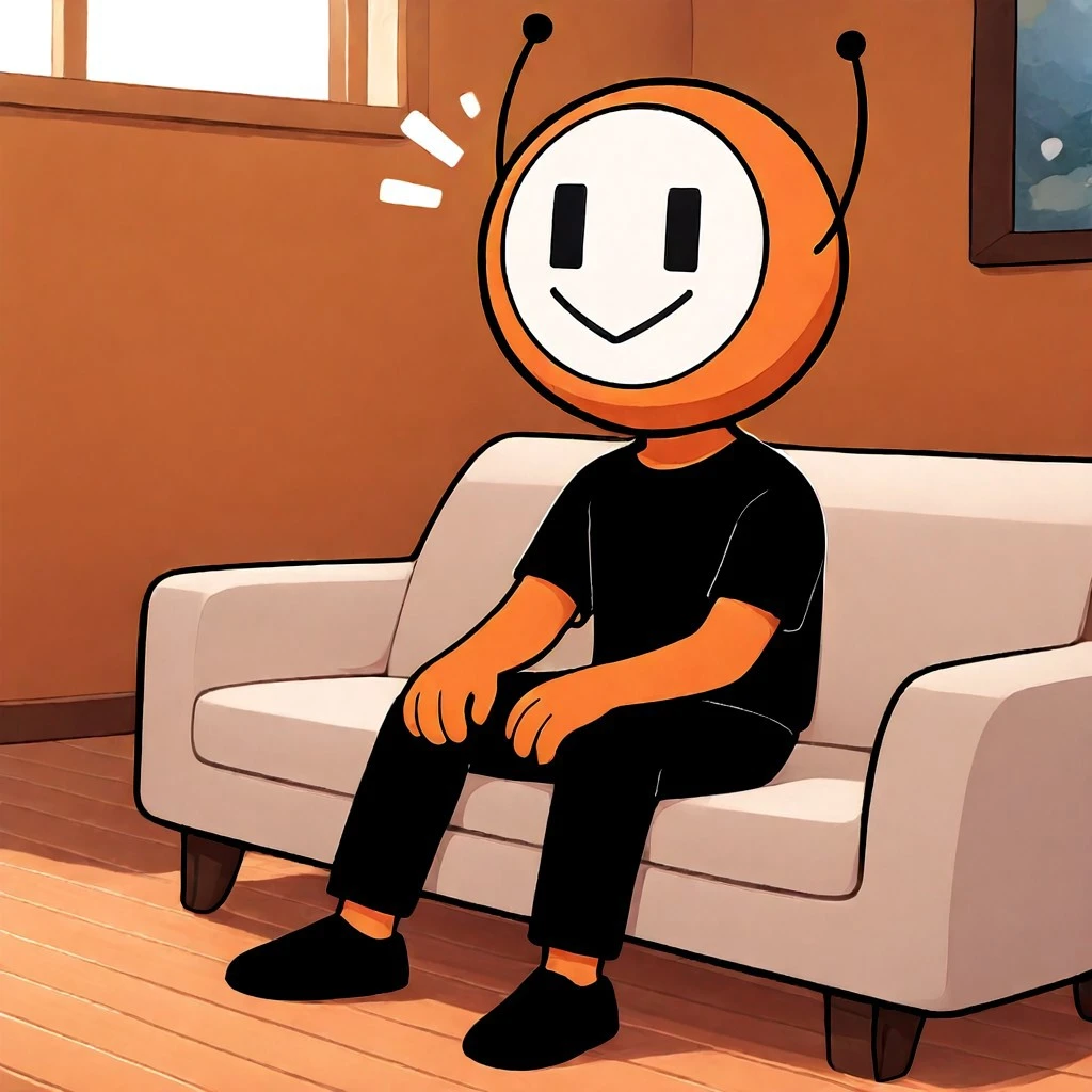 dbot, black pants, shoes, black shirt, orange skin, antennae, shirt, short sleeves, pants, black eyes, white face, smile, hi res, masterpiece, solo, male, looking at viewer, waving, standing, realistic background, living room