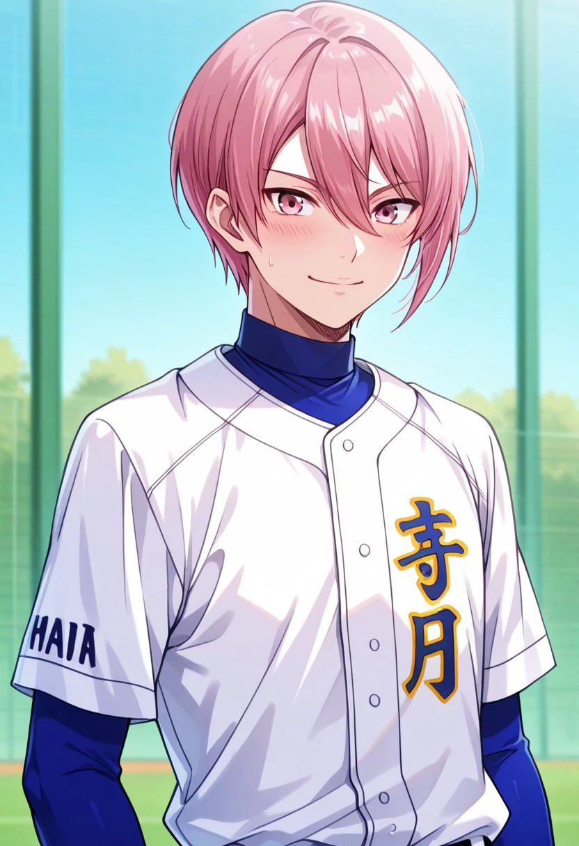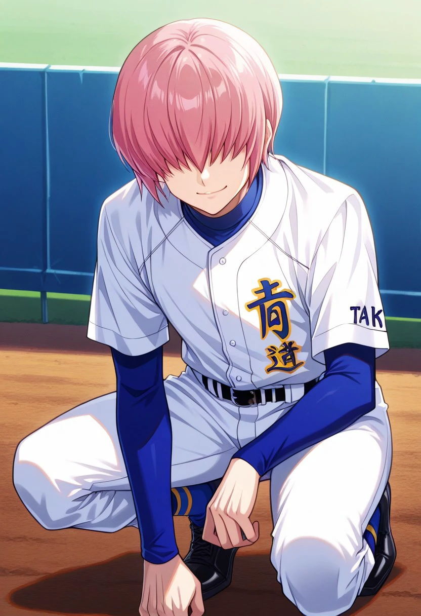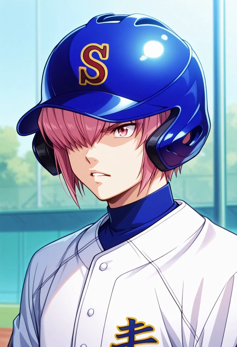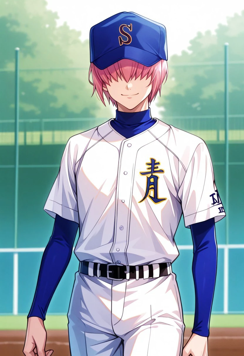 haruichi, 1boy, male focus, hat, sportswear, baseball uniform, pink hair, baseball cap, blue headwear, short hair, hair over eyes,