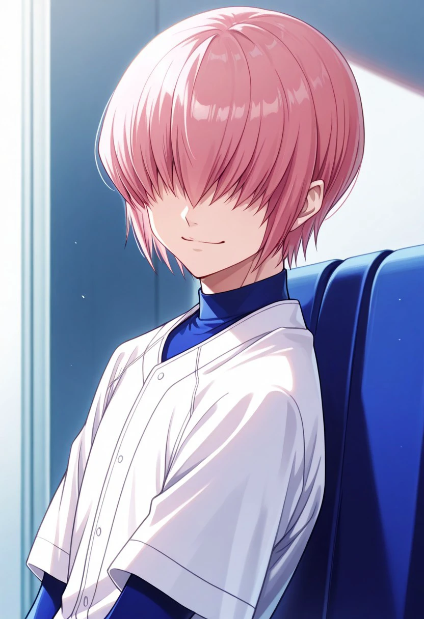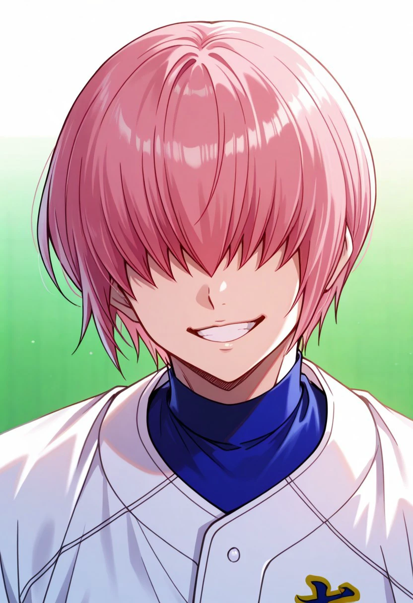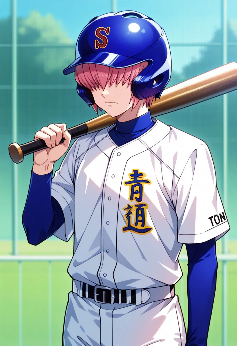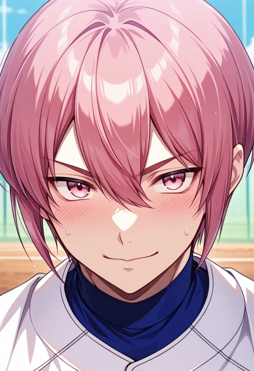 haruichi, 1boy, male focus, hat, sportswear, baseball uniform, pink hair, baseball cap, blue headwear, short hair, hair over eyes,