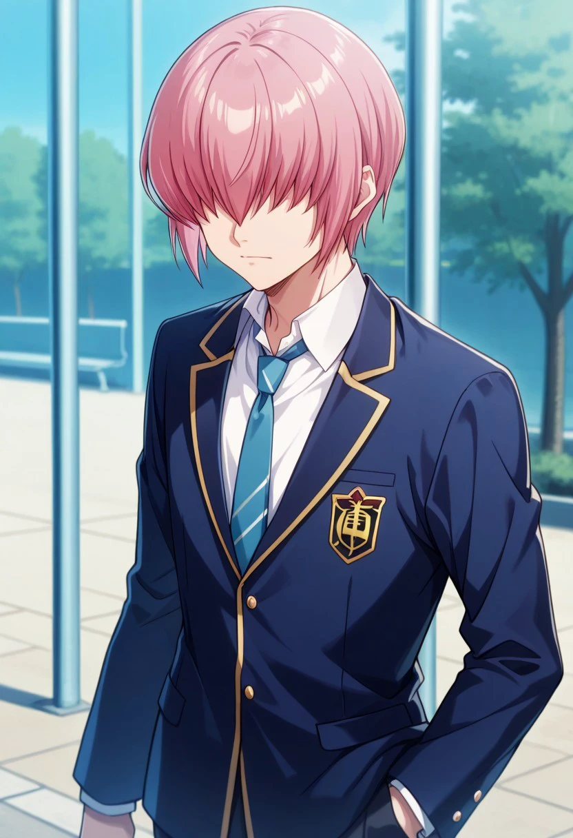 harukomin, 1boy, male focus, solo, pink eyes, pink hair, hair between eyes, school uniform, shirt, white shirt, collared shirt, necktie, blue necktie, jacket, blazer, blue jacket, long sleeves, pants, grey pants,