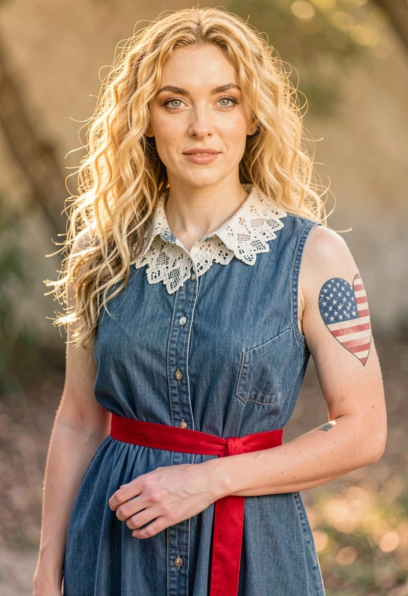 Clara Americano or America's Angel, a female from USA with Italian & German heritage with a Fair Skin Tone, Very Very Curly Golden Blonde Hair, and Striking Blue-Green Eyes
