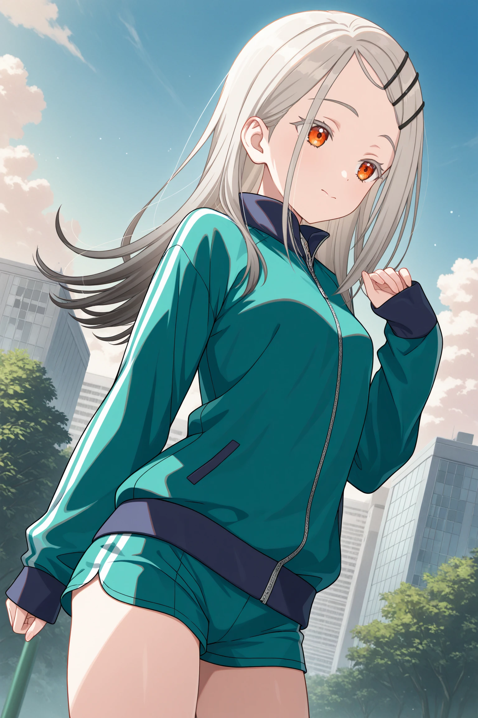 track jacket, green jacket, zipper, sleeves past wrists, green shorts, gym shorts, short shorts, track suit, gym uniform