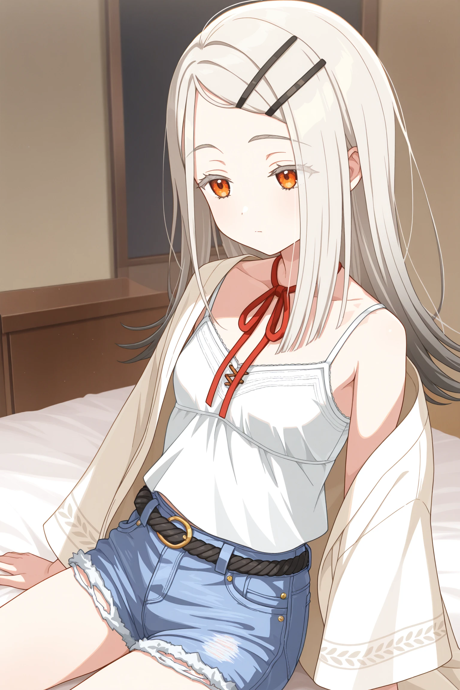 white coat, open coat, wide sleeves, neck ribbon, red ribbon, white camisole, black belt, blue shorts, denim shorts, short shorts