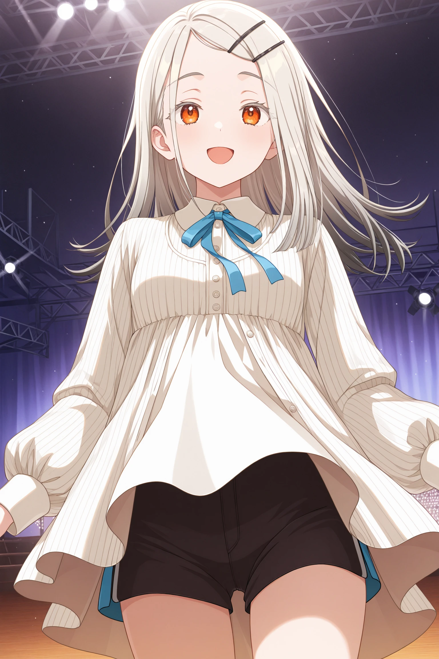white jacket, vertical-striped jacket, neck ribbon, blue ribbon, buttons, collared dress, white dress, puffy long sleeves, black shorts, short shorts