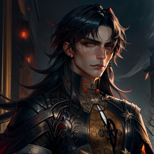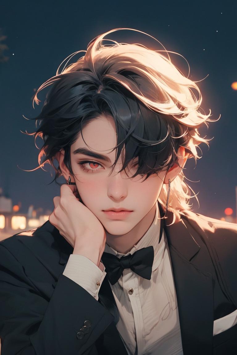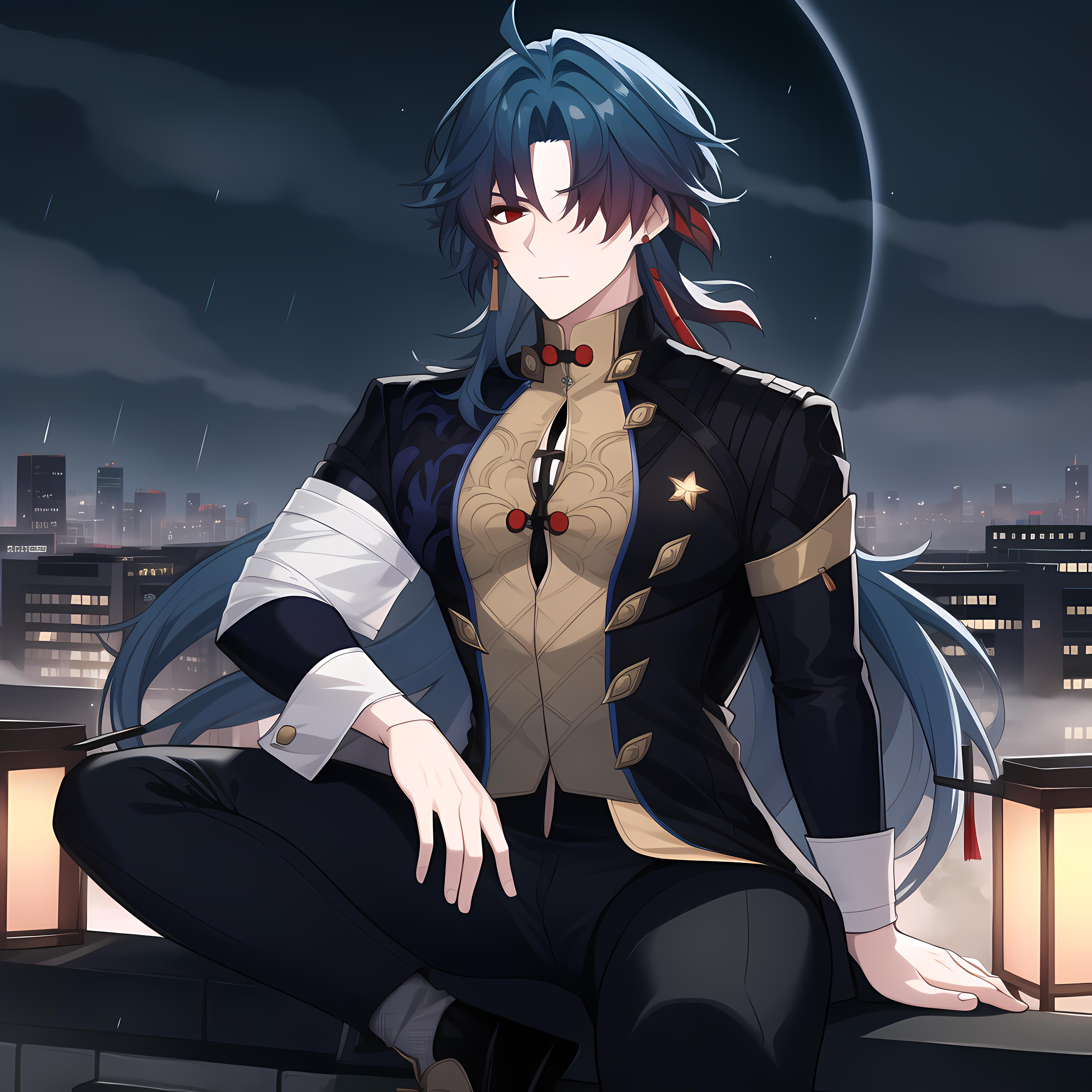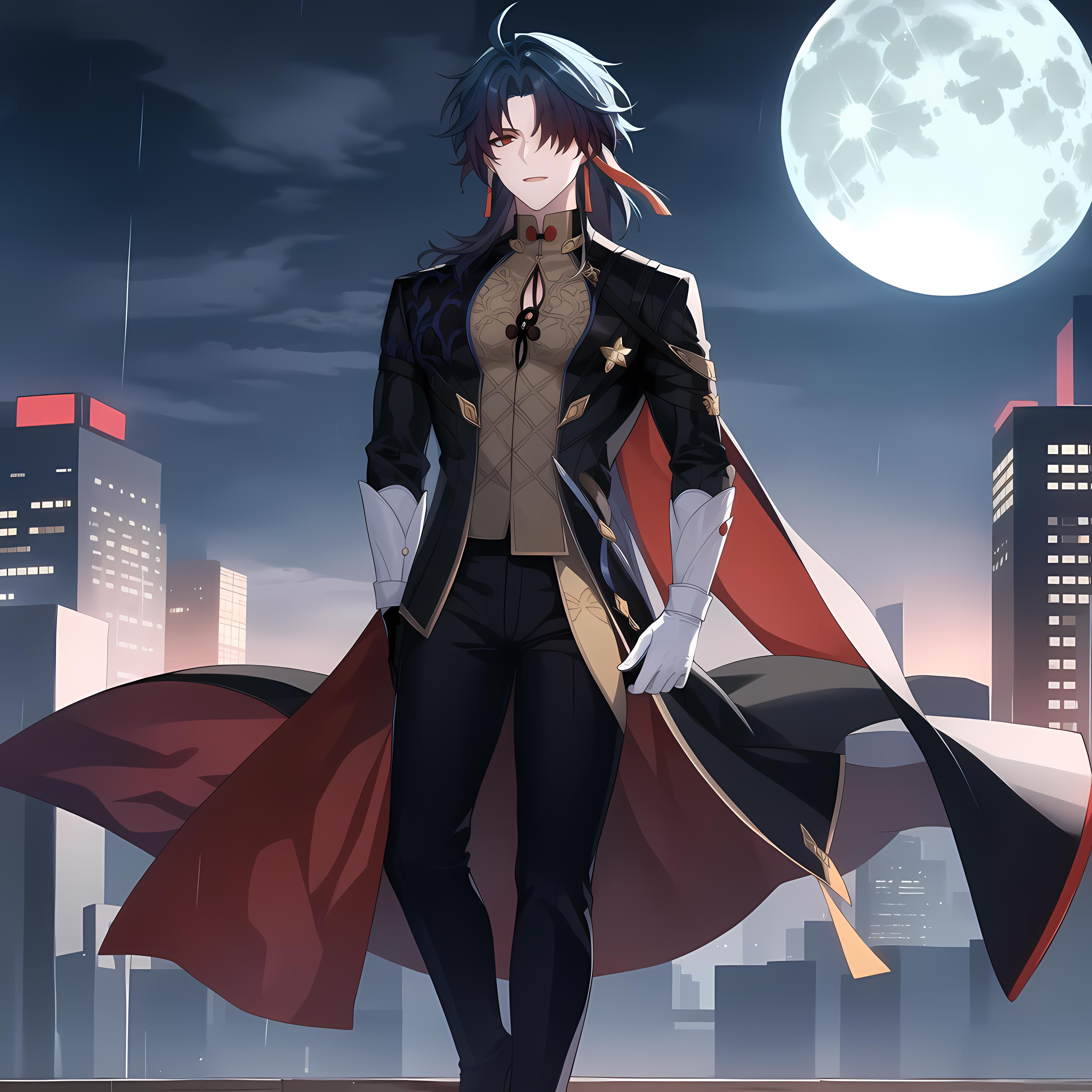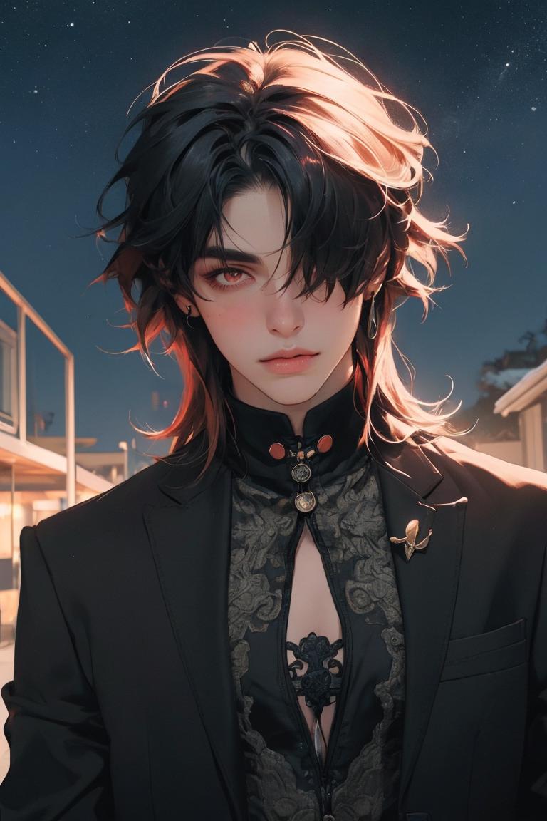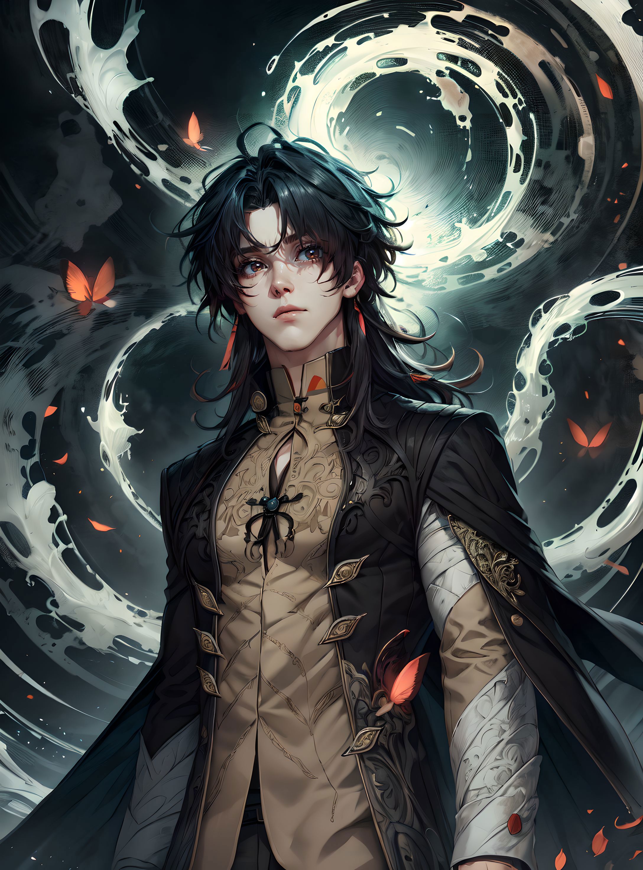 optional tags: male focus, black coat, chinese clothes, bangs,