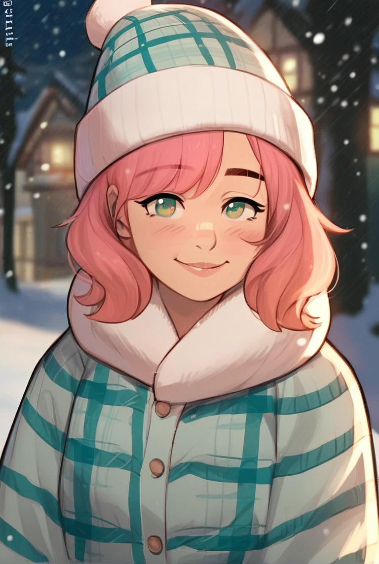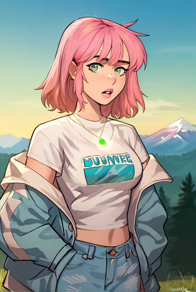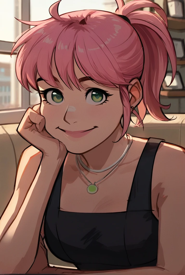 anniemei, 1girl, (insert length of hair here) pink hair, green eyes,