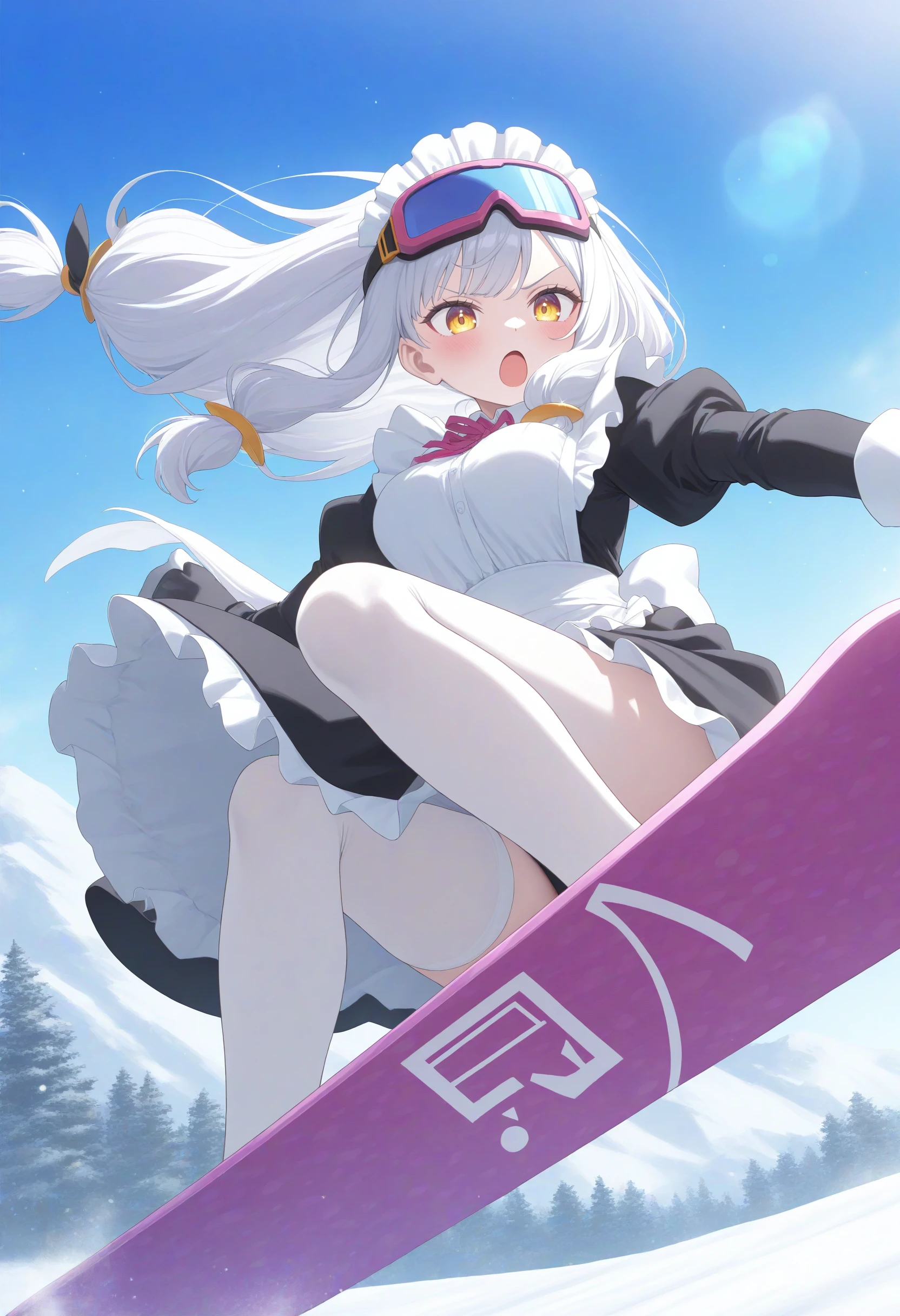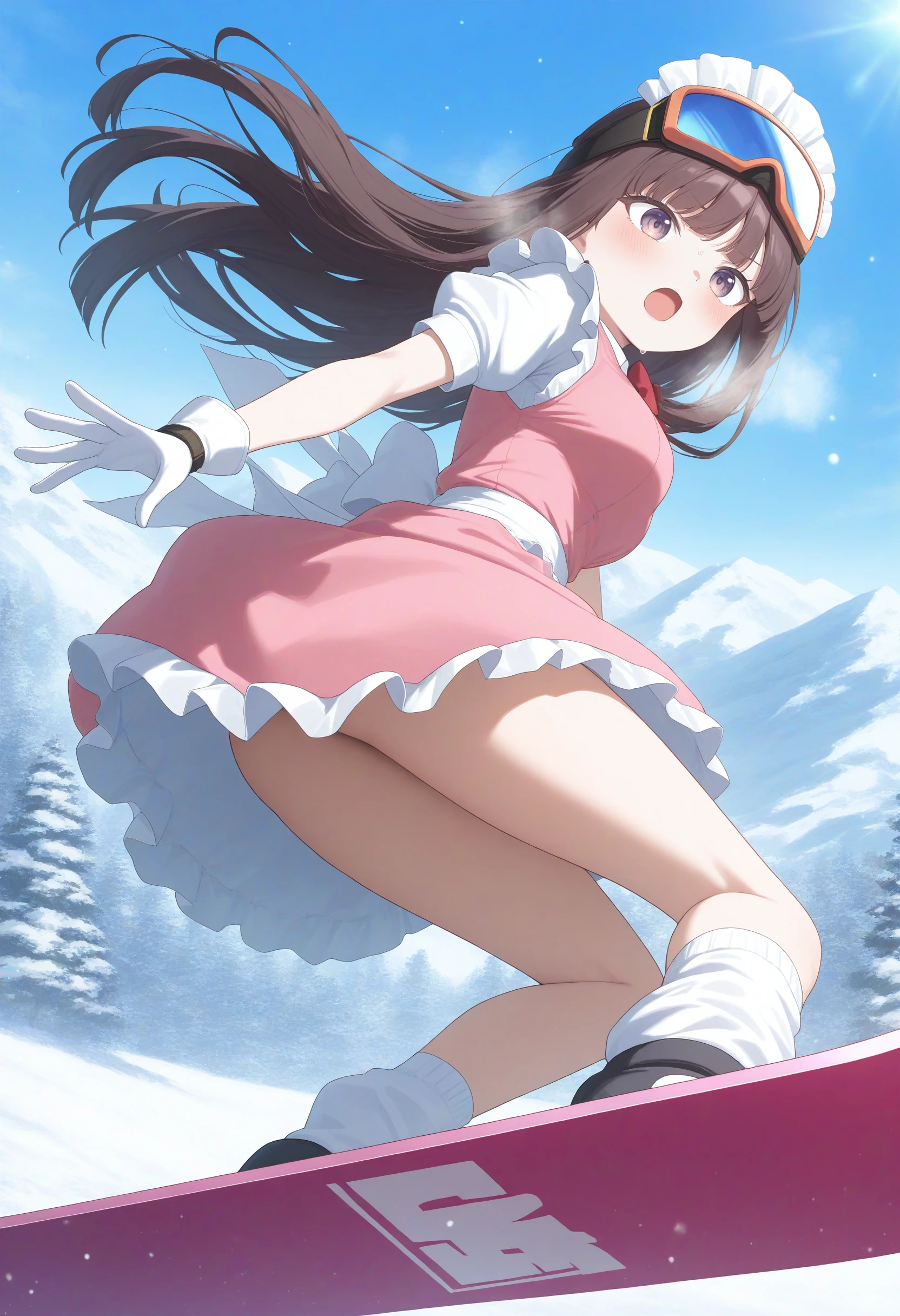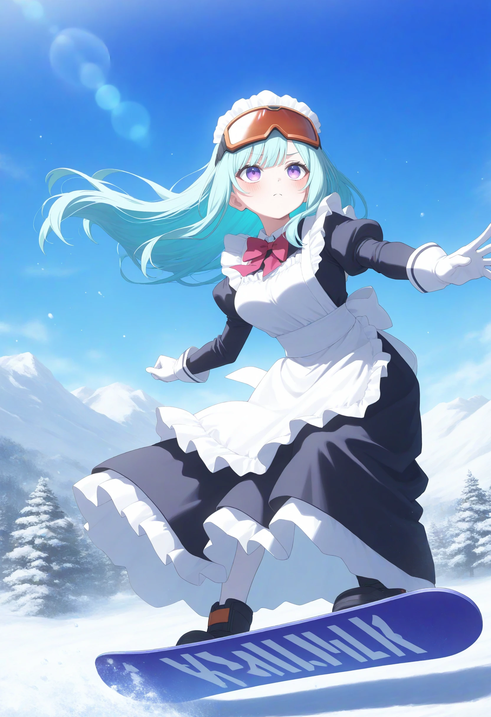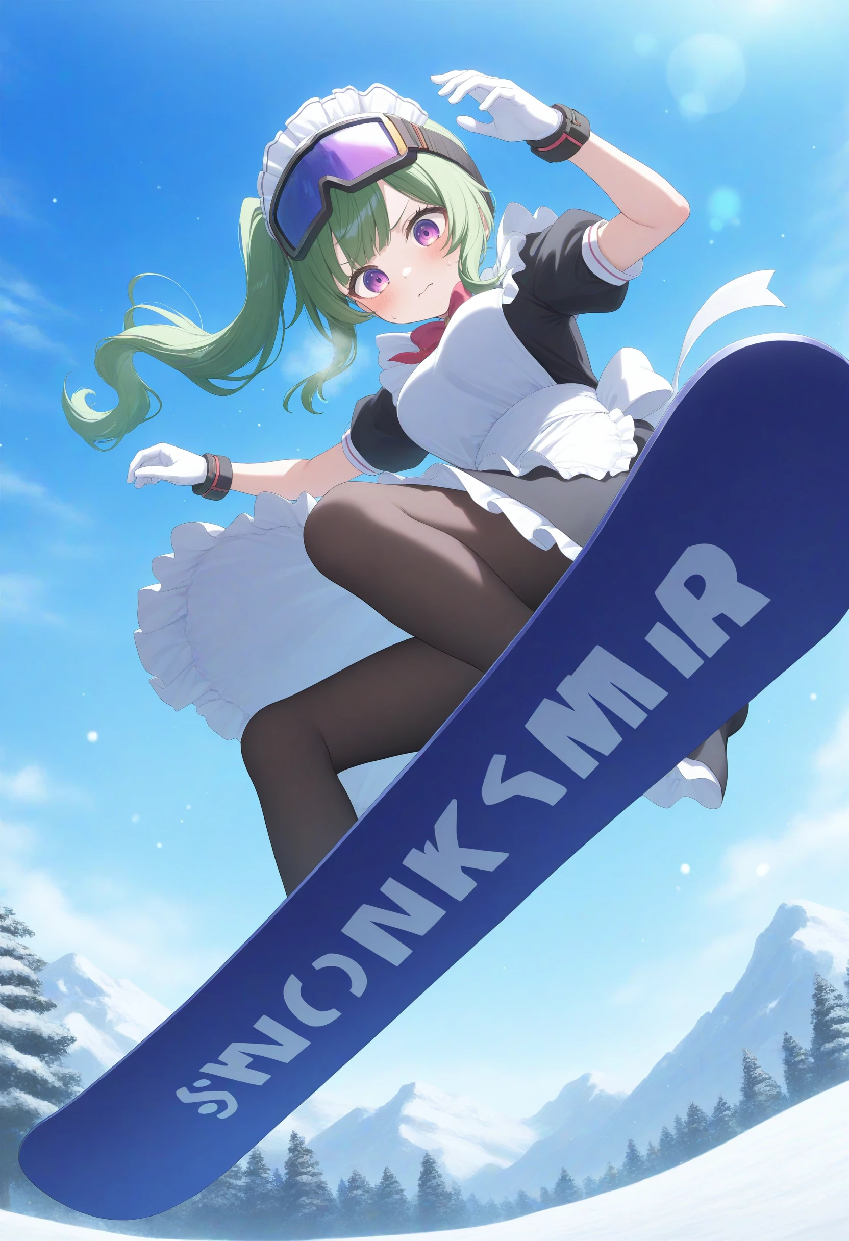 元からボードを出して乗る所までは学習していますが足の位置もボードの大きさも滅茶苦茶なので矯正します。トリガーだけでも問題ありませんが snowboarding,snow, outdoors, winter, floating hair, sparkle, snowing, lens flare, jumping, splashing 辺りから必要なものと冬服を指定すればそれっぽいかと思います。