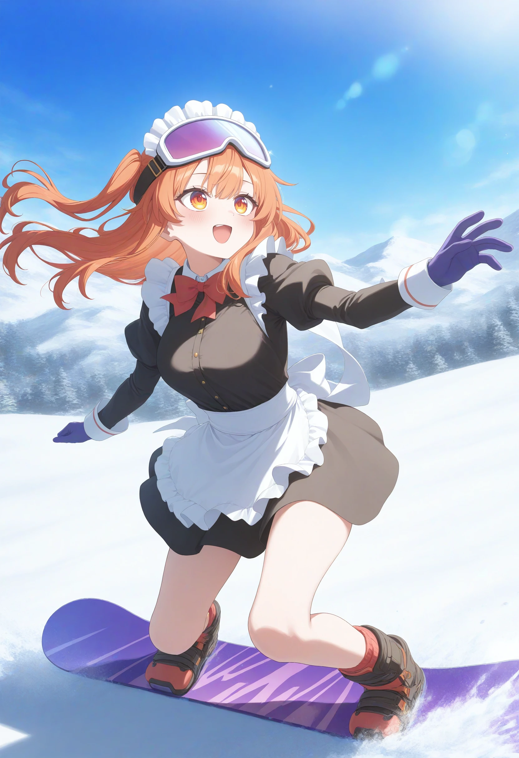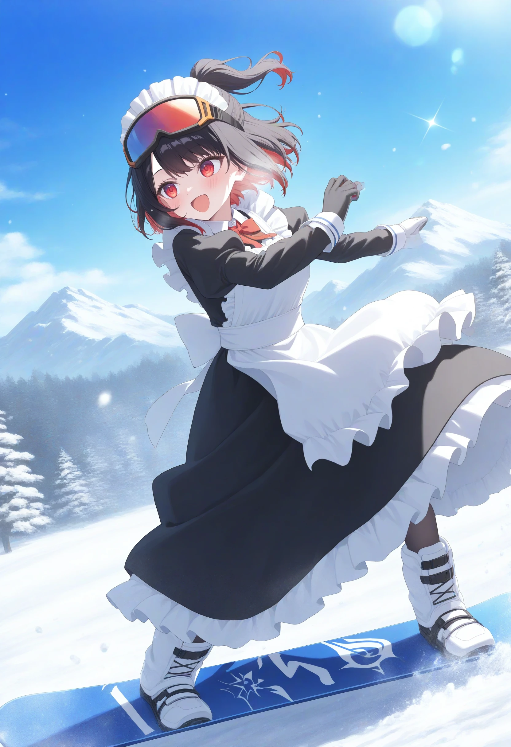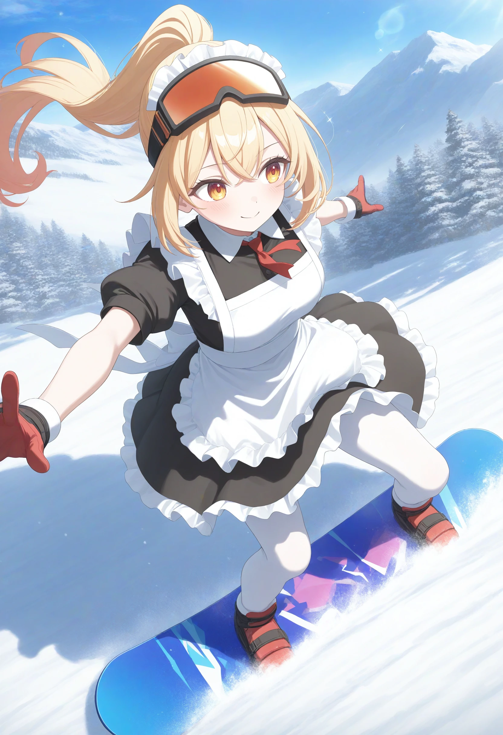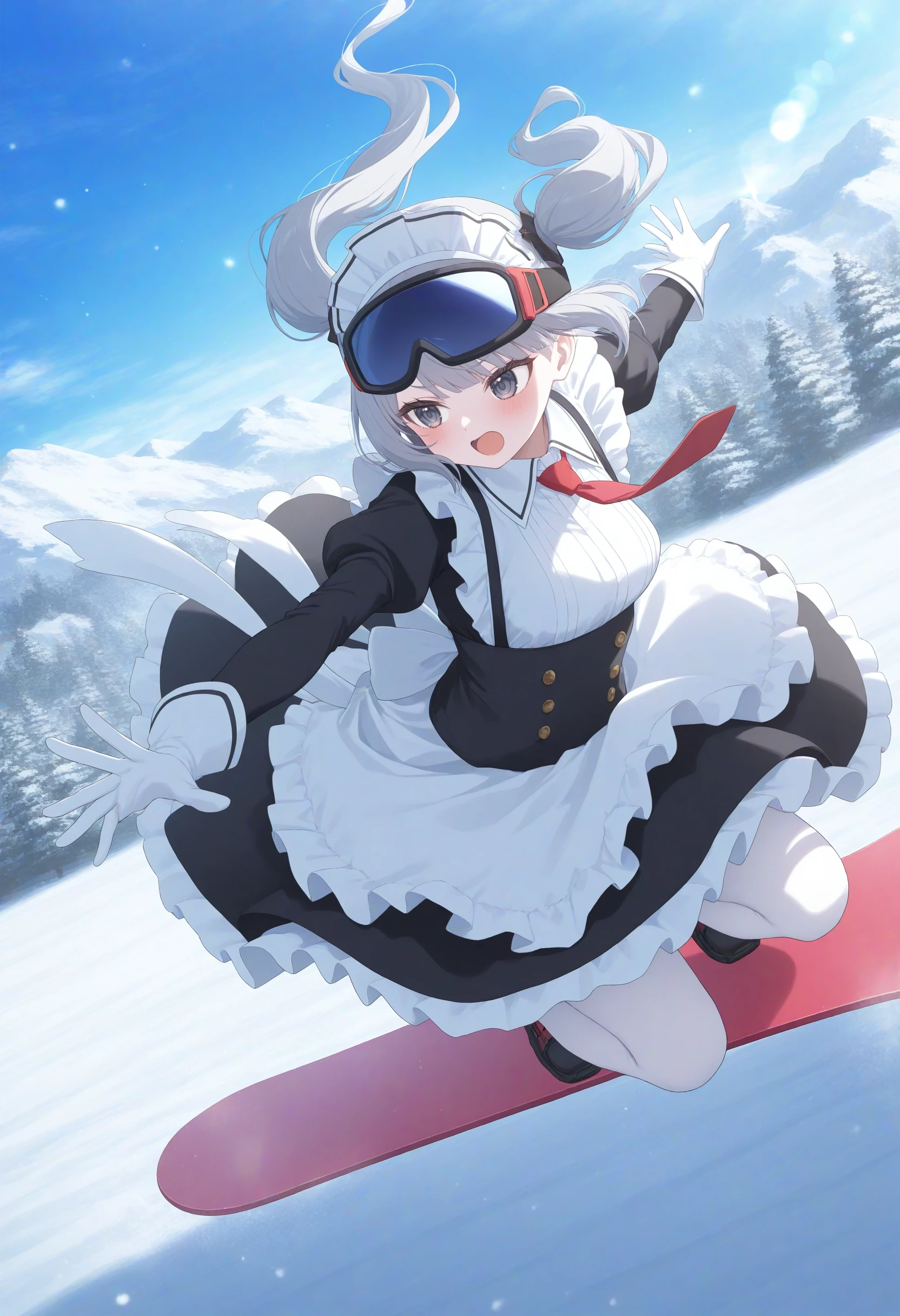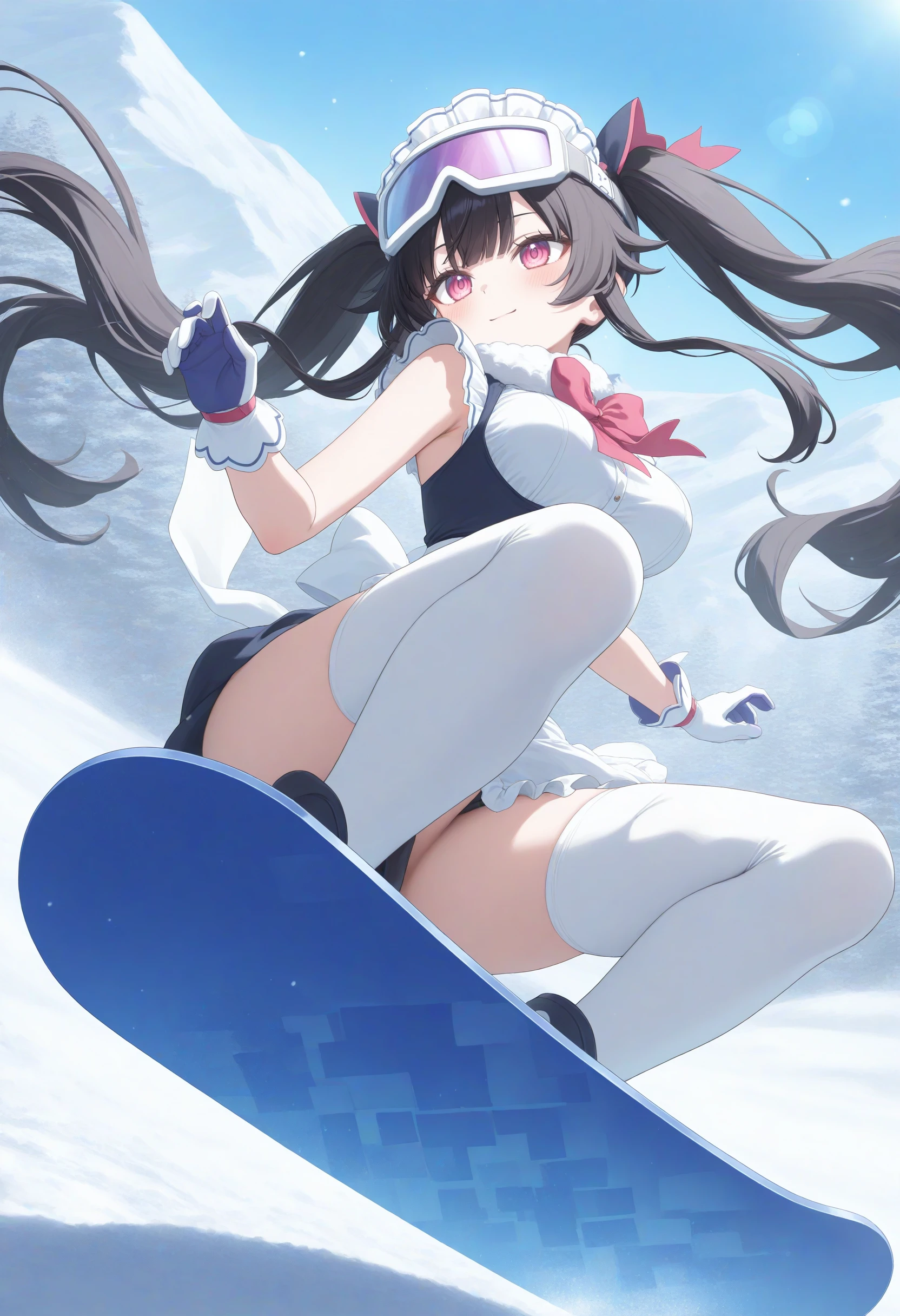元からボードを出して乗る所までは学習していますが足の位置もボードの大きさも滅茶苦茶なので矯正します。トリガーだけでも問題ありませんが snowboarding,snow, outdoors, winter, floating hair, sparkle, snowing, lens flare, jumping, splashing 辺りから必要なものと冬服を指定すればそれっぽいかと思います。