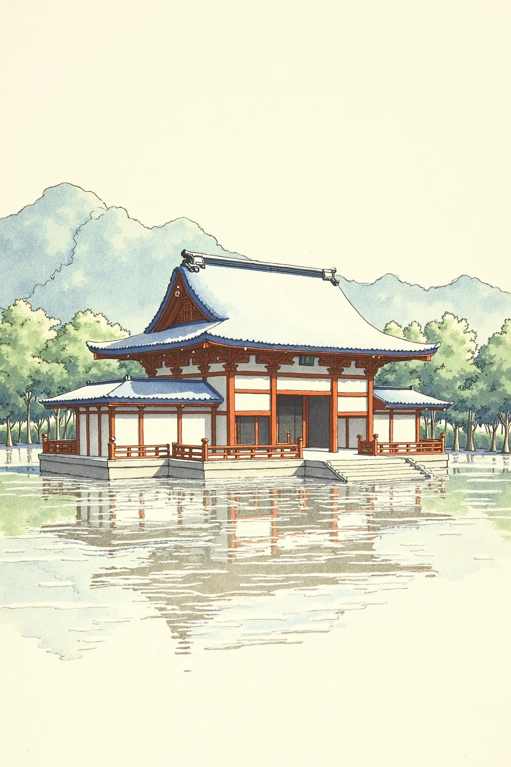 Depict traditional Japanese architecture, use ink - wash painting techniques, simplify forms, emphasize the artistic conception of empty pavilions and distant mountains.