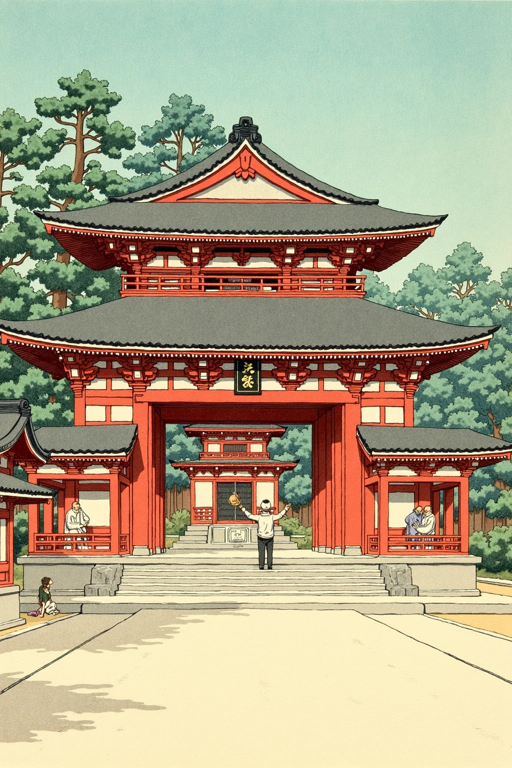 Depict traditional Japanese architecture, apply woodblock print style, highlight the red-orange tones of shrines, and present the sense of hierarchy of ancient buildings.