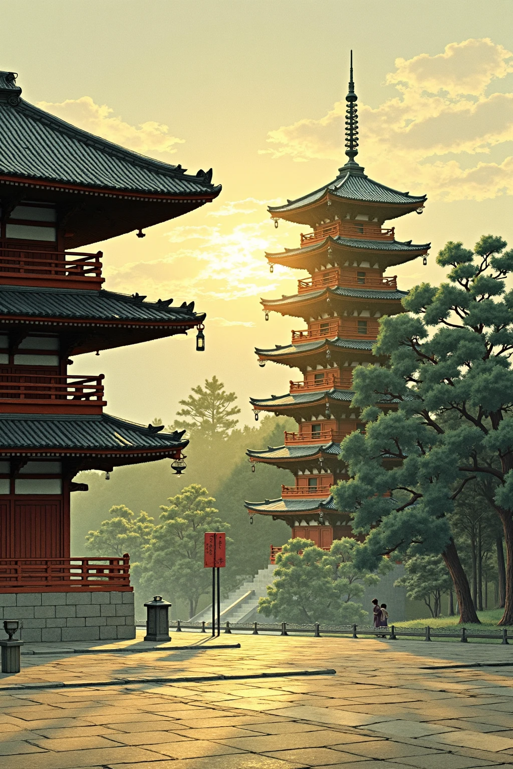 Depict traditional Japanese architecture, create a dawn - light effect, let the first ray of sunshine hit the pagoda, and use light color gradients to show the morning charm.