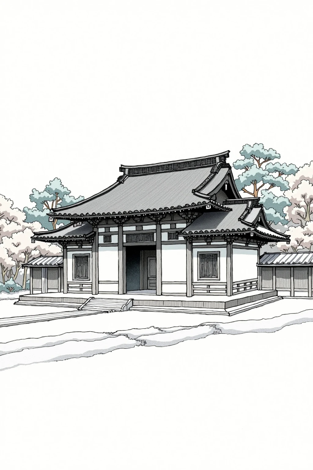 Depict traditional Japanese architecture, use a minimalist color palette, with only black, white, and gray to outline the solemnity of ancient temples.