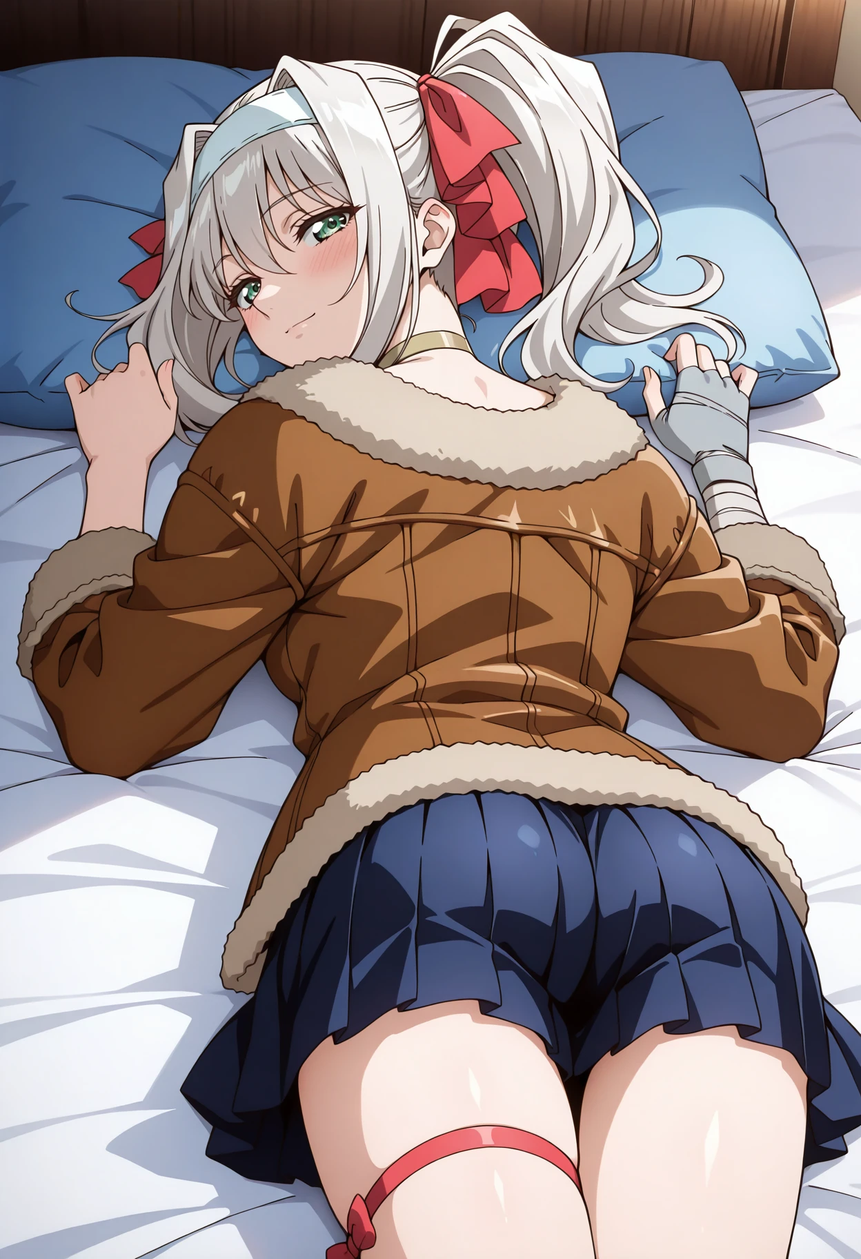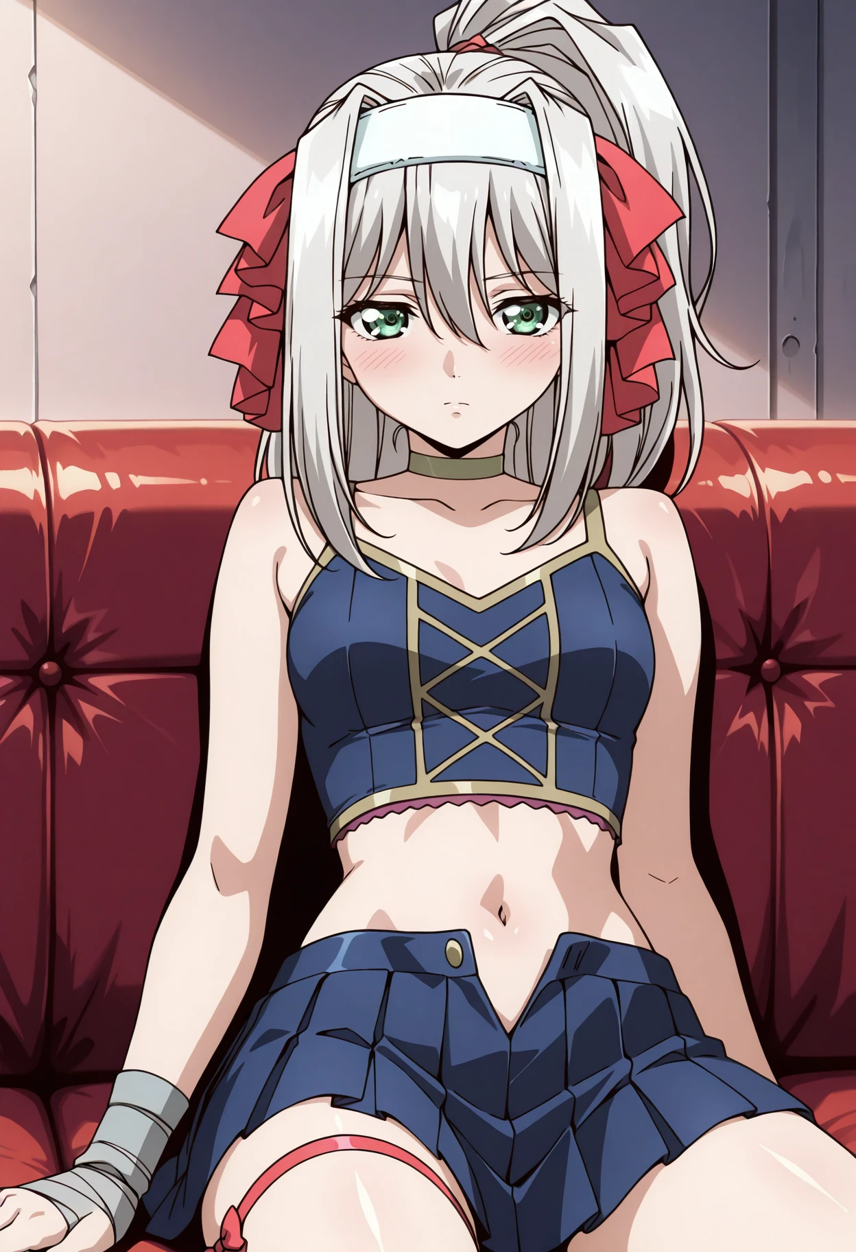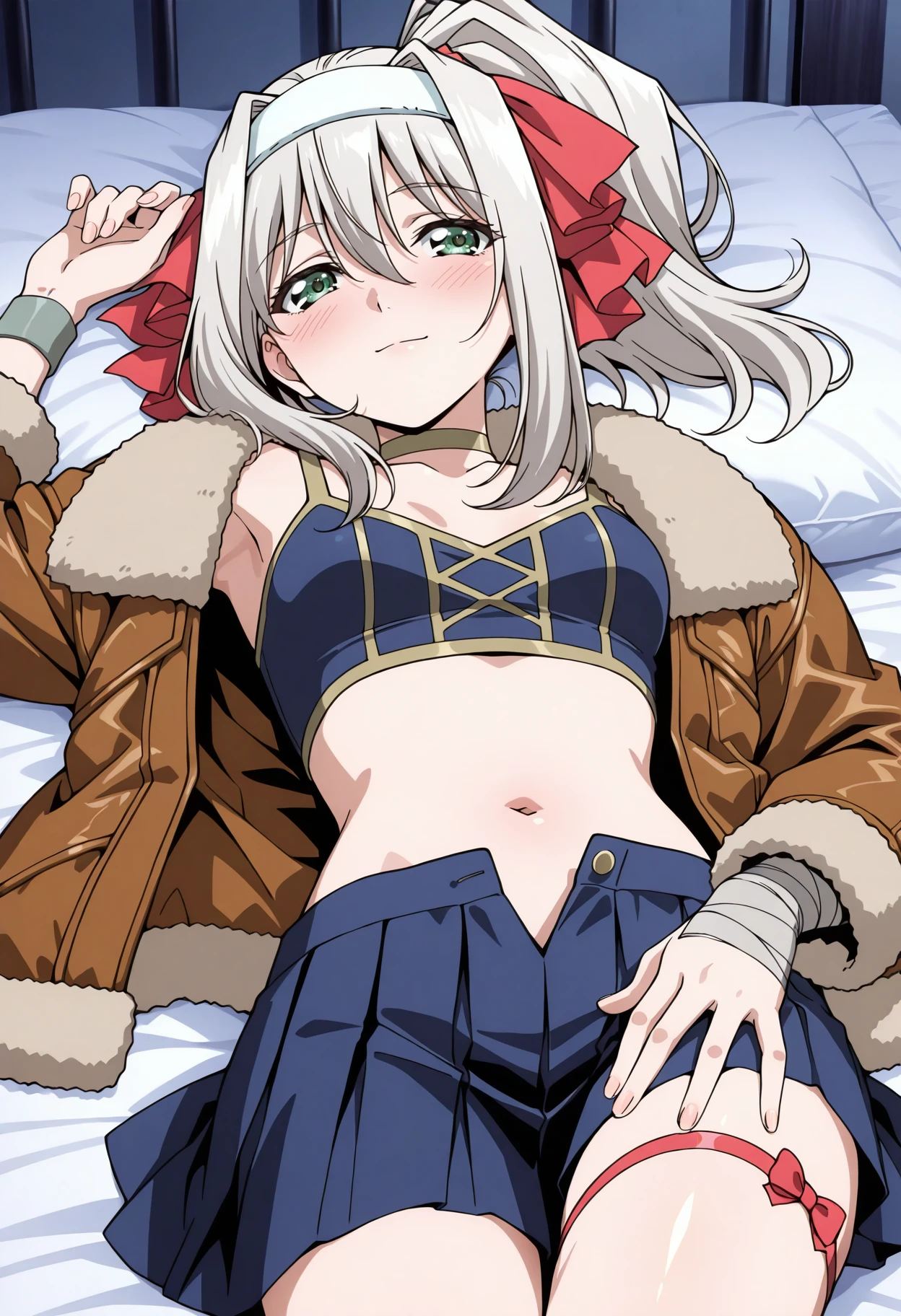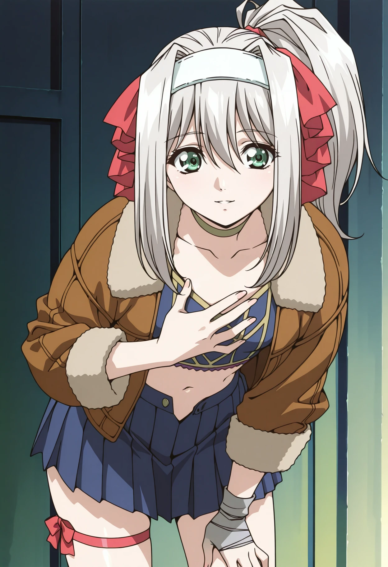 Base: honoka_d, 1girl, anime coloring, solo, long hair, ponytail, white hair, white hairband, hair between eyes, red hair ribbon, green eyes, choker, brown fur-trimmed jacket, crop top, midriff, navel, blue unbuttoned pleated skirt, single thigh ribbon, single bandaged hand, open jacket, miniskirt, small breasts,