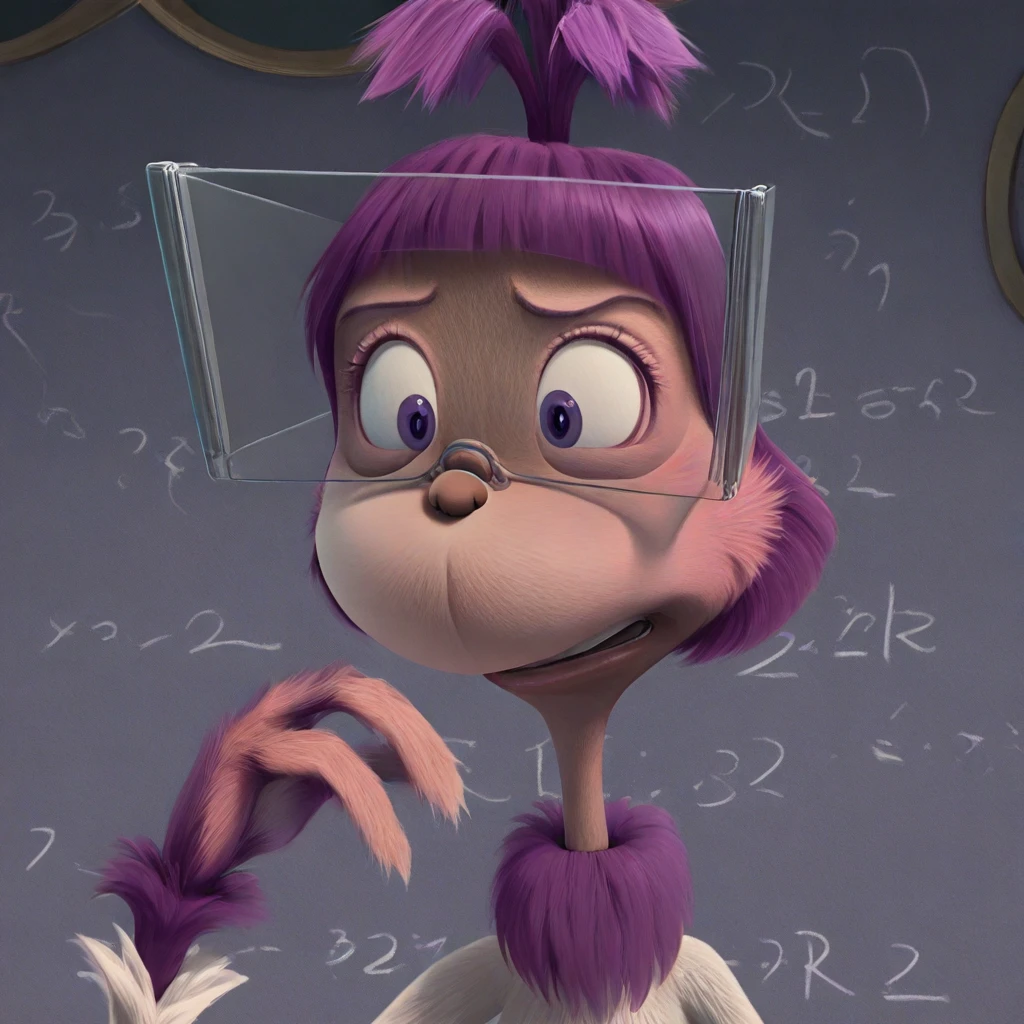 who female, solo, light fur body, purple hair, gravity defying illogical hair, dark lavender eyes, light rounded nose, thin, purple neck tuft, purple neck ruff, purple wrist tufts, purple fur around neck, long fingers, light fur hands, four fingers, long purple fur feet, long white lab_coat, large clear safety glasses,