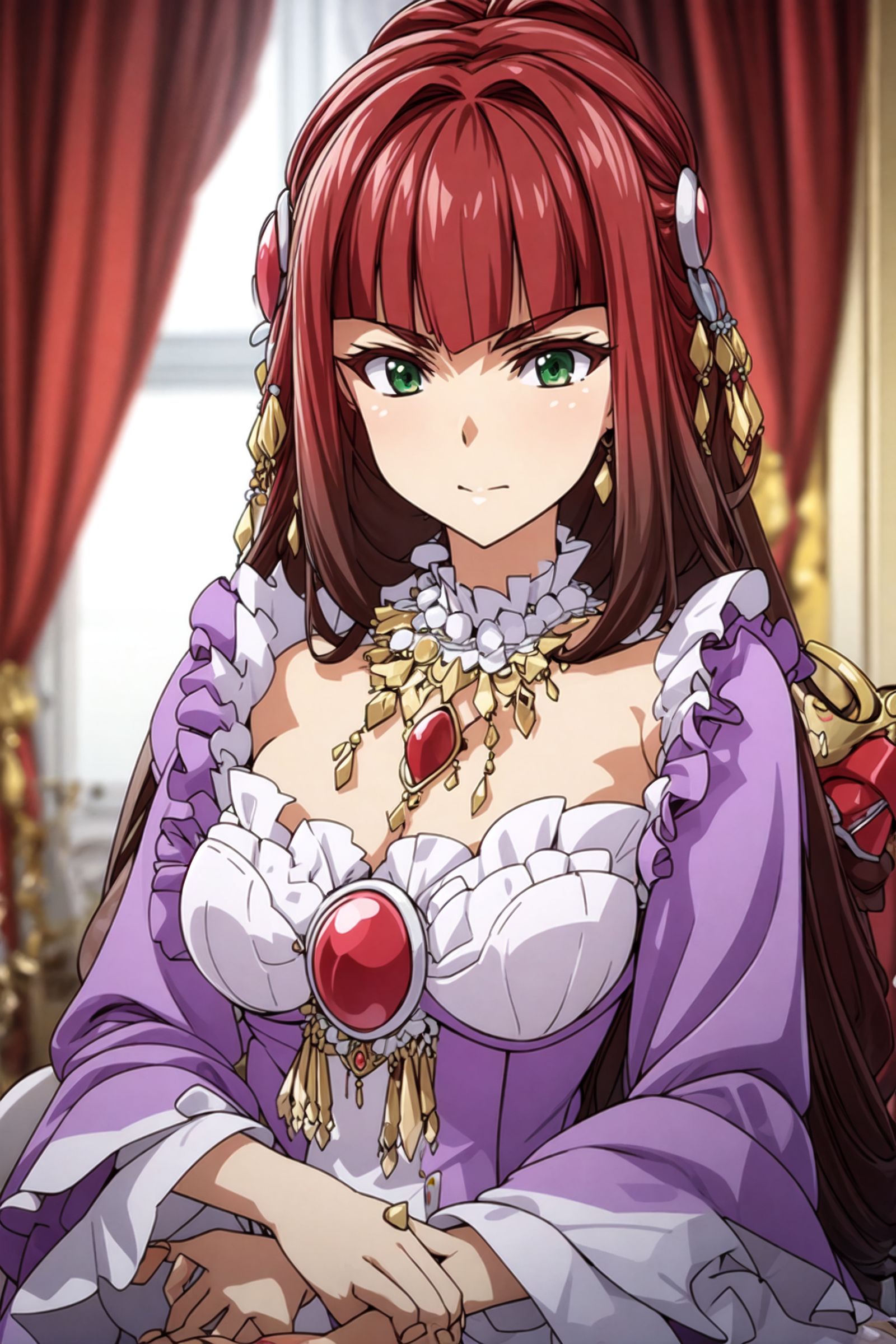 Trigger Words: hair, green eyes, Long hair, purple dress.