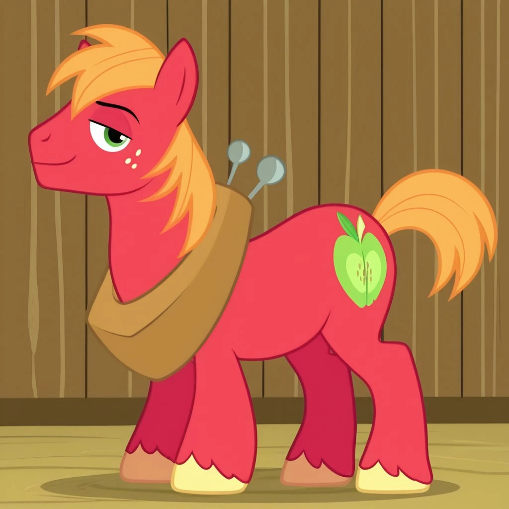 bigmac, red skin, horse, yellow hair, green eyes, 2D, male, cartoon, cutie mark, flat colors, freckles, neck brace, yellow tail, white hooves, horse ears, black eyebrows,