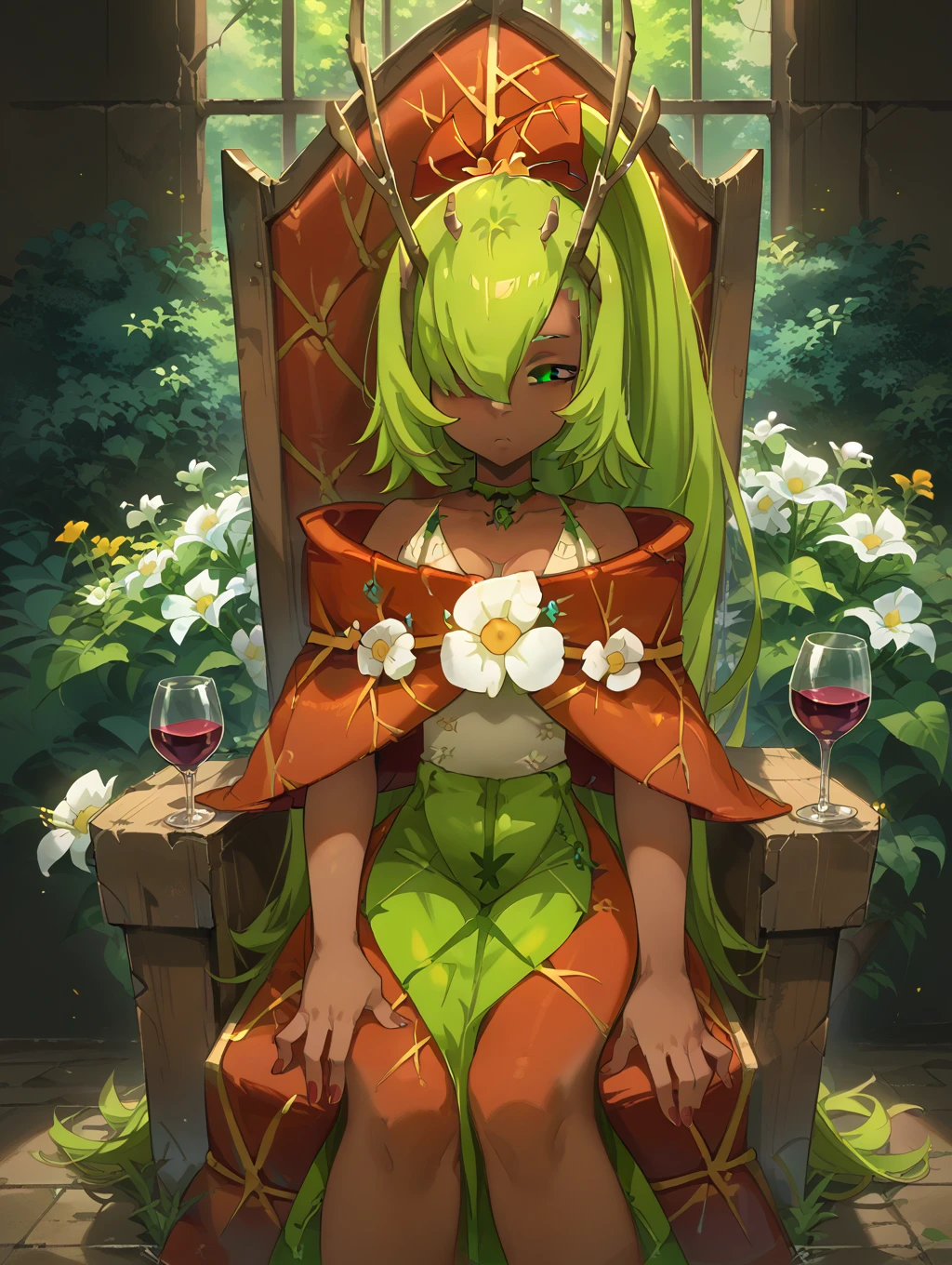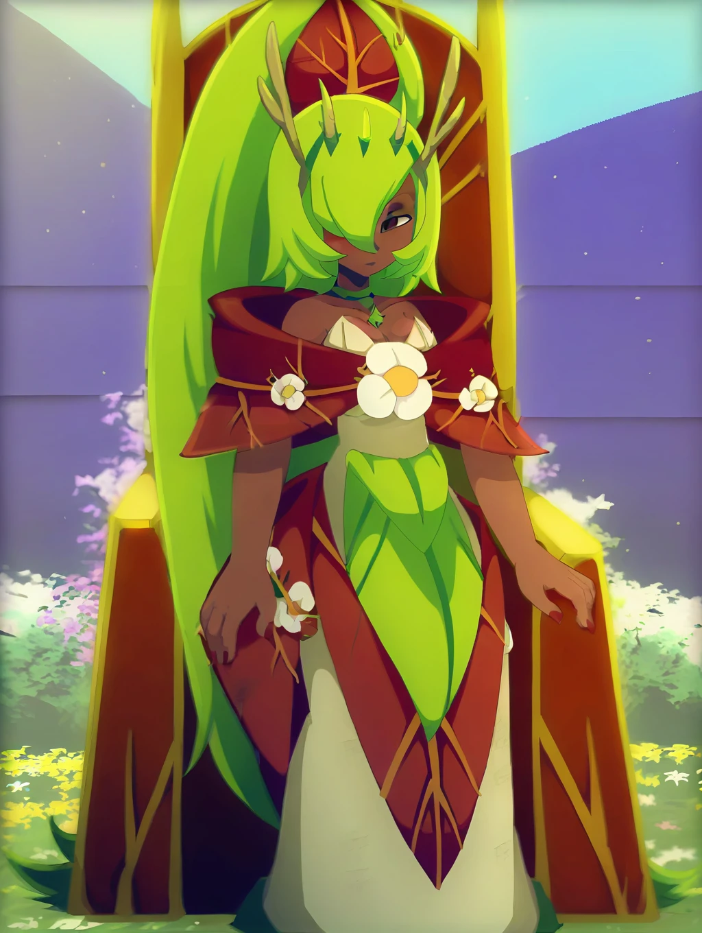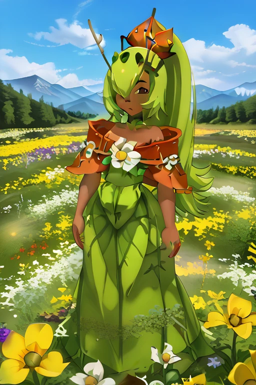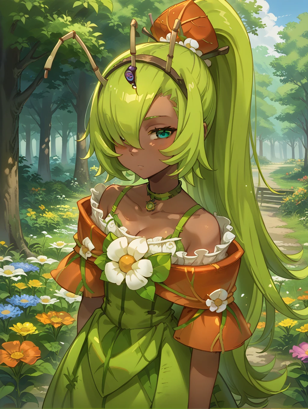 1girl, long green hair, dark skin, hair over one eye, choker, brown eyes, ponytail, low neckline, wooden antennae, flower in dress