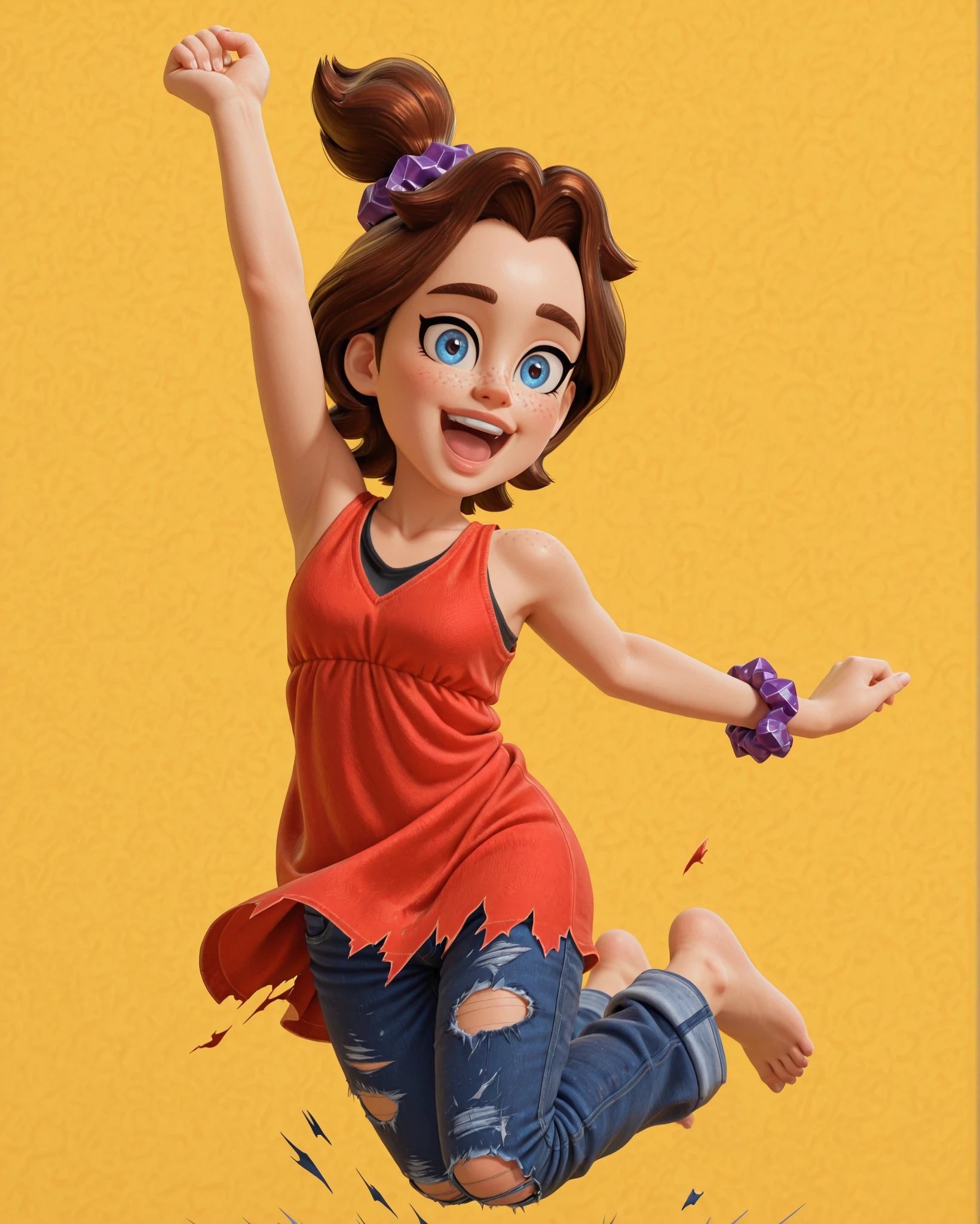 blue pants, jeans, red dress, sleeveless, purple bracelet, barefoot, tank top, torn clothes