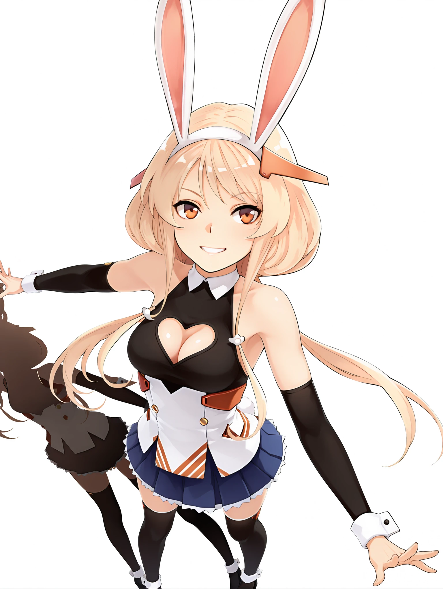 b_clothes,heart cutout,wrist cuffs,detached sleeves,blue skirt,black thighhighs,miniskirt,black footwear,