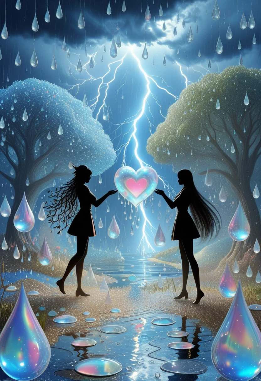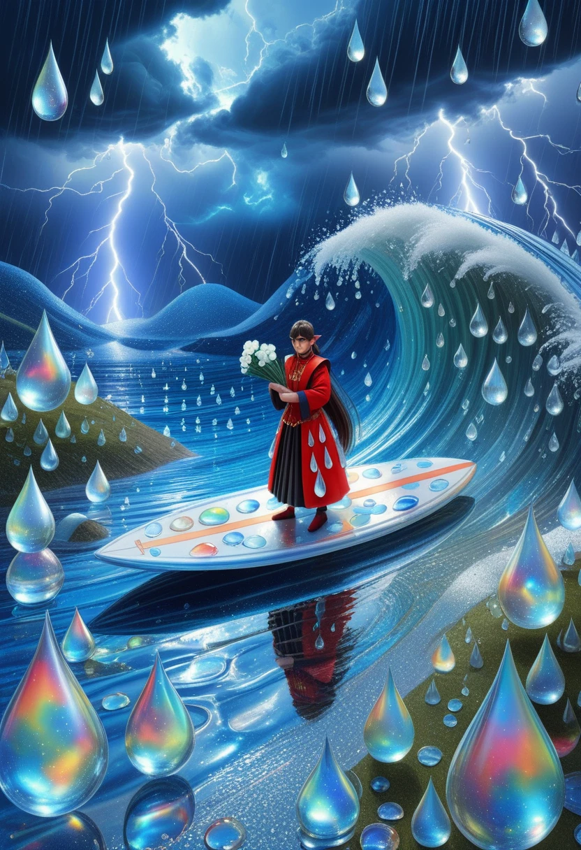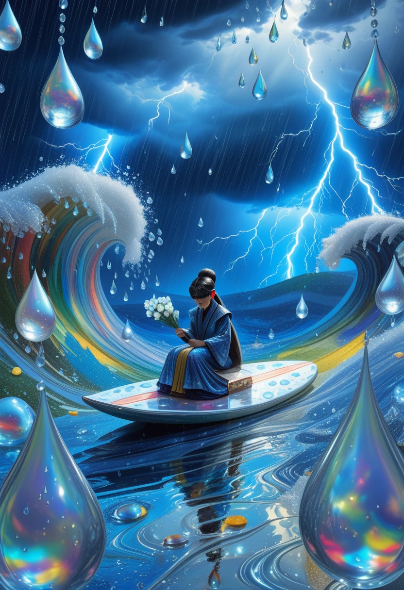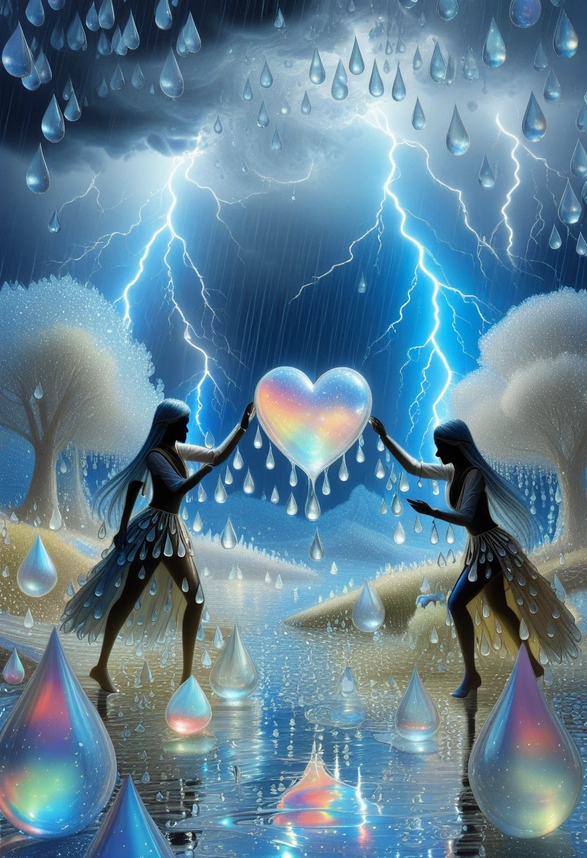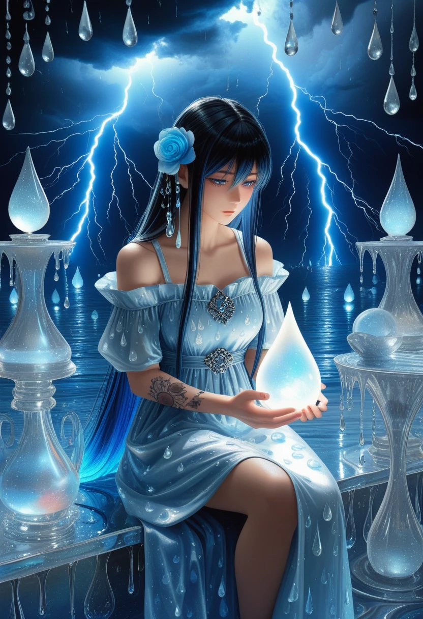 teardrop-shaped objects, elongated pear forms, translucent watery surfaces, dripping fluid edges, blue-cyan color palette, glassy reflective textures, cascading droplet landscapes, melancholic glossy sheen