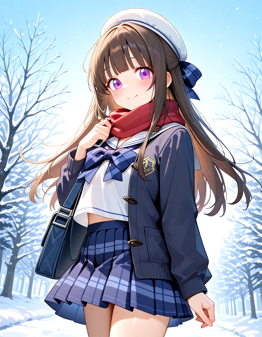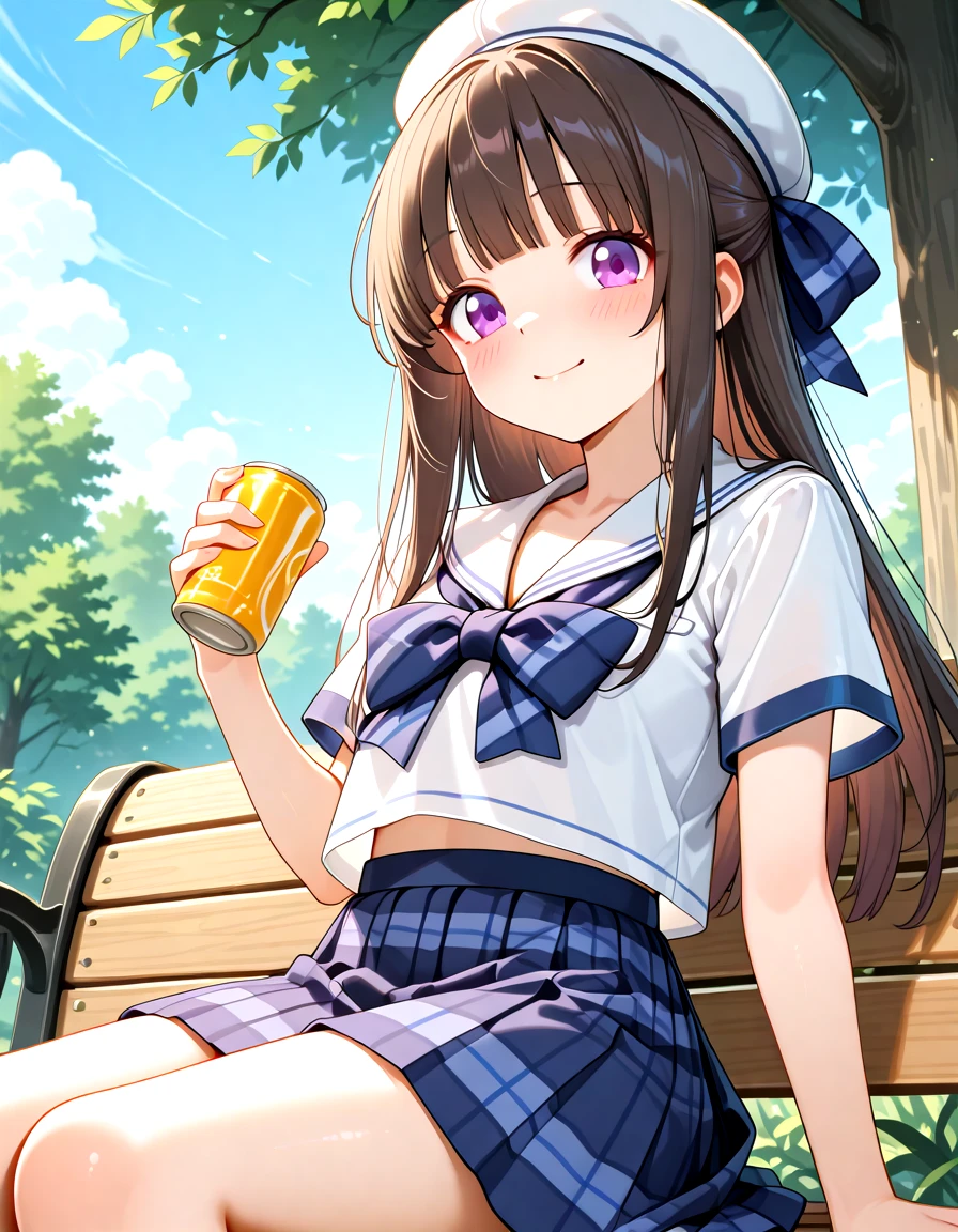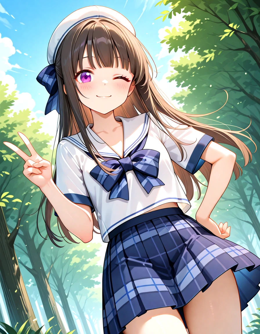 collarbone, midriff peek, bare legs, school uniform, serafuku, pleated skirt, plaid skirt, blue skirt, white shirt, short sleeves, white sailor collar, plaid bow, plaid bowtie, plaid ribbon, blue bowtie, blue bow, ribbon, beret, white headwearschool bagDescription