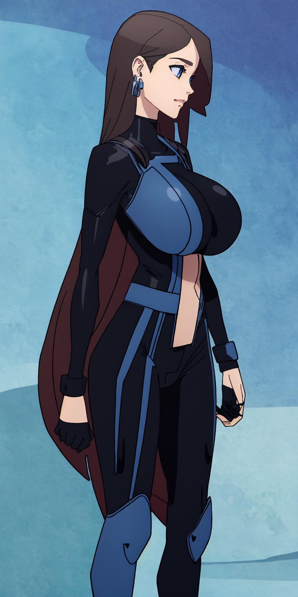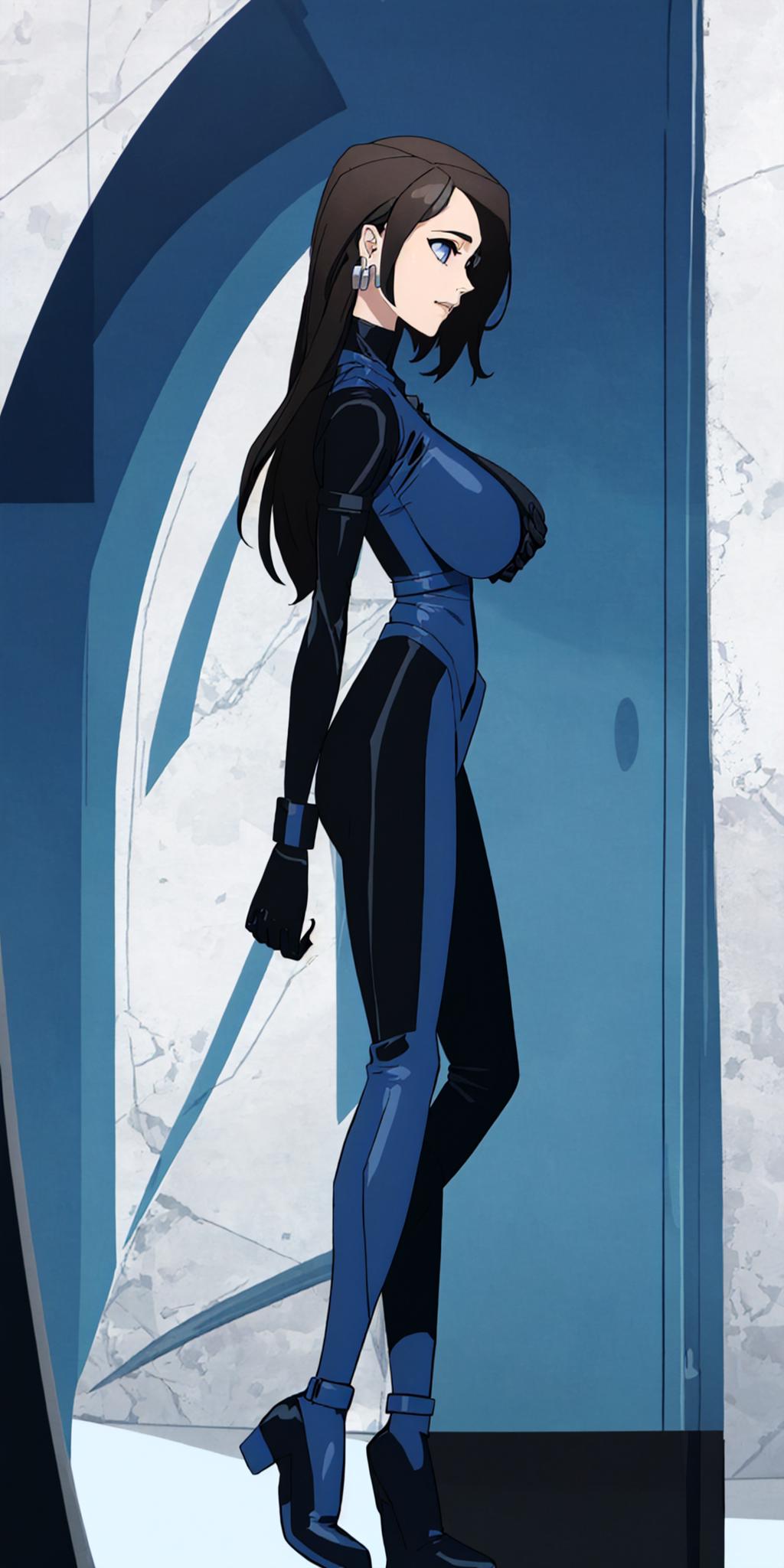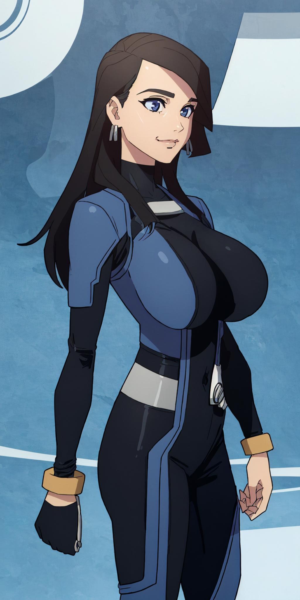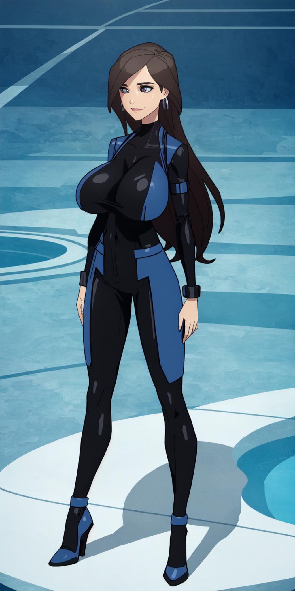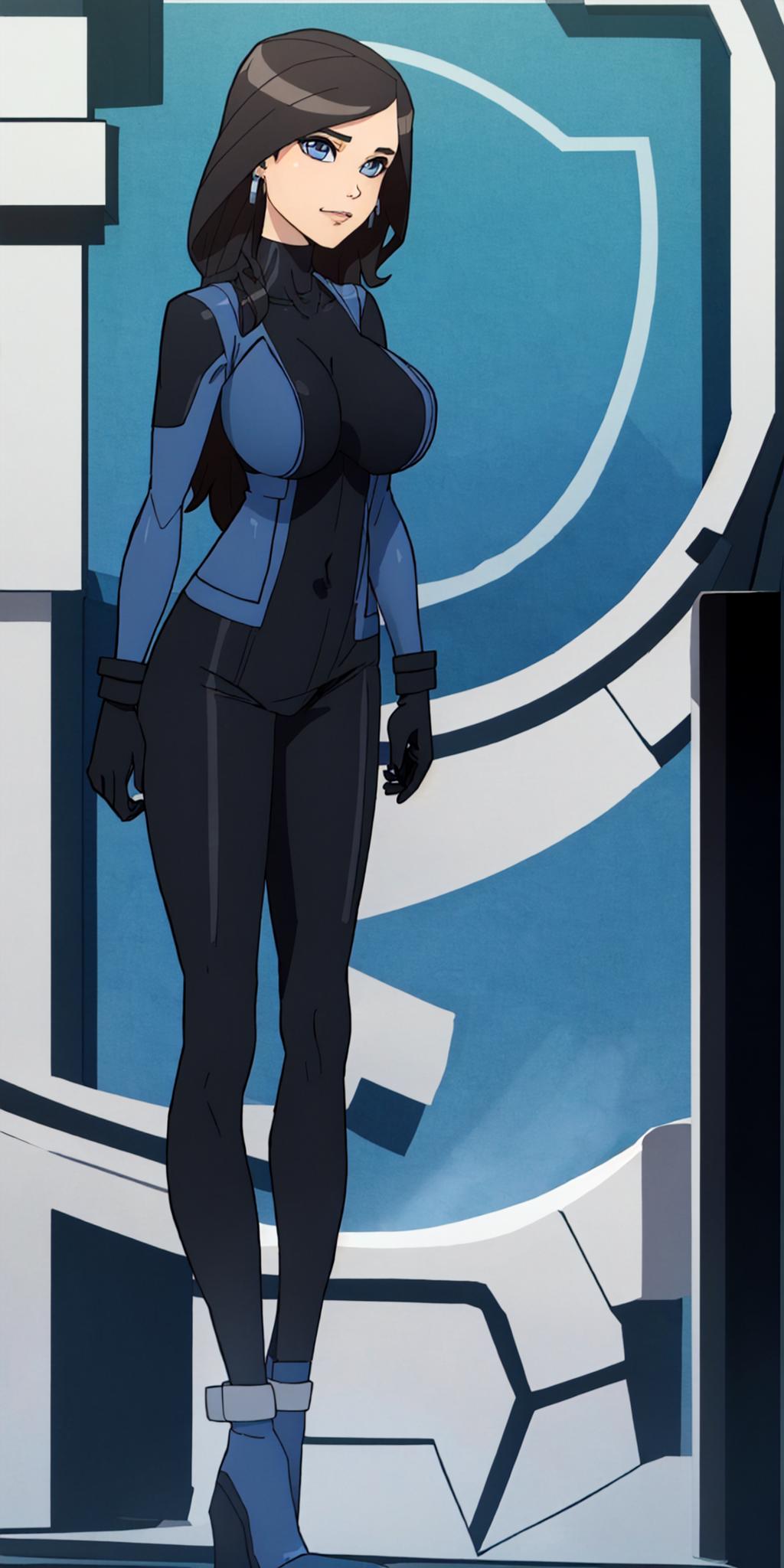 Other prompts : short hair, brown hair, blue eyes, dark skin, large breasts, earrings, blue bodysuit, lips, blue sclera