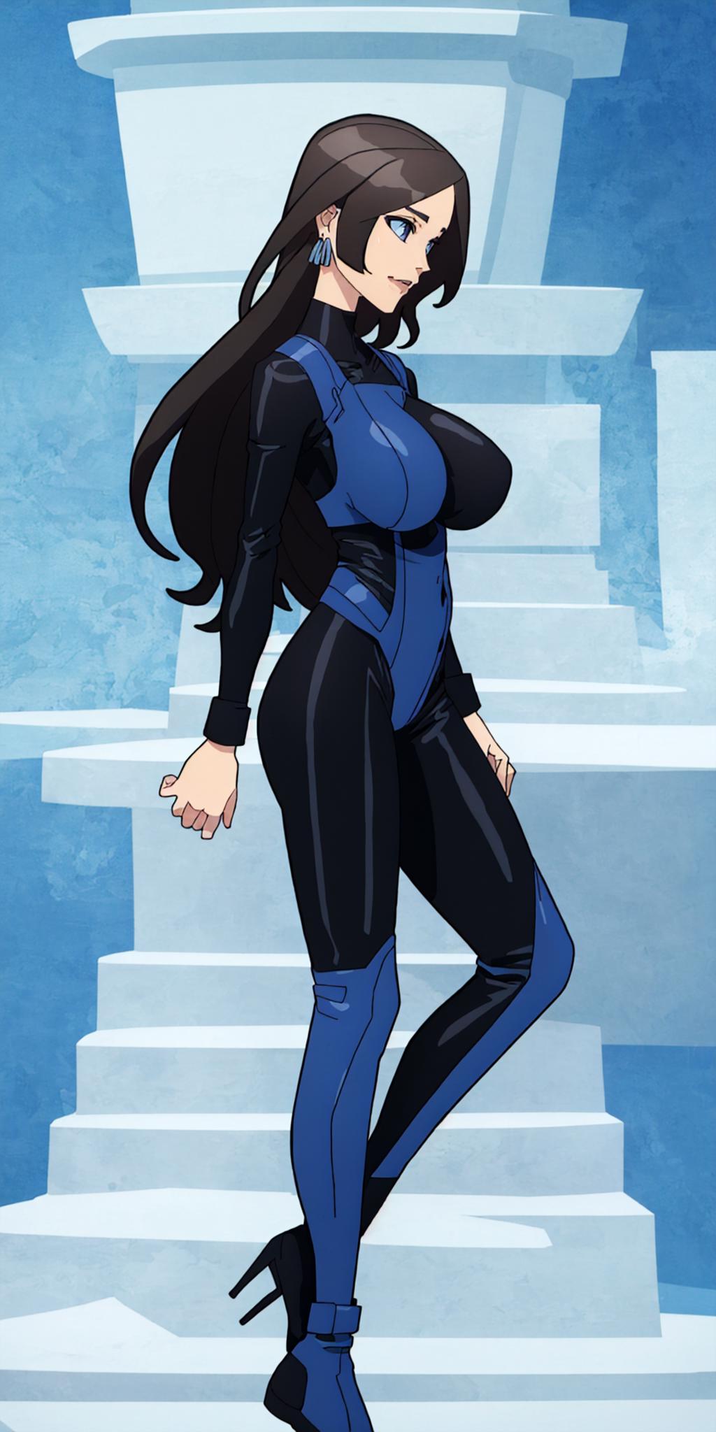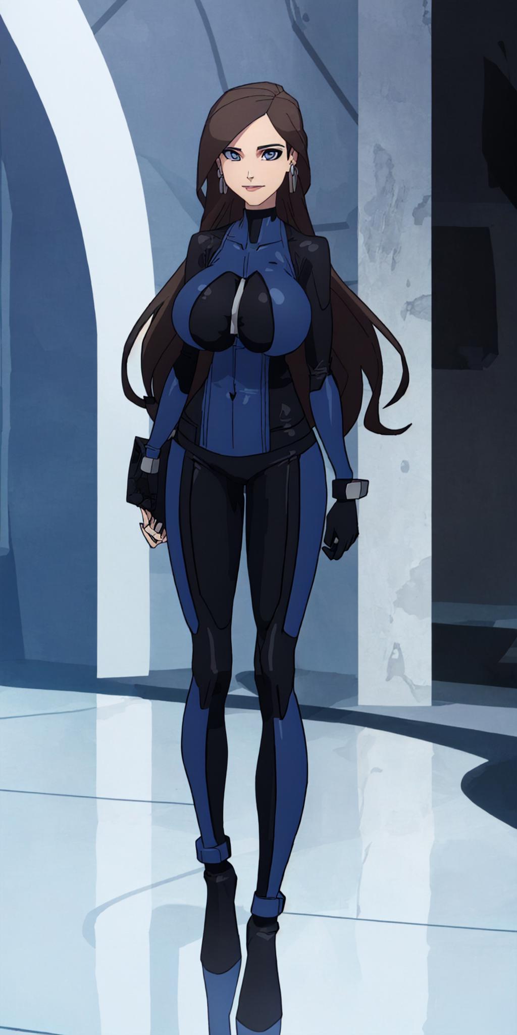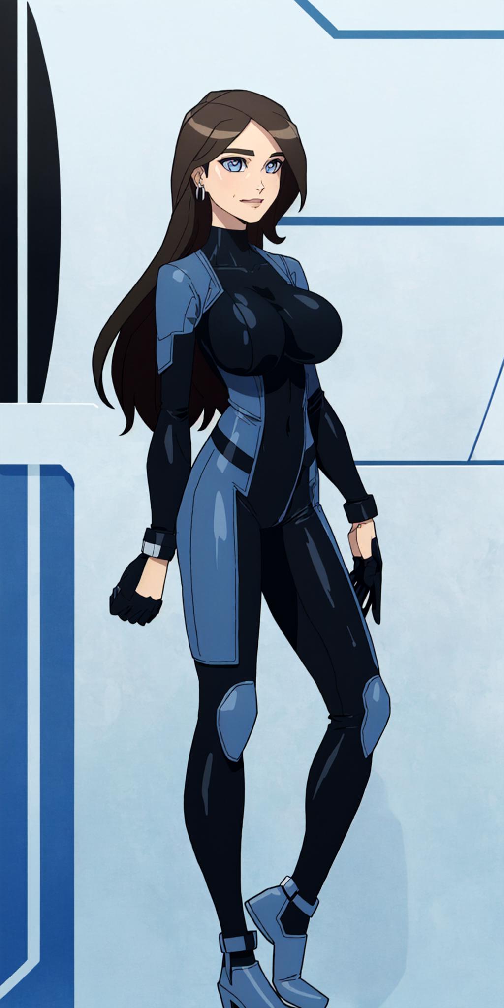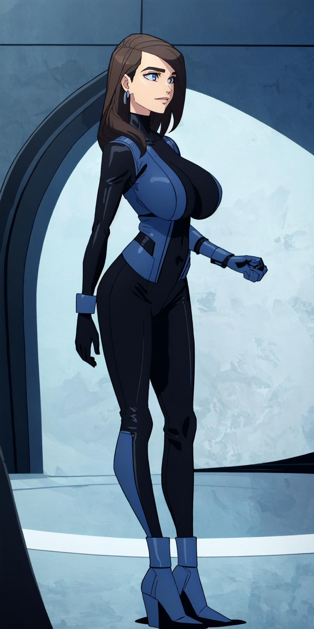 Other prompts : short hair, brown hair, blue eyes, dark skin, large breasts, earrings, blue bodysuit, lips, blue sclera