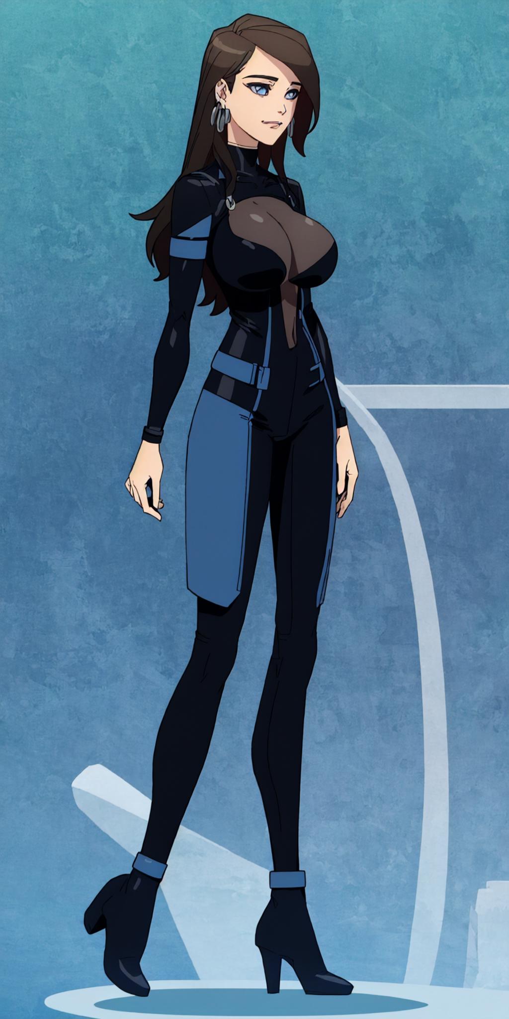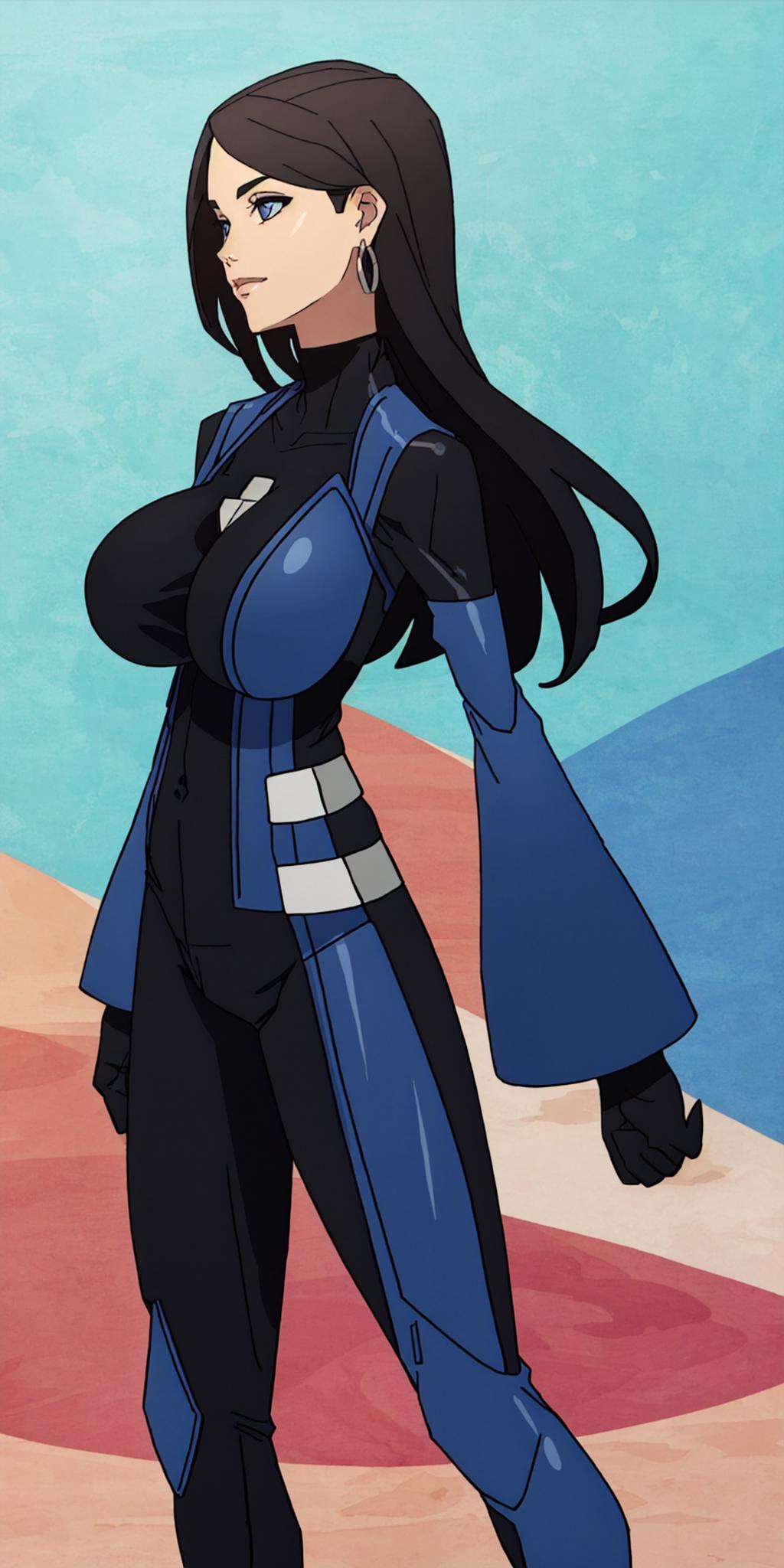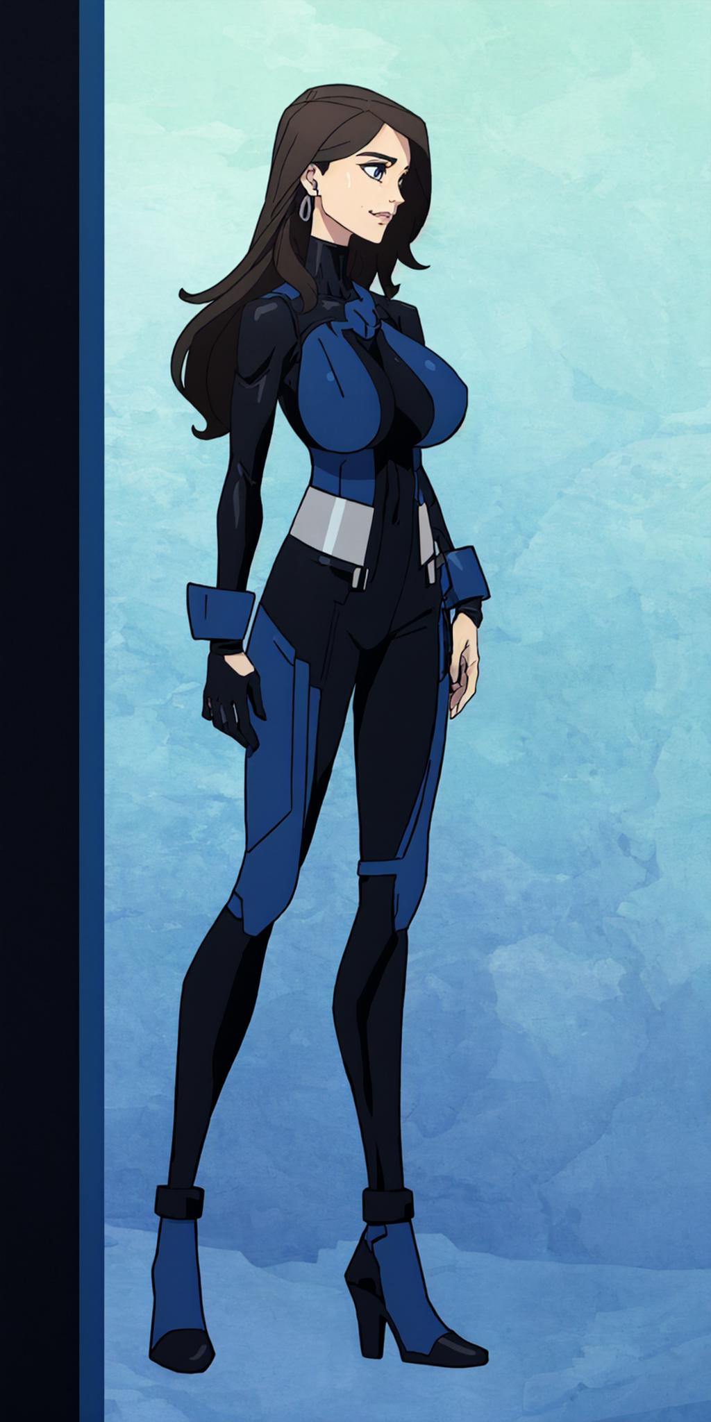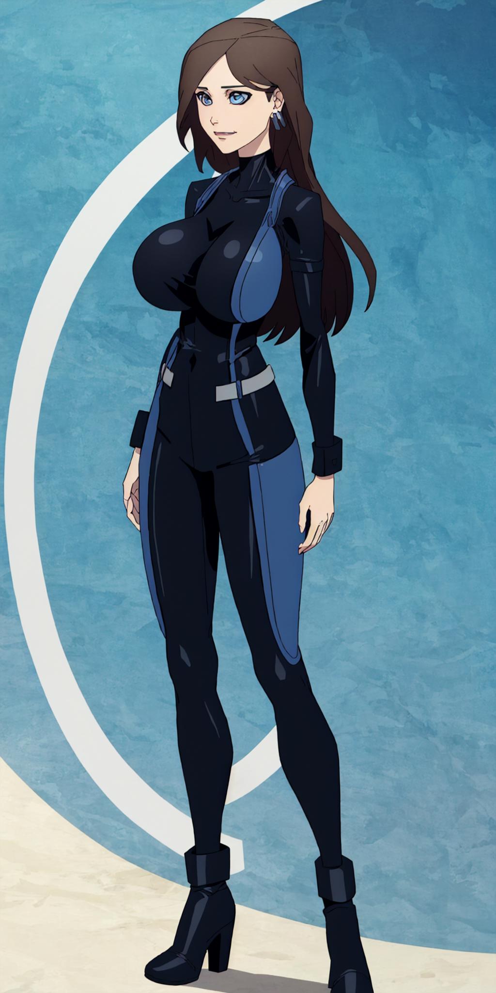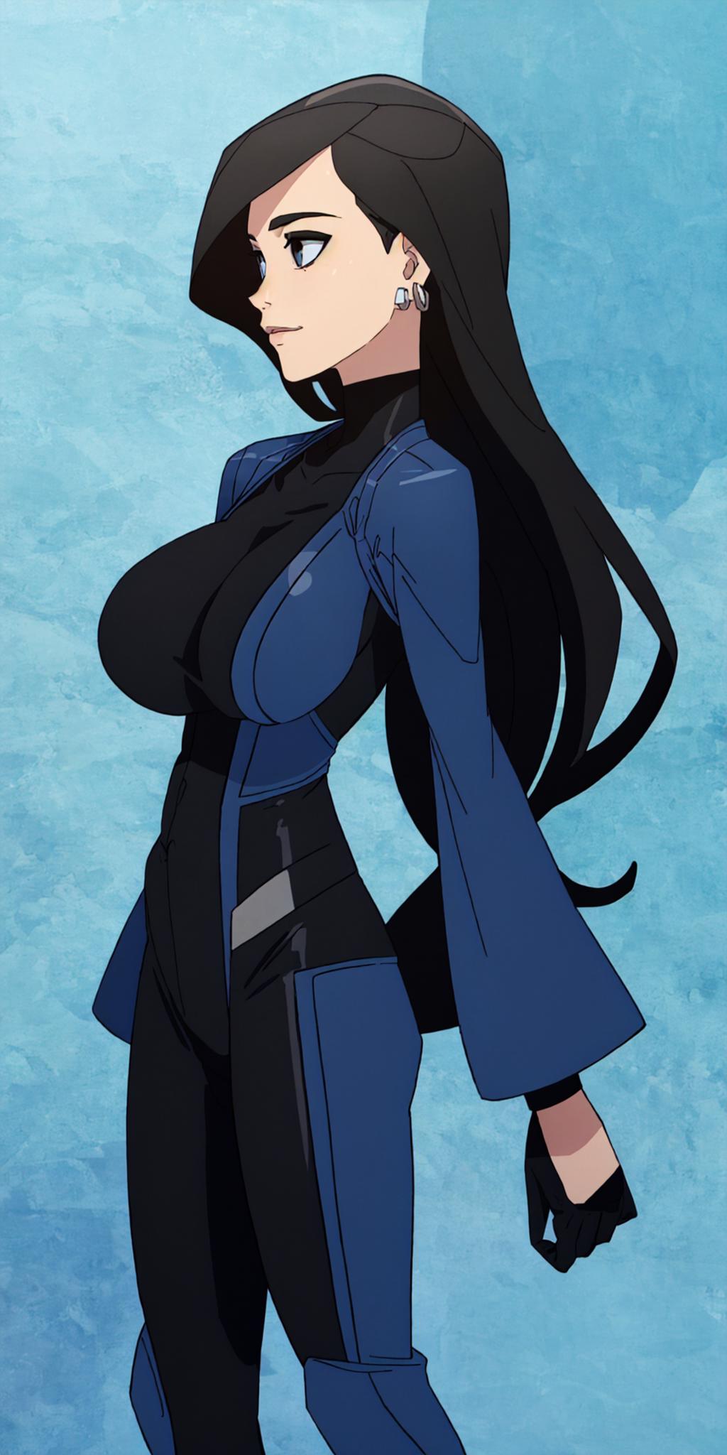 Other prompts : short hair, brown hair, blue eyes, dark skin, large breasts, earrings, blue bodysuit, lips, blue sclera