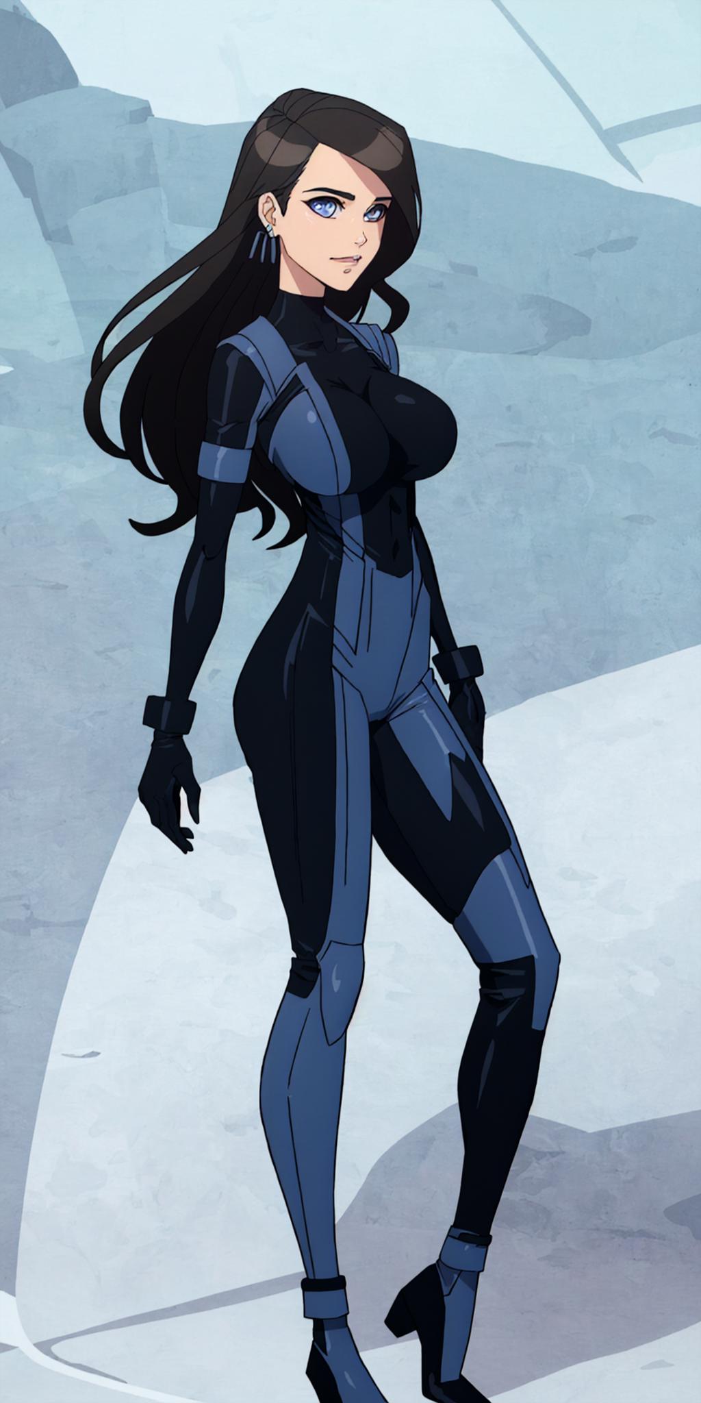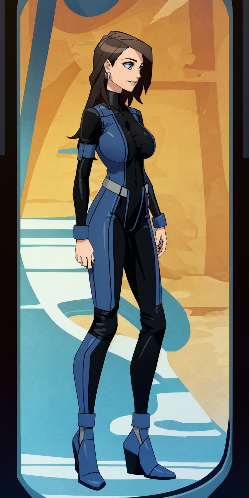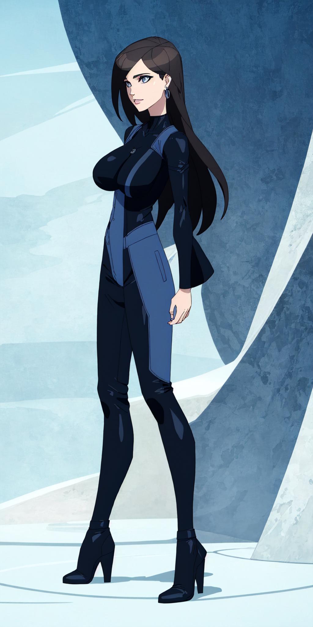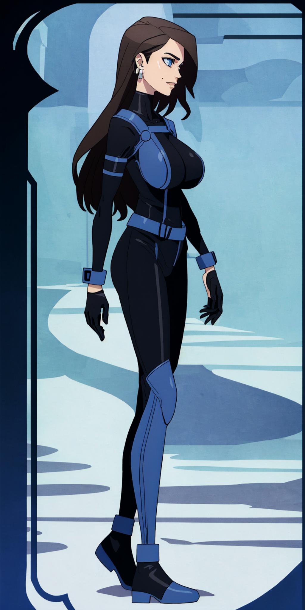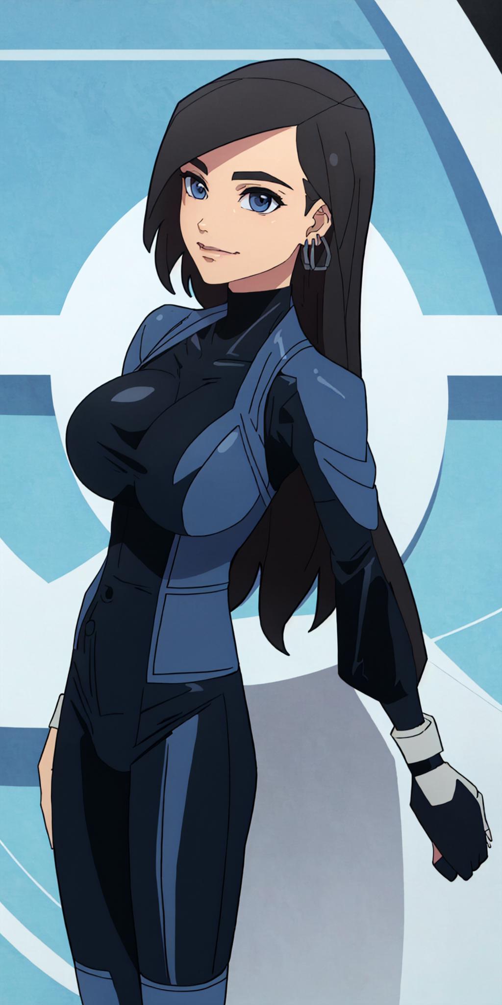 Other prompts : short hair, brown hair, blue eyes, dark skin, large breasts, earrings, blue bodysuit, lips, blue sclera