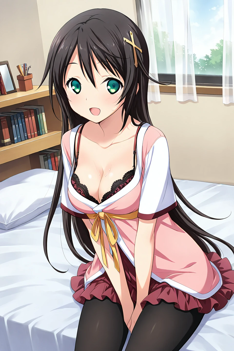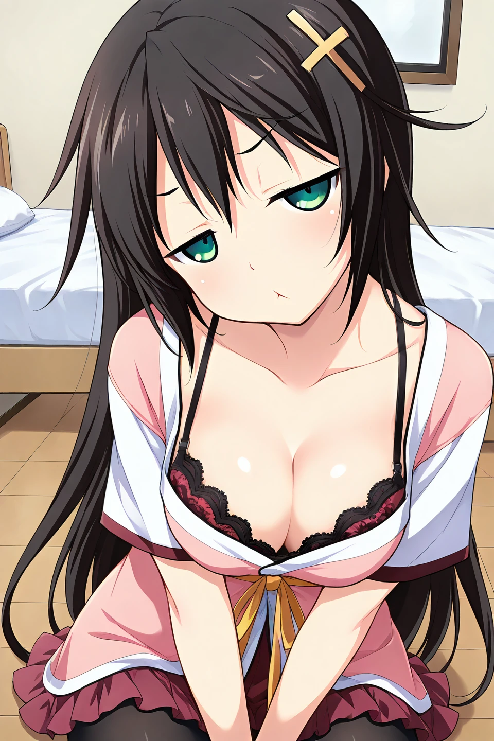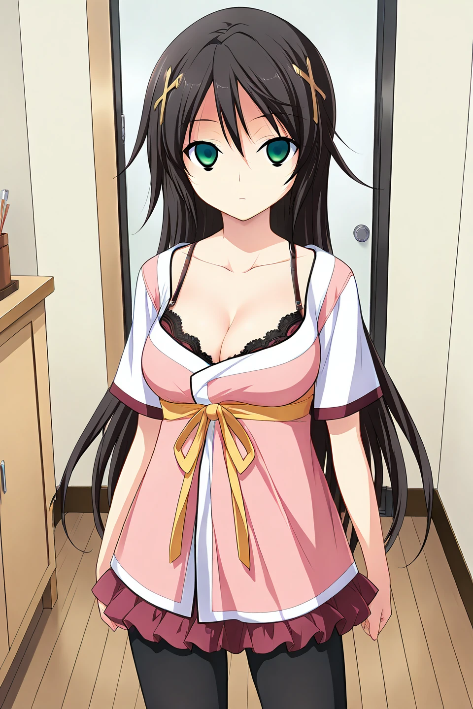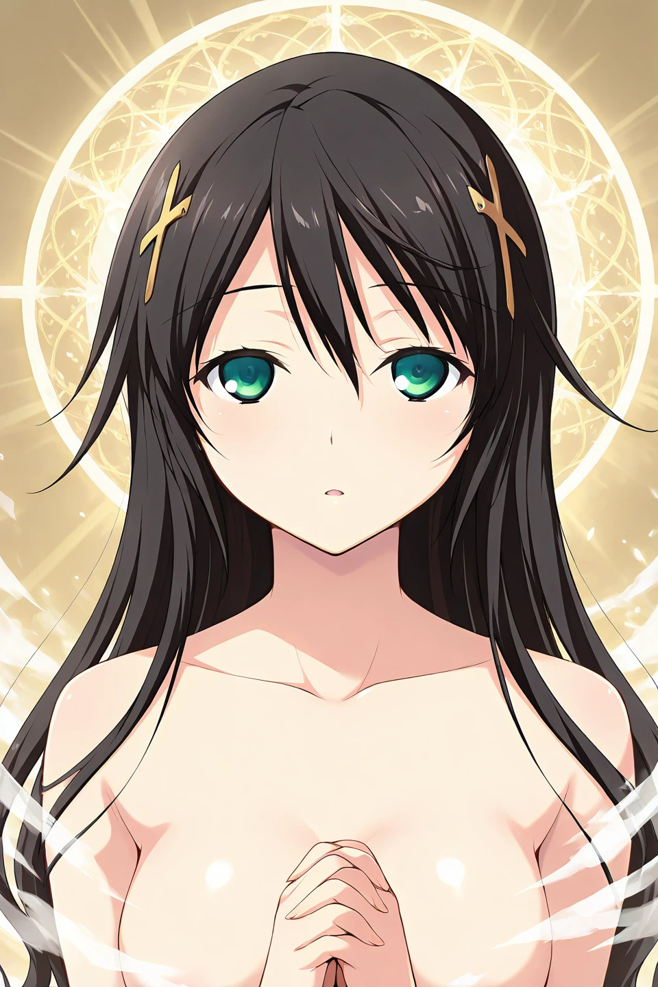 kuraki ena, 1girl, solo, green eyes, black hair, very long hair, hairclip, cross, hair ornament, cross hair ornament, x hair ornament