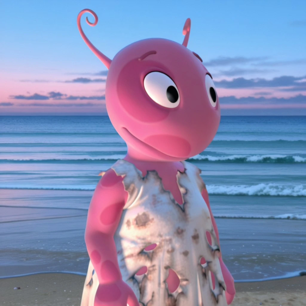 UniquaByv2il, anthro, female, light-pink skin, spotted skin, black eyes, antennae, pink polka-dot overalls