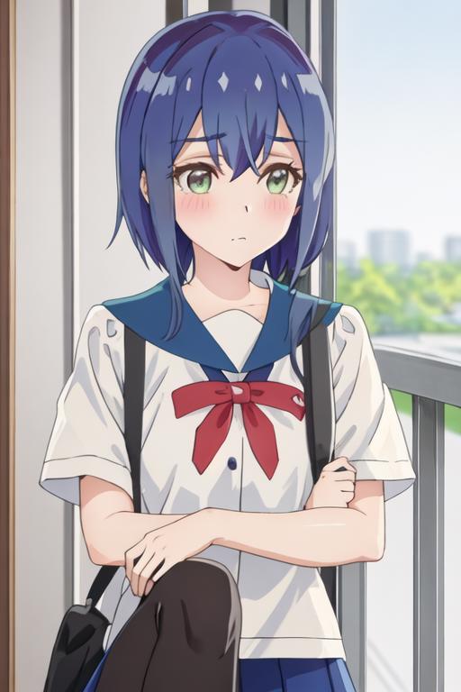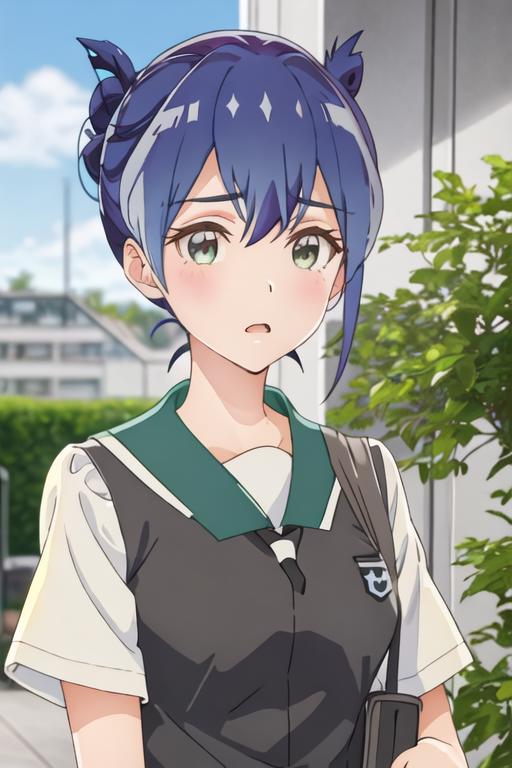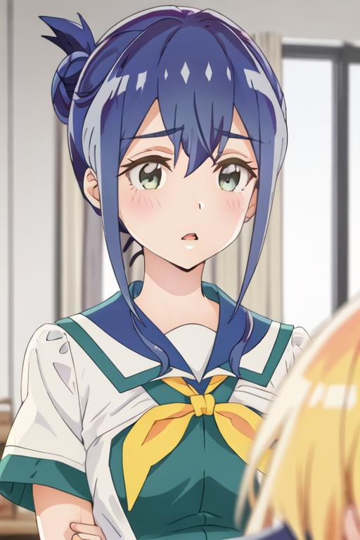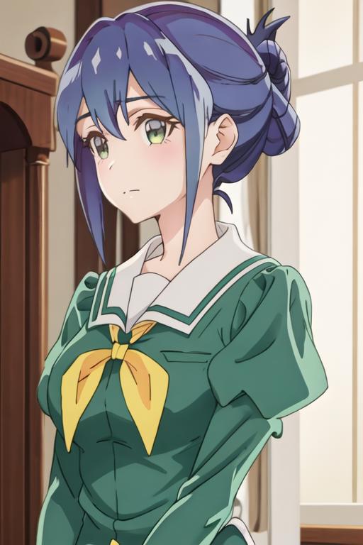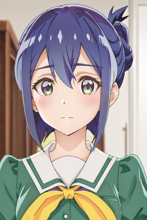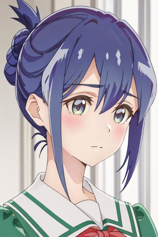 The trigger word is mamiya_kanoko_watashinoyuriwaoshigotodesu, and the recommended tags are best quality, masterpiece, highres, solo, {mamiya_kanoko_watashinoyuriwaoshigotodesu:1.15}, blue_hair, green_eyes, blush, bangs, closed_mouth, short_hair, purple_hair.