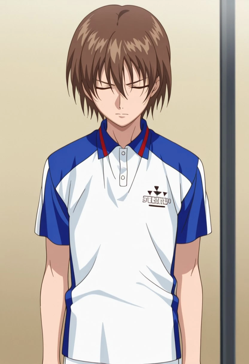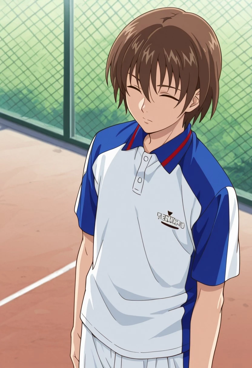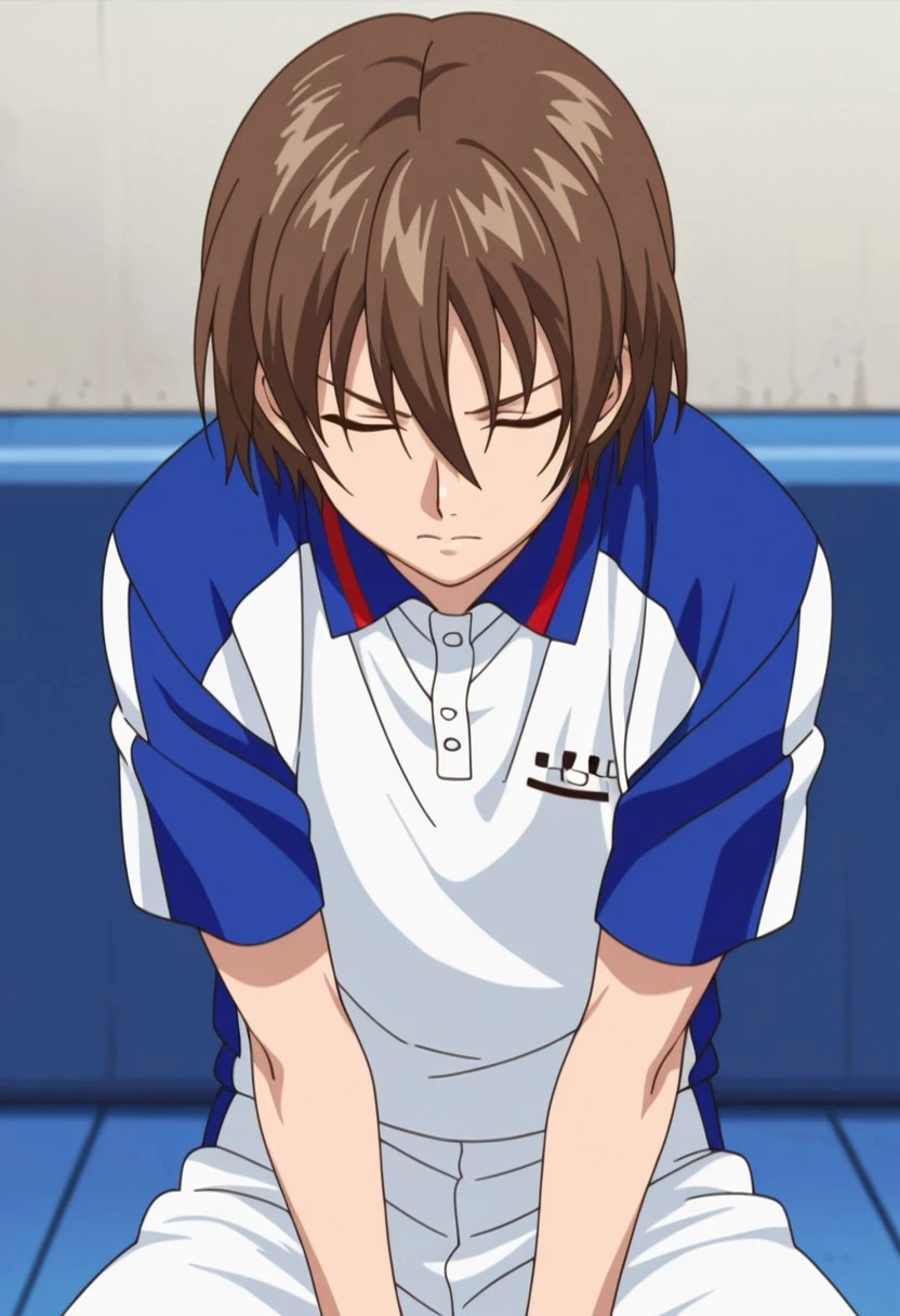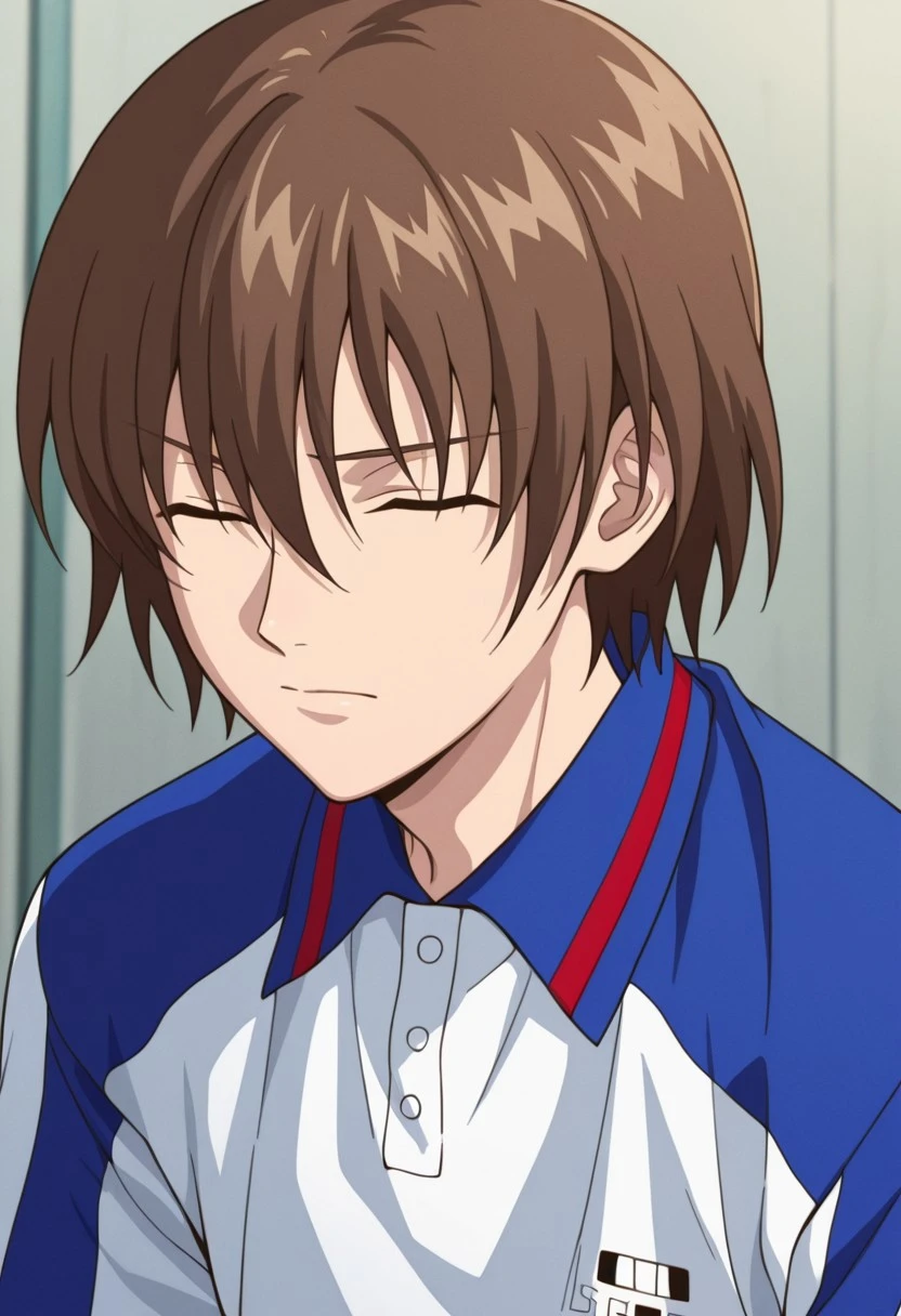 1boy, male focus, solo, closed eyes, brown hair, hair between eyes, tennis uniform, track jacket, white and blue jacket, partially unzipped, polo shirt, blue pants, sneakers,