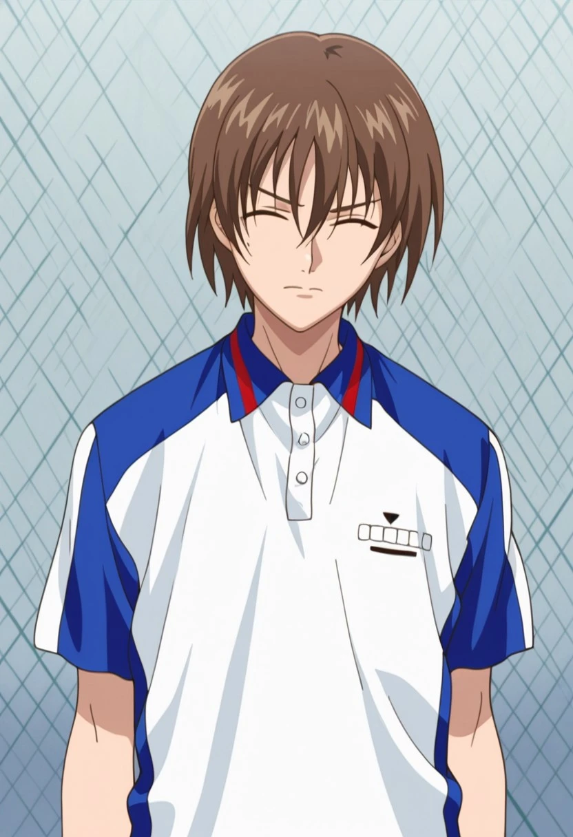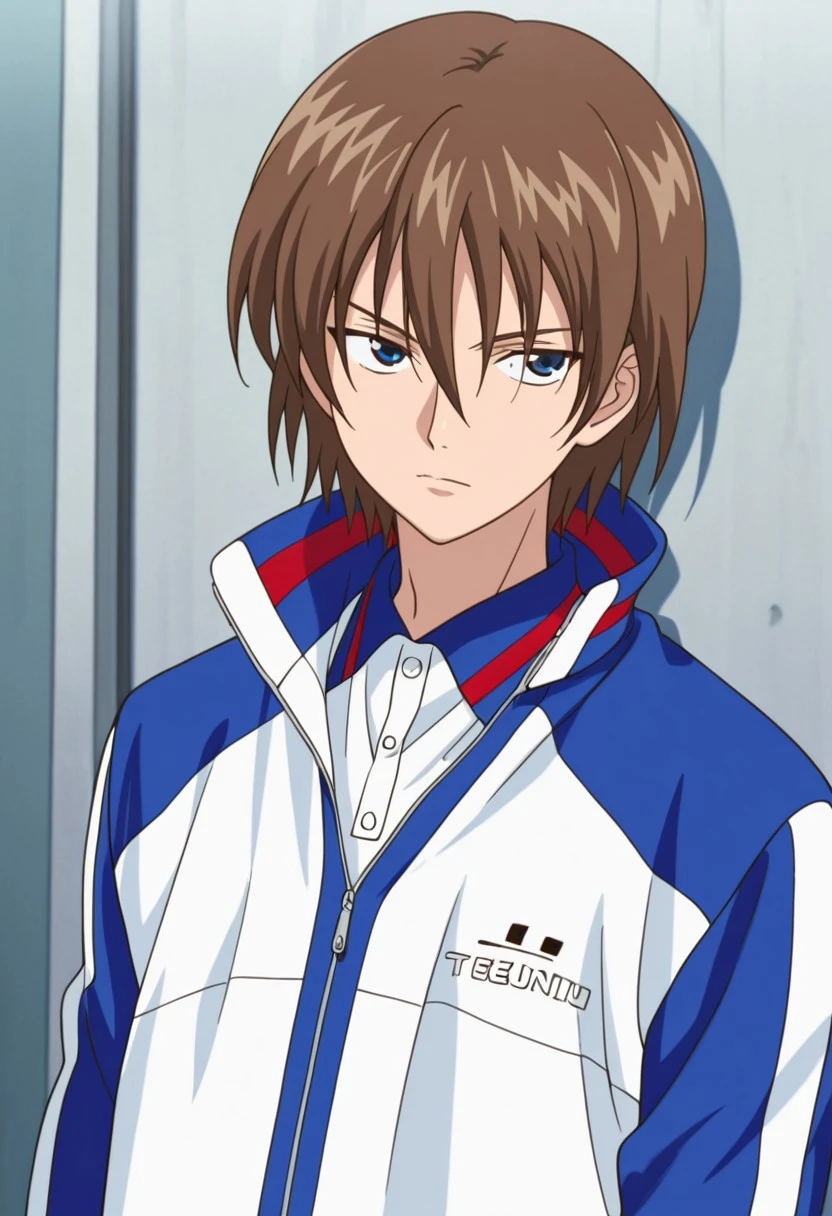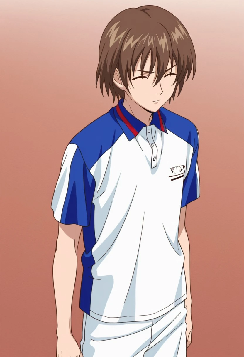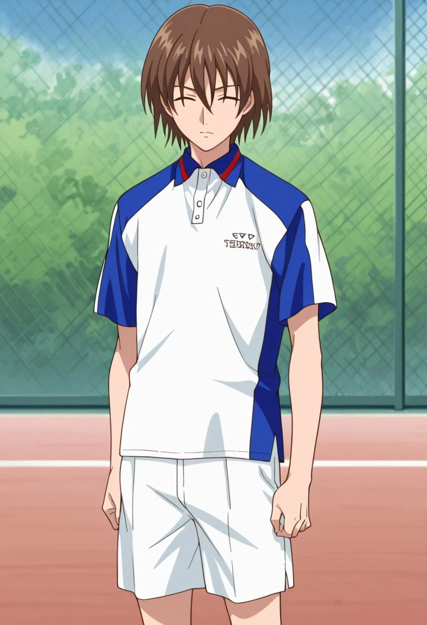 1boy, male focus, solo, closed eyes, brown hair, hair between eyes, tennis uniform, track jacket, white and blue jacket, partially unzipped, polo shirt, blue pants, sneakers,