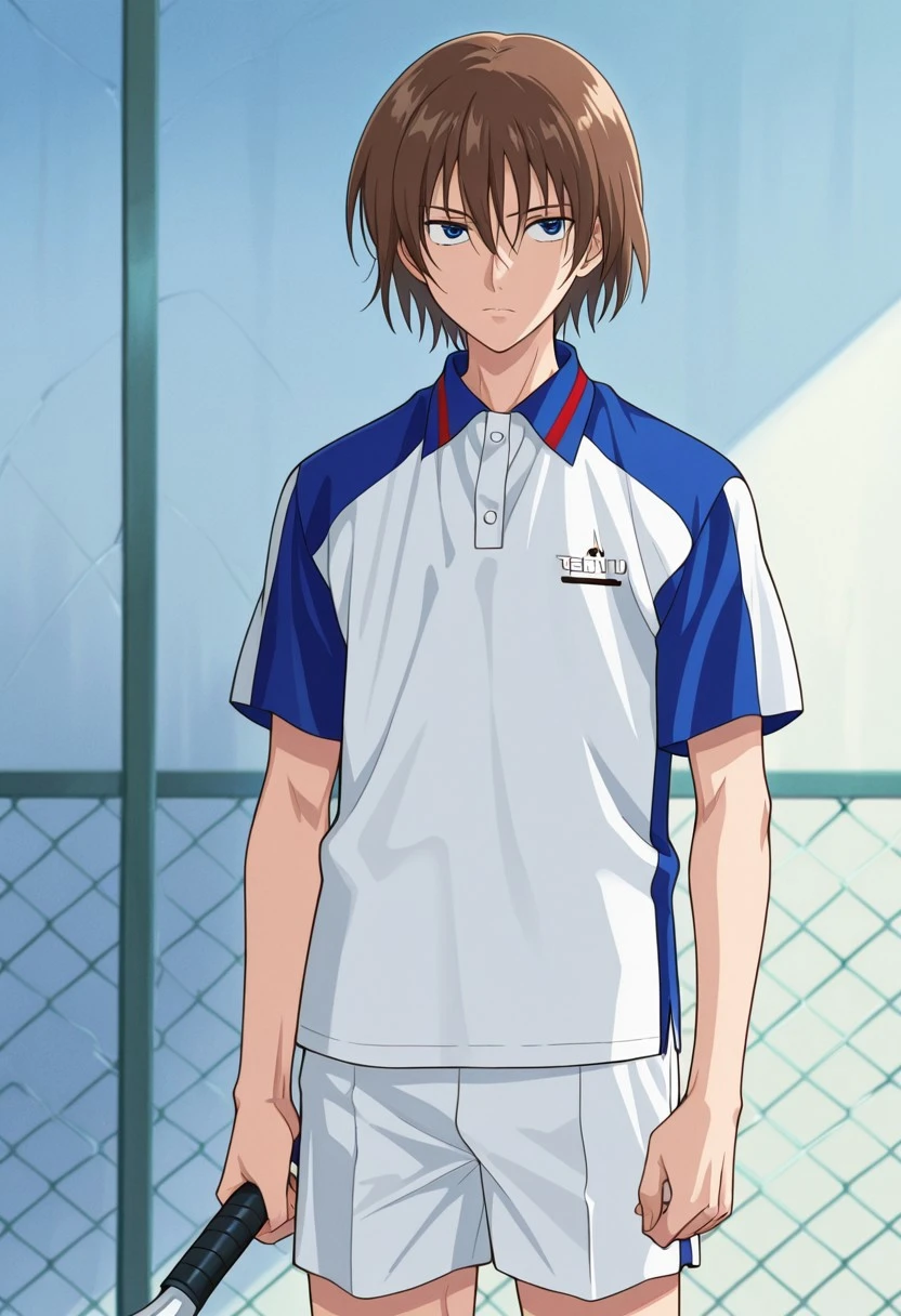 shusuke, 1boy, male focus, solo, brown hair, hair between eyes, blue eyes, tennis uniform, white shirt, blue shirt, short sleeves, shorts, white shorts, socks, white socks, shoes, sneakers,