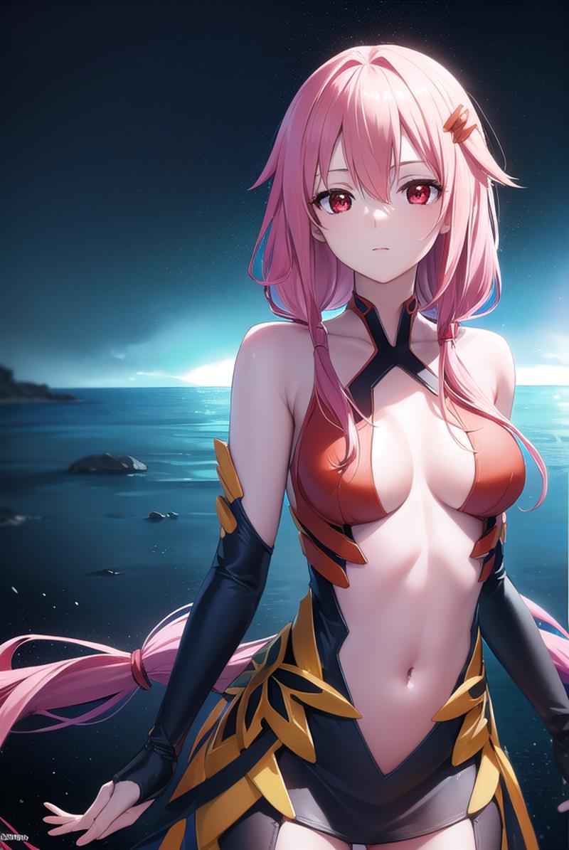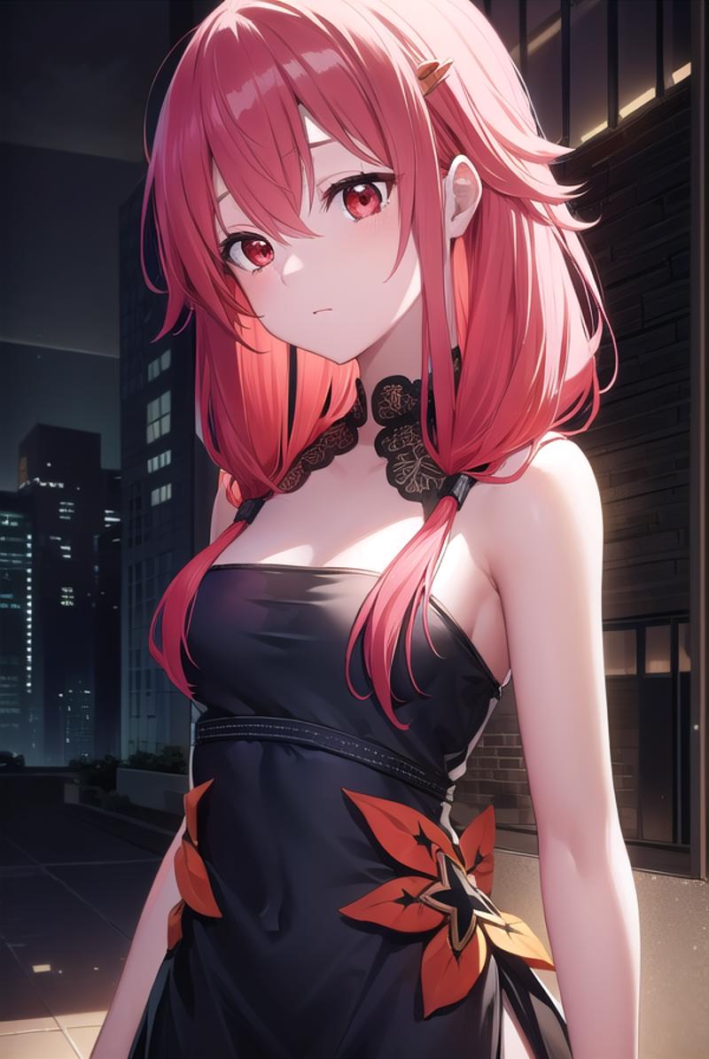 inori yuzuriha, hair ornament, hairclip, long hair, pink hair, (red eyes:1.5), twintails,