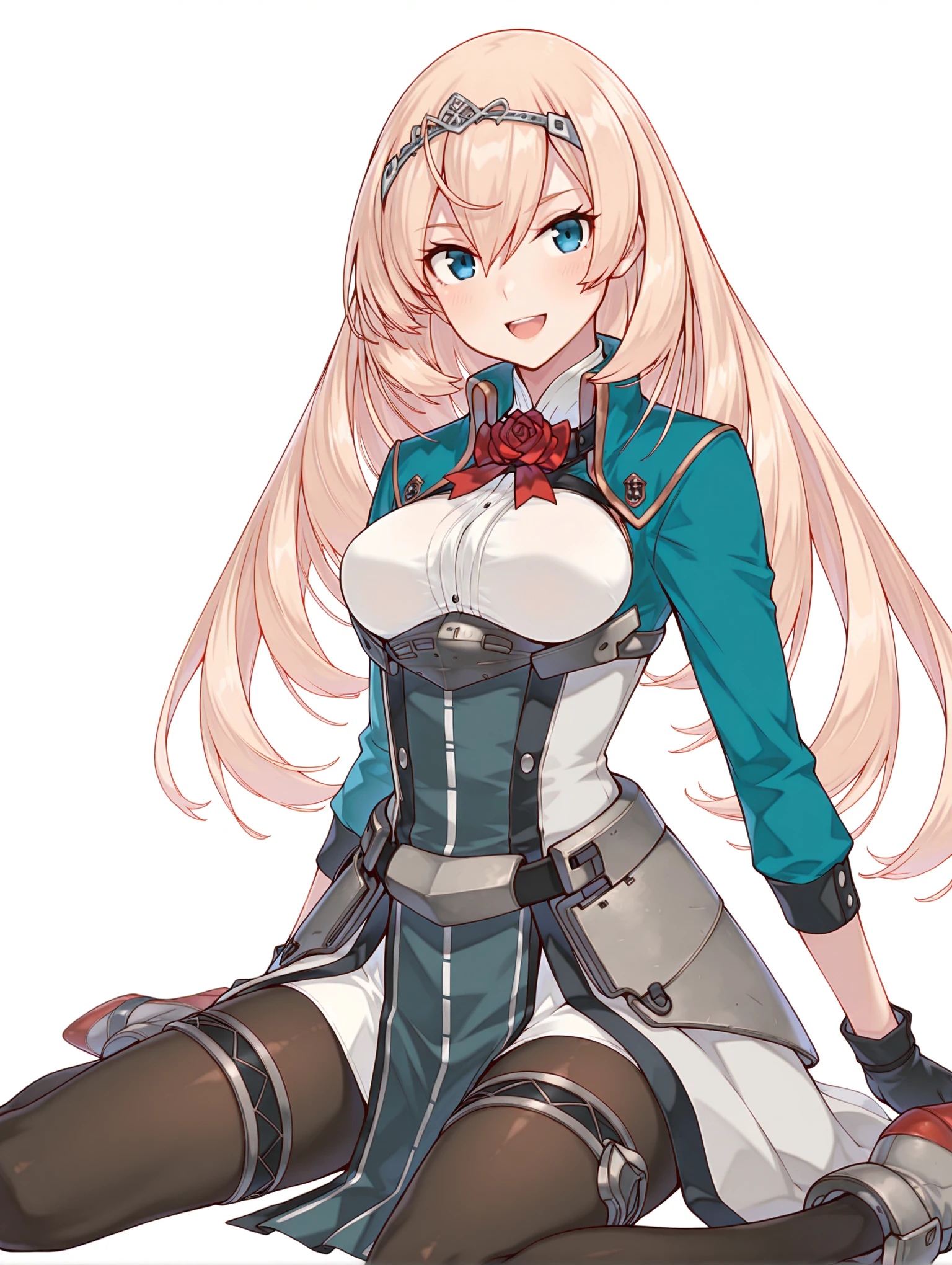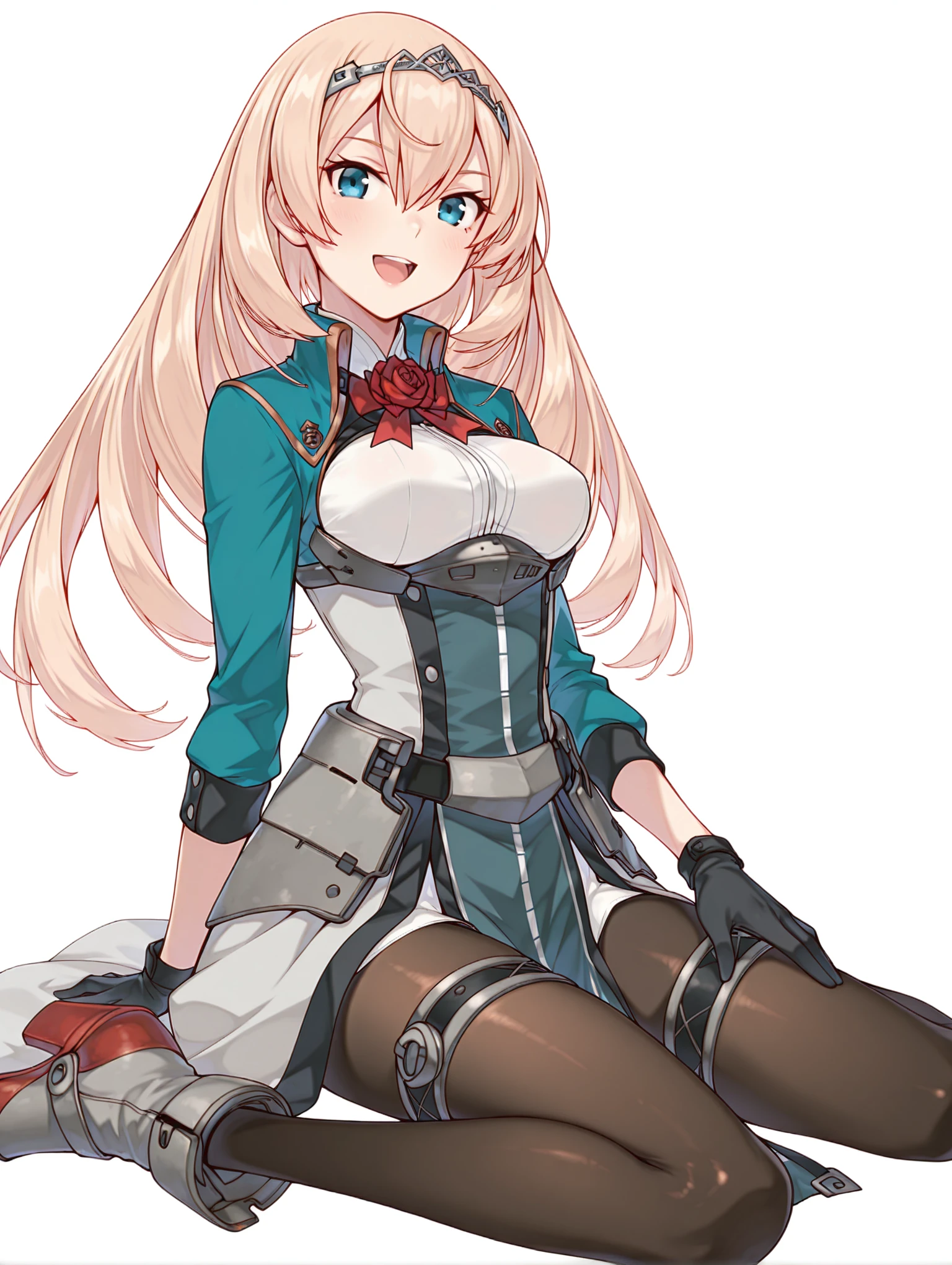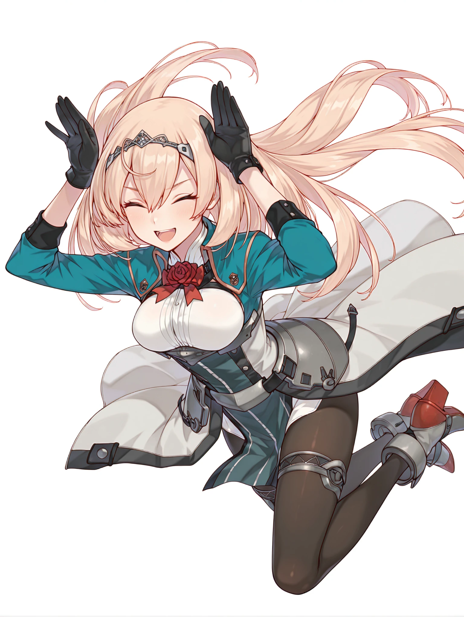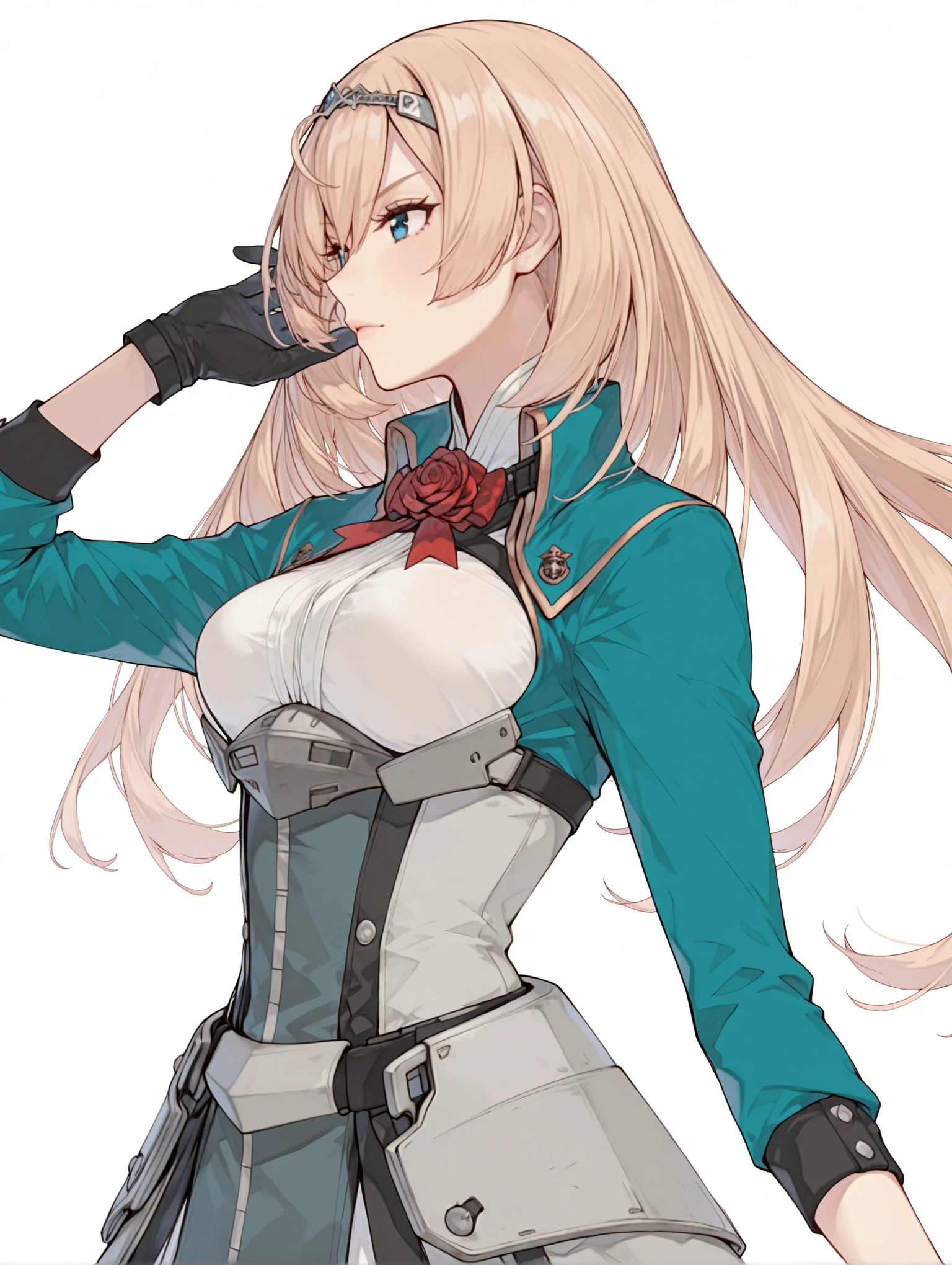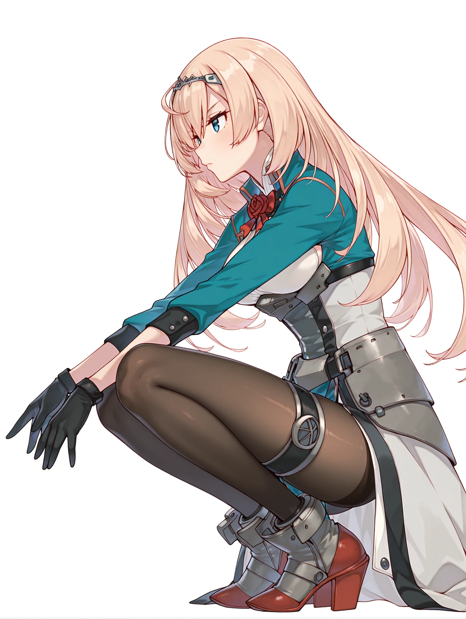 v_clothes,red rose,green jacket,white shirt,long sleeves,black gloves,waist armor,overskirt,pelvic curtain,black_pantyhose,rudder footwear,