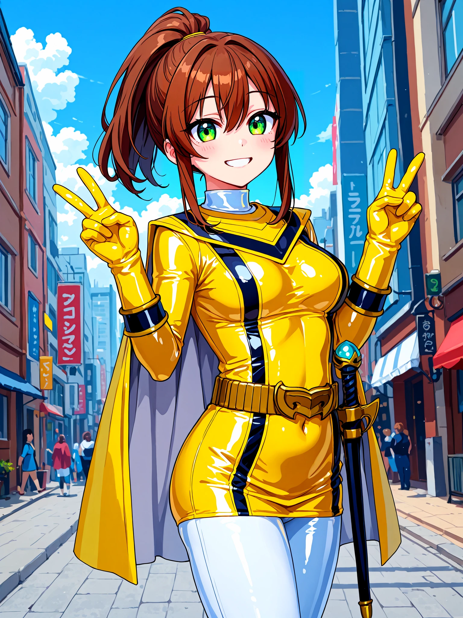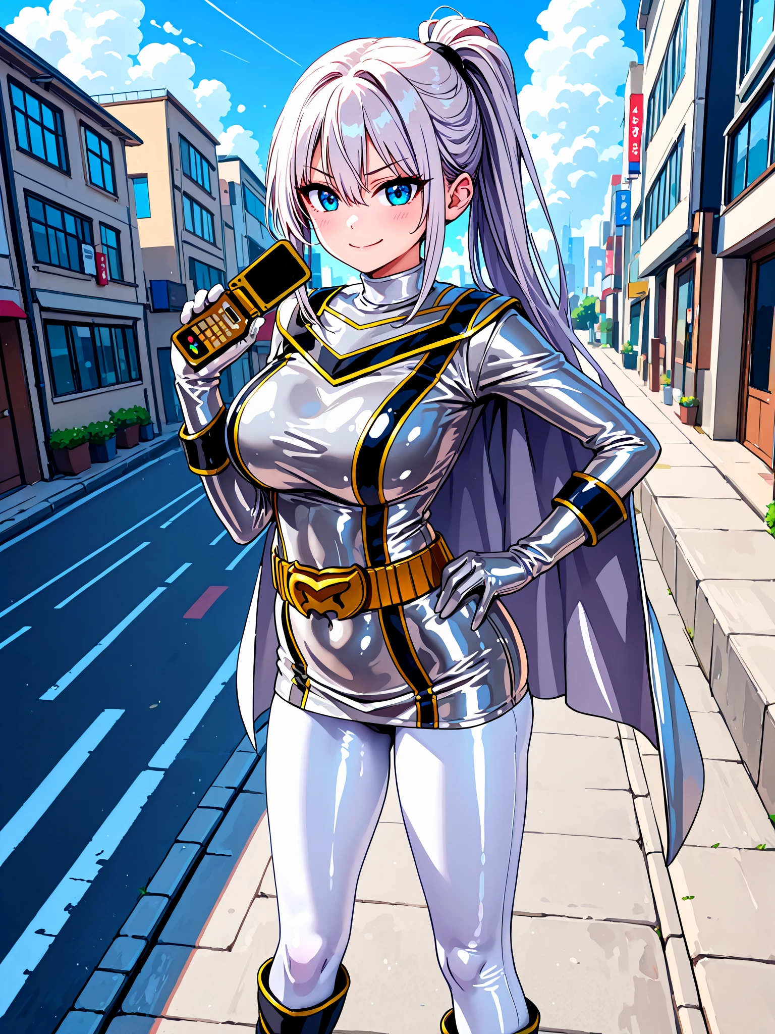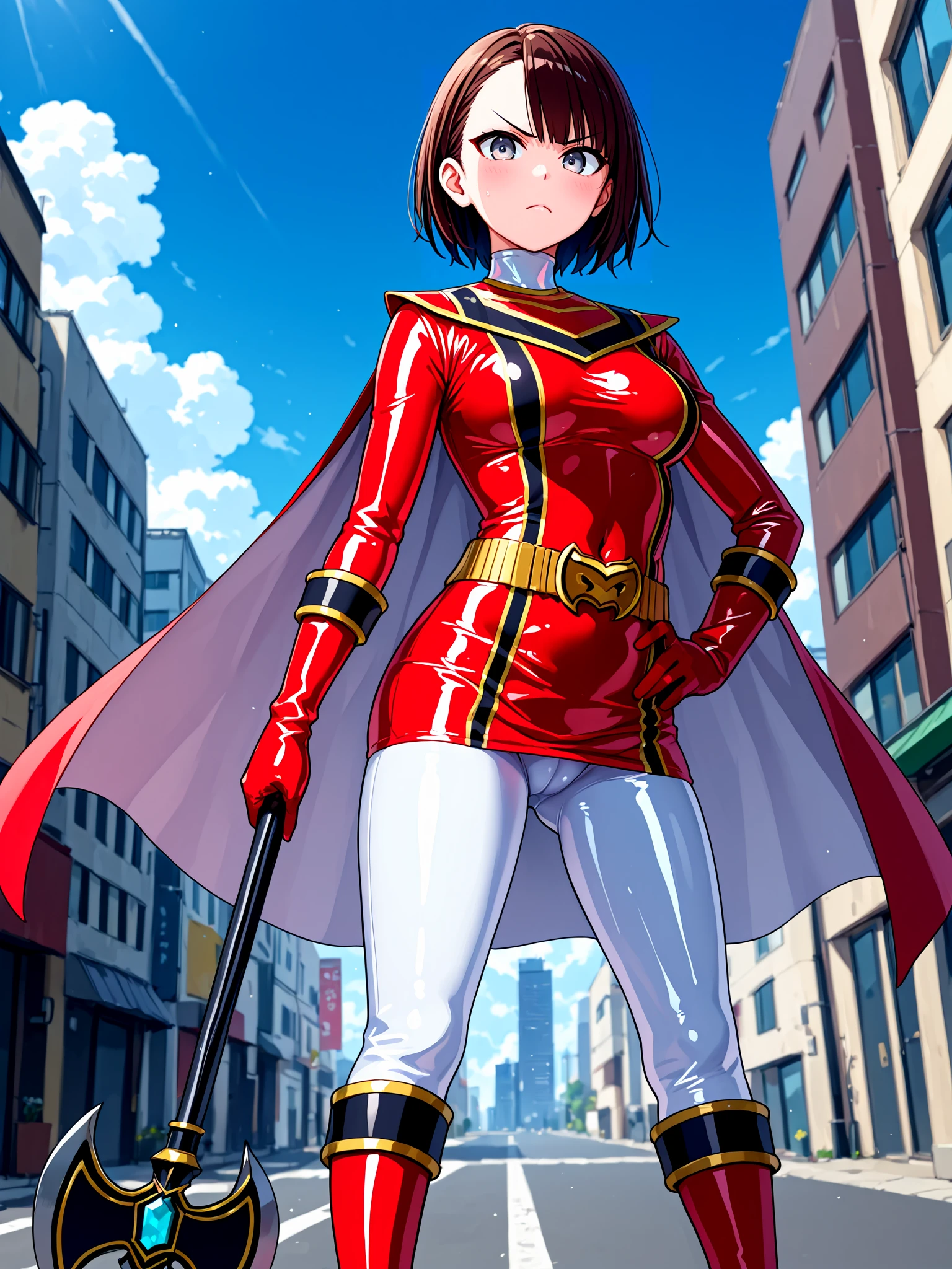 mag1rang3r, spandex, shiny clothes, white neck, covered neck, [color] mantle, [color] cape with white inner, [color] and black dress with gold trim, long sleeves, [color] and black gloves with gold trim, gold belt, white pantyhose