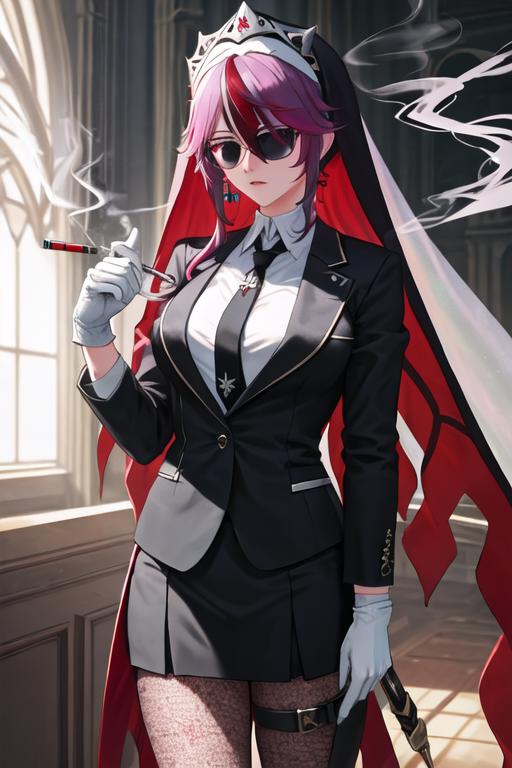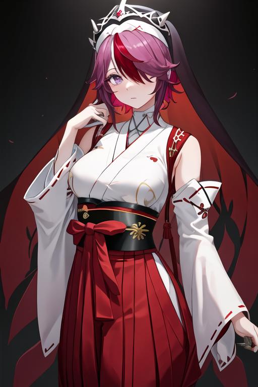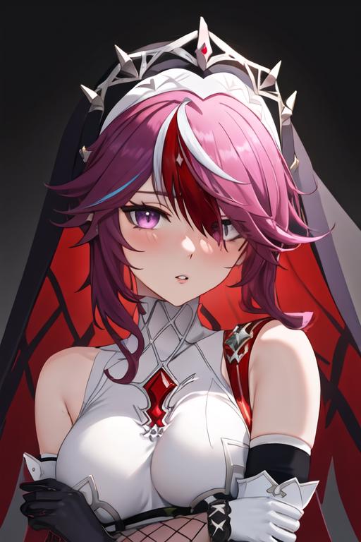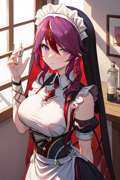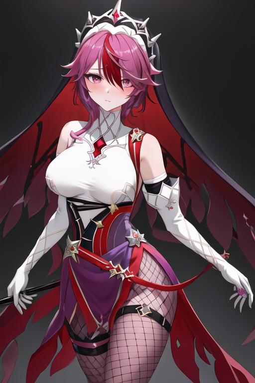 The trigger word is rosaria_genshin, and the recommended tags are best quality, masterpiece, highres, solo, {rosaria_genshin:1.15}, purple_hair, red_hair, short_hair, nun, breasts, large_breasts, bangs, veil, purple_eyes, habit, multicolored_hair, streaked_hair, hair_between_eyes, fishnets, hair_over_one_eye.