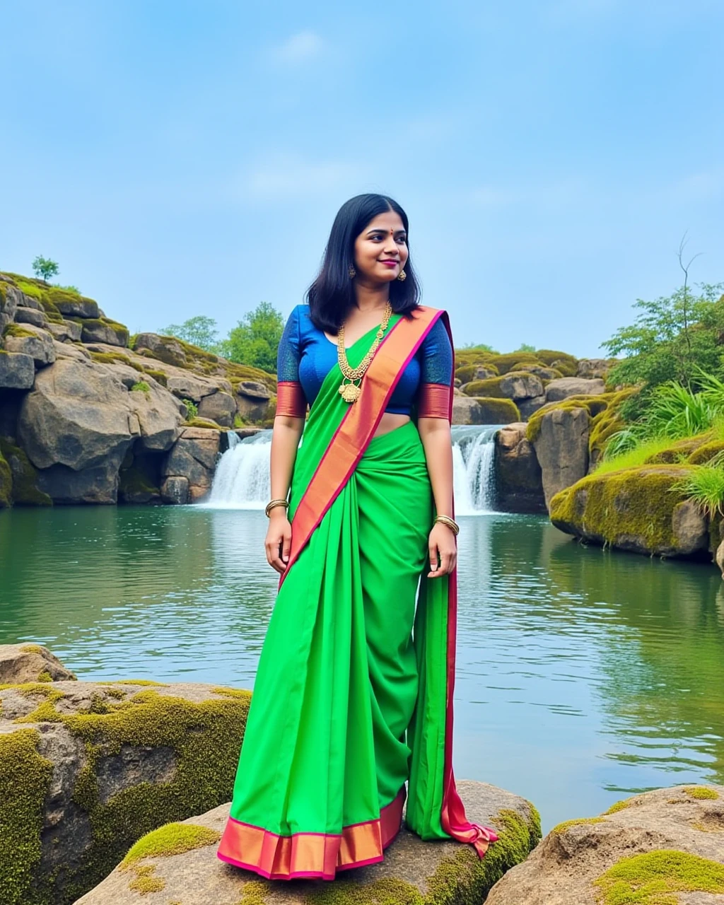 She is wearing a blouse with designer border and a colorful saree with designer border.