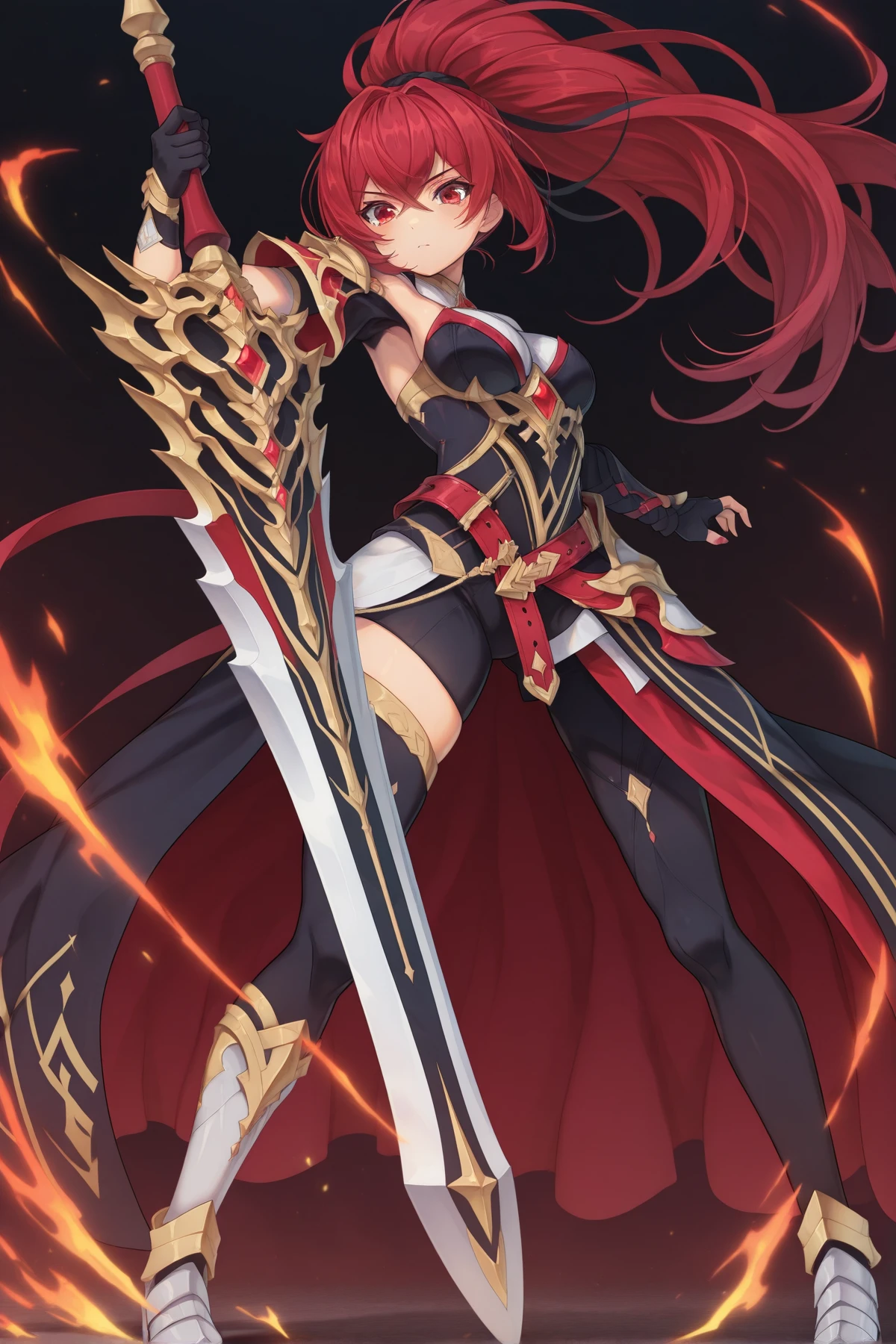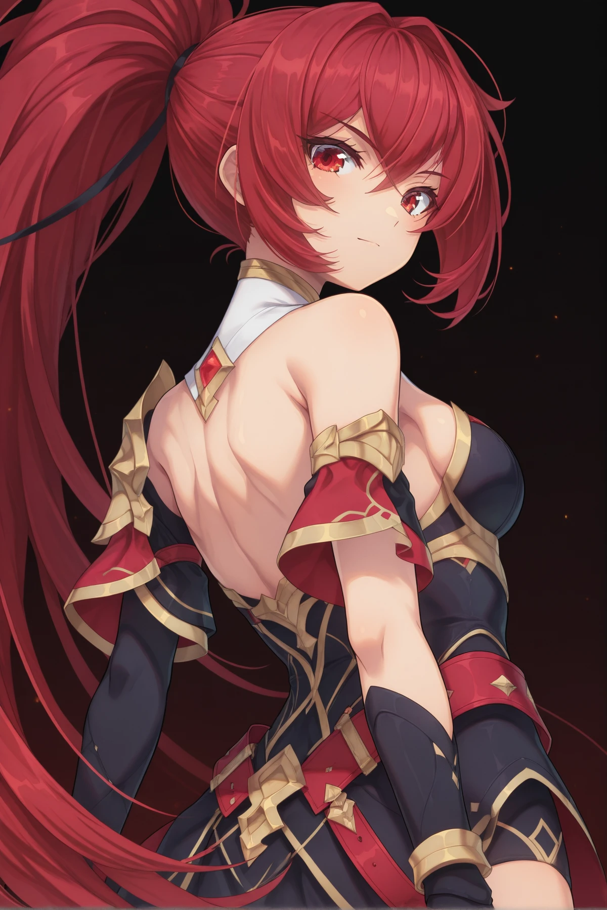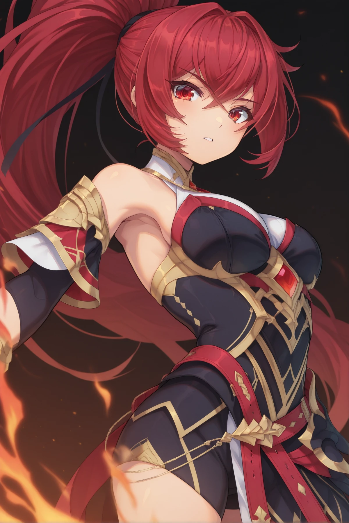 red eyes, red hair, long hair, ponytail, medium breasts, white neck dress, black dress, bare shoulders, detached short sleeves, black gloves, side waist cape, asymmetrical legwear, asymmetrical pantyhose, asymmetrical footwear, armored footwear